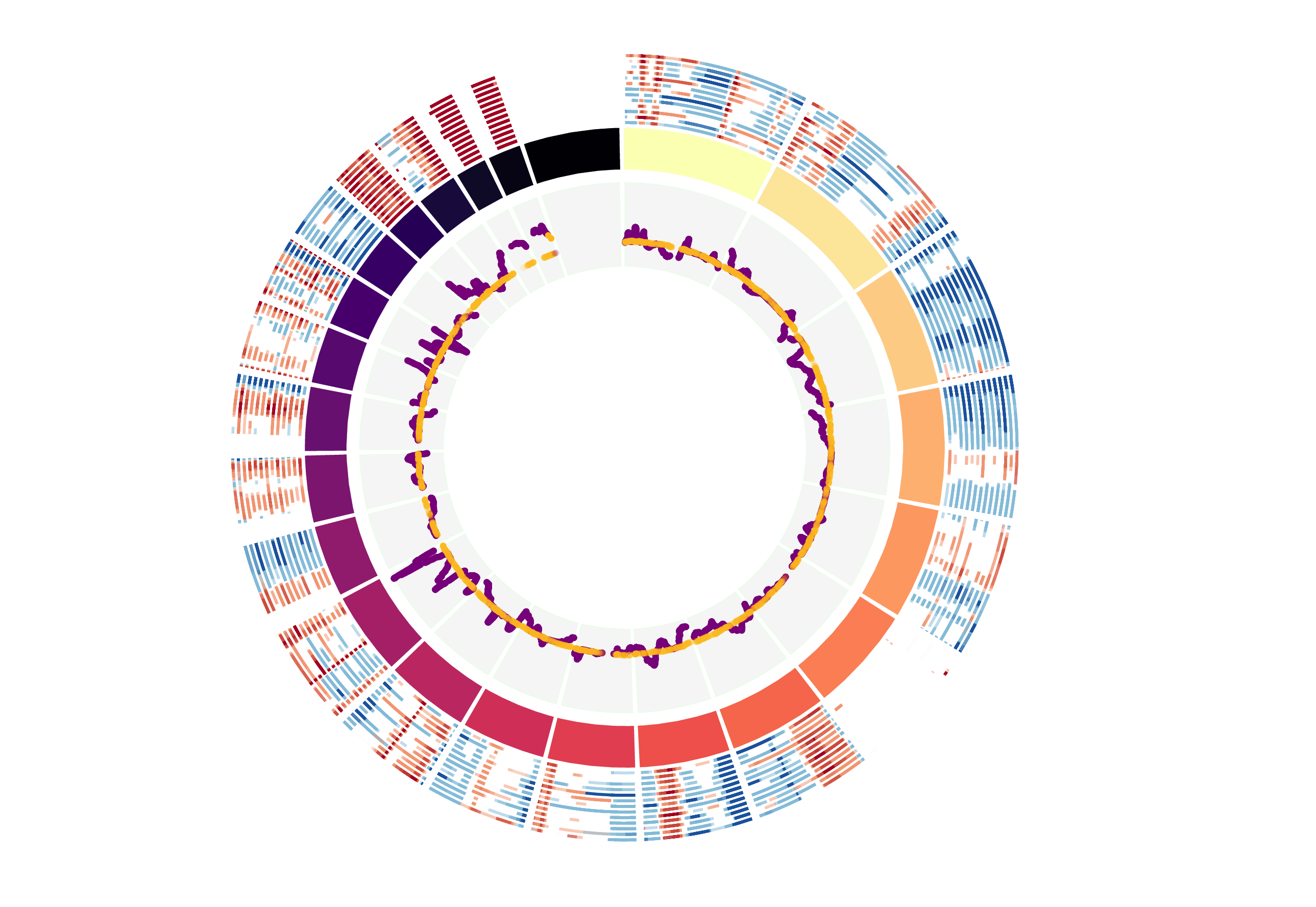 Outer tracks are putative CNV regions (gains = red, losses = blue) for each patient