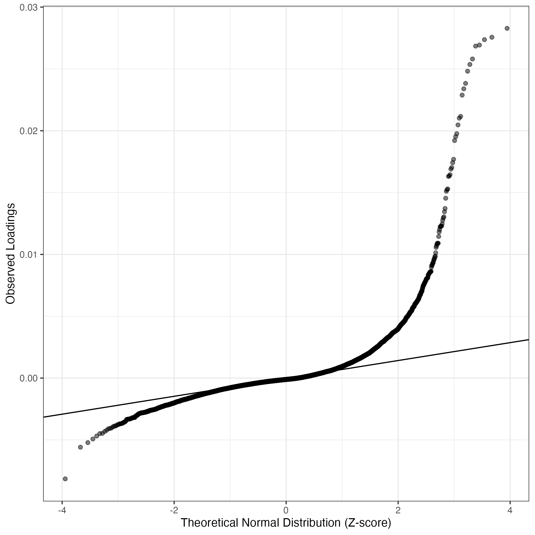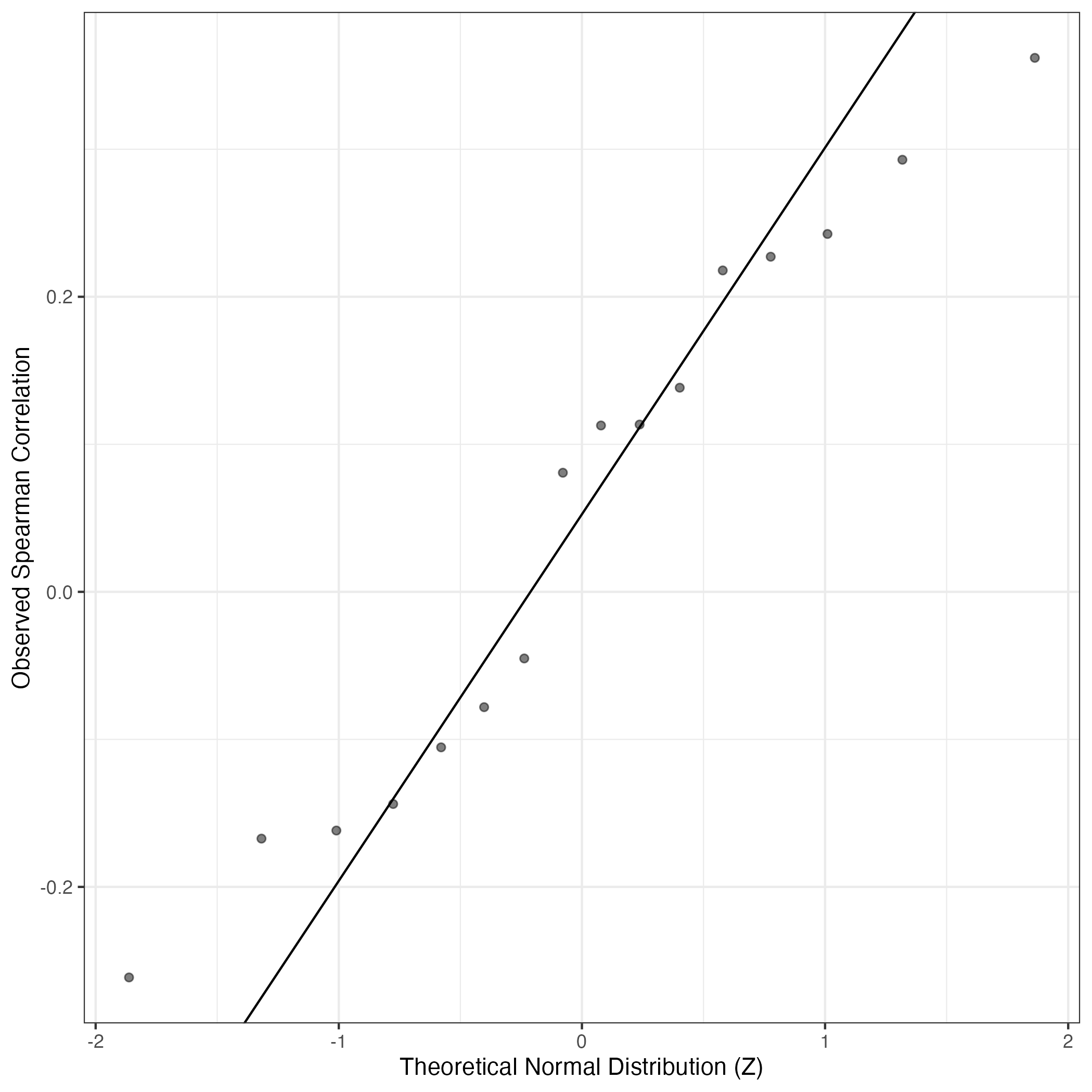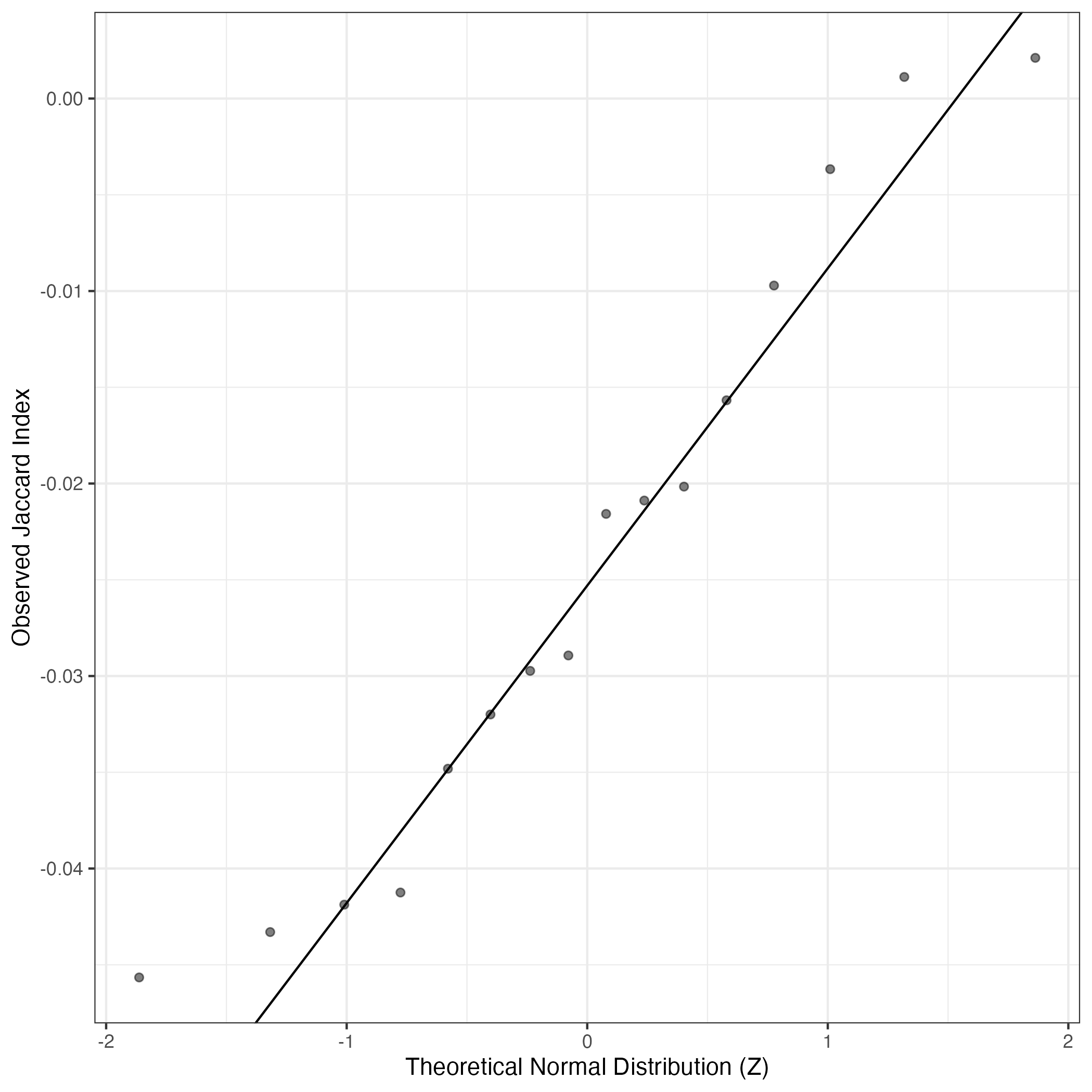 A similar QQ-plot as above, but only for instances where the H value is e.g. > 25, i.e. we are confident that the expression program is active above noise. Agreemenet between these binary vectors is tested using the Jaccard Index, with the P-values calculated by an exact test: