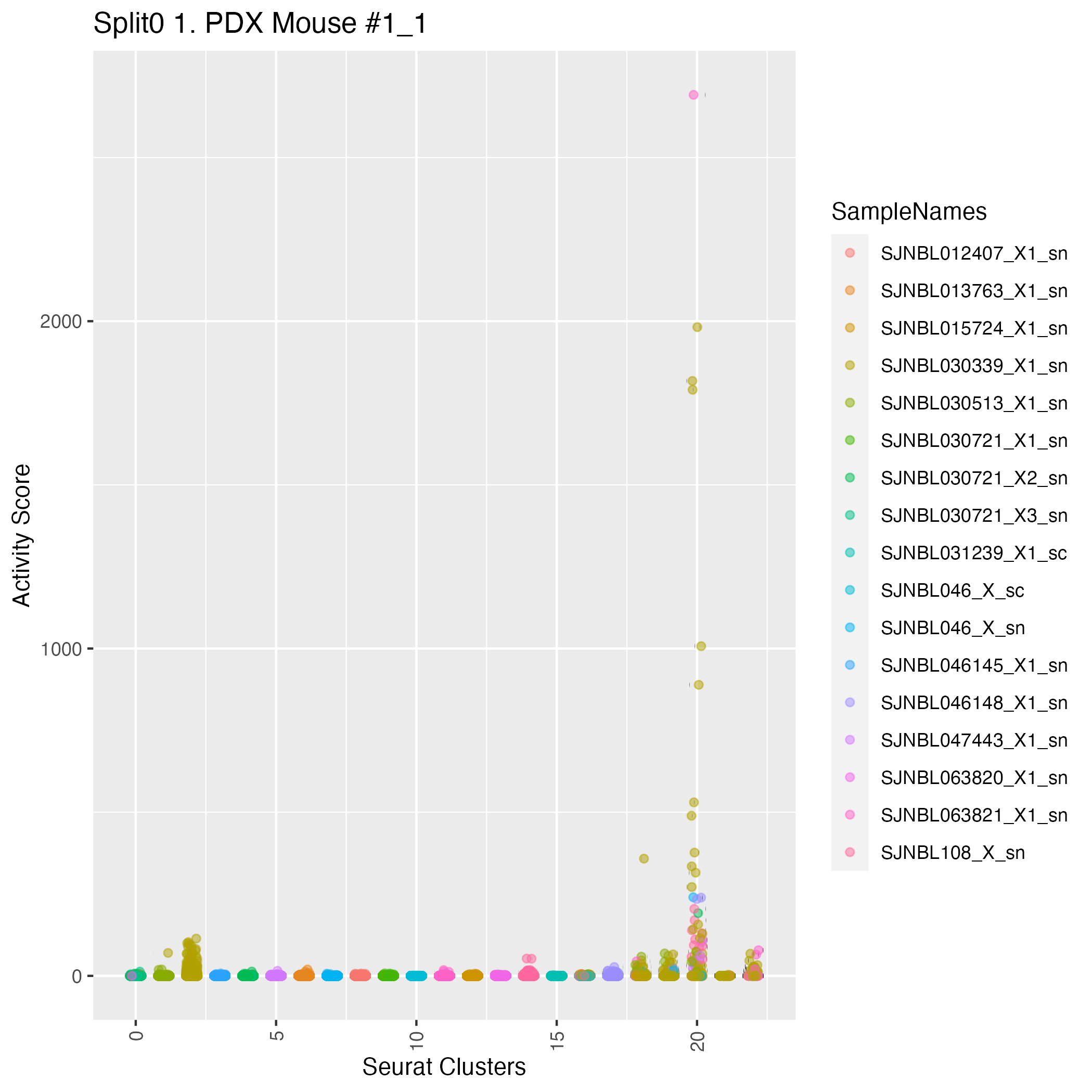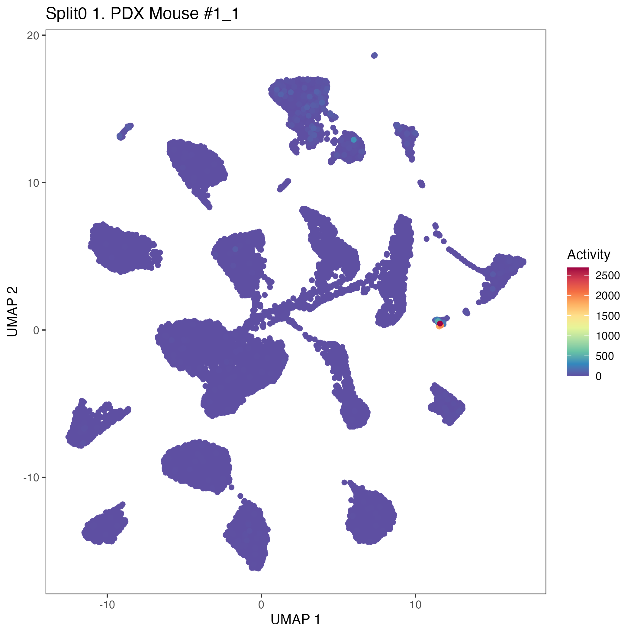 SCPs neuroblastoma unique (Olsen) Similar to above, but for genes unique to neuroblastoma SCP-like cells. Note FN1 is often used as a mesenchymal marker gene.: Wilcoxon ranksum test P-value for gene set overrepresentation: 7.71e-01 Mean rank of genes in gene set: 7371.33 Rank on gene expression program of genes in gene set: