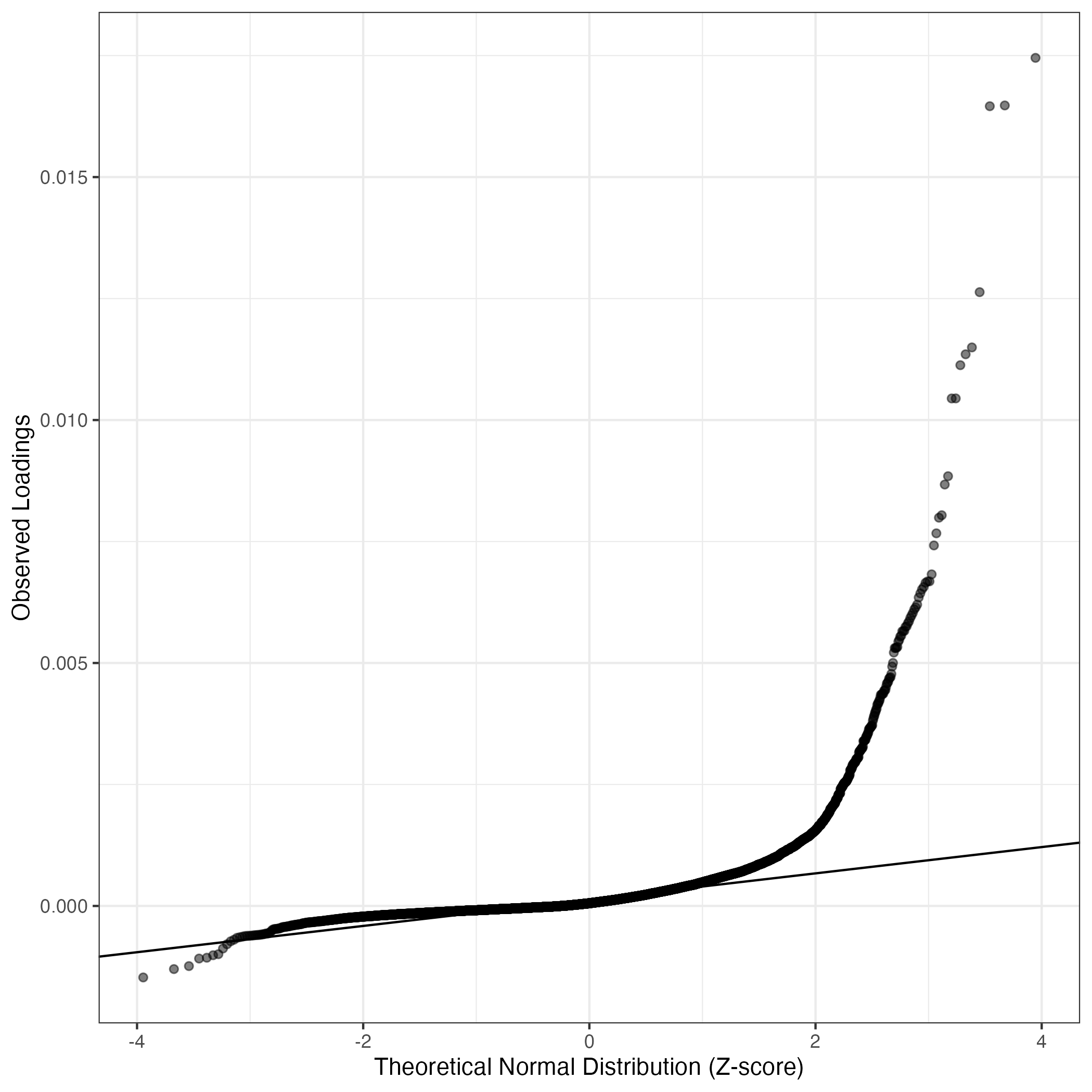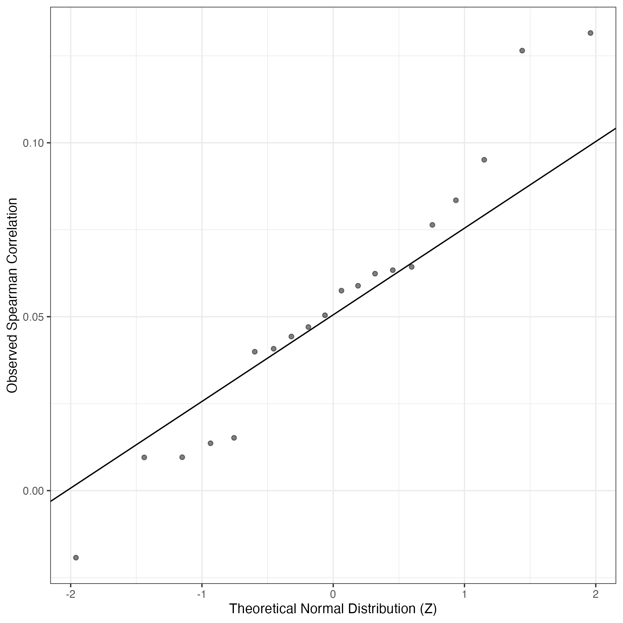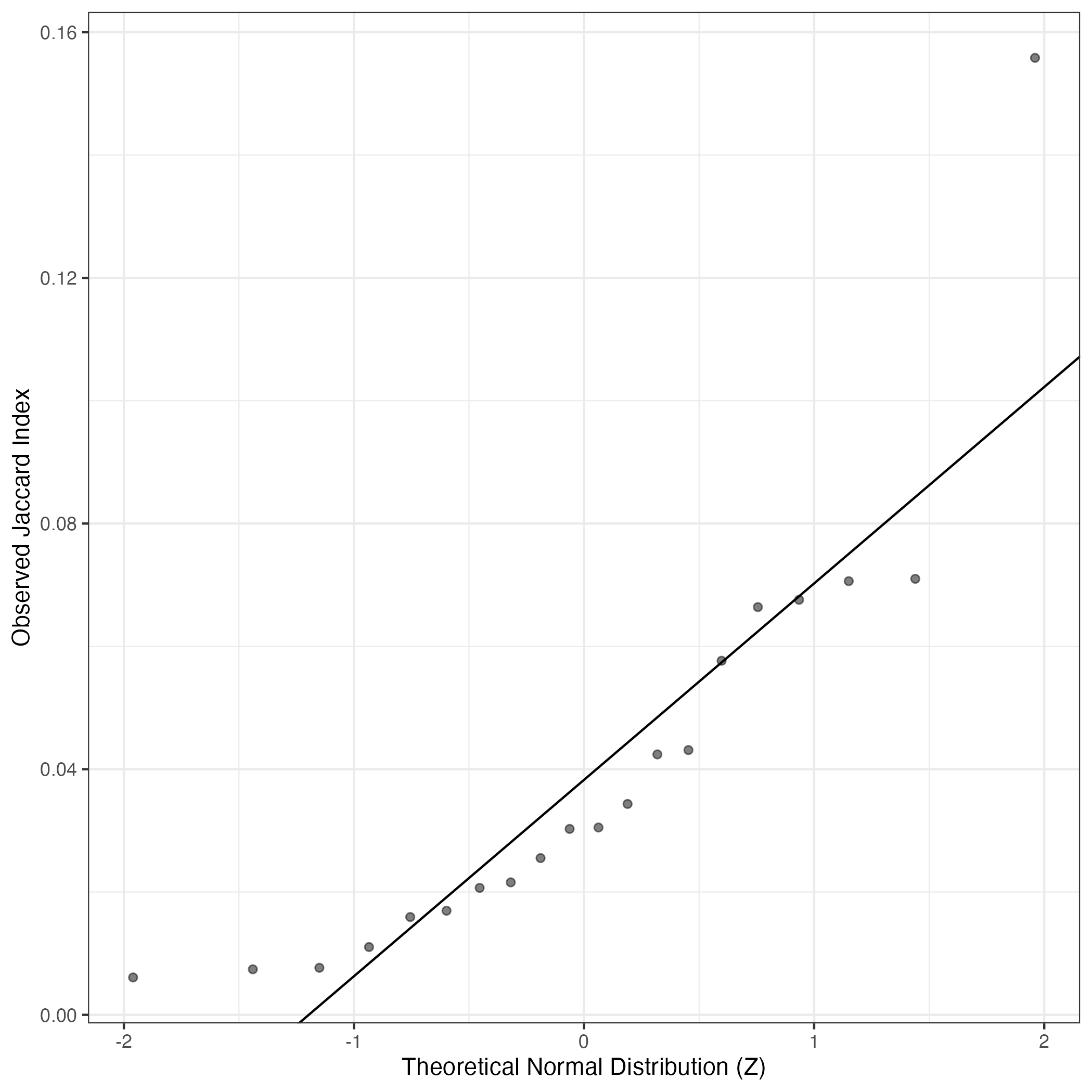 A similar QQ-plot as above, but only for instances where the H value is e.g. > 25, i.e. we are confident that the expression program is active above noise. Agreemenet between these binary vectors is tested using the Jaccard Index, with the P-values calculated by an exact test: