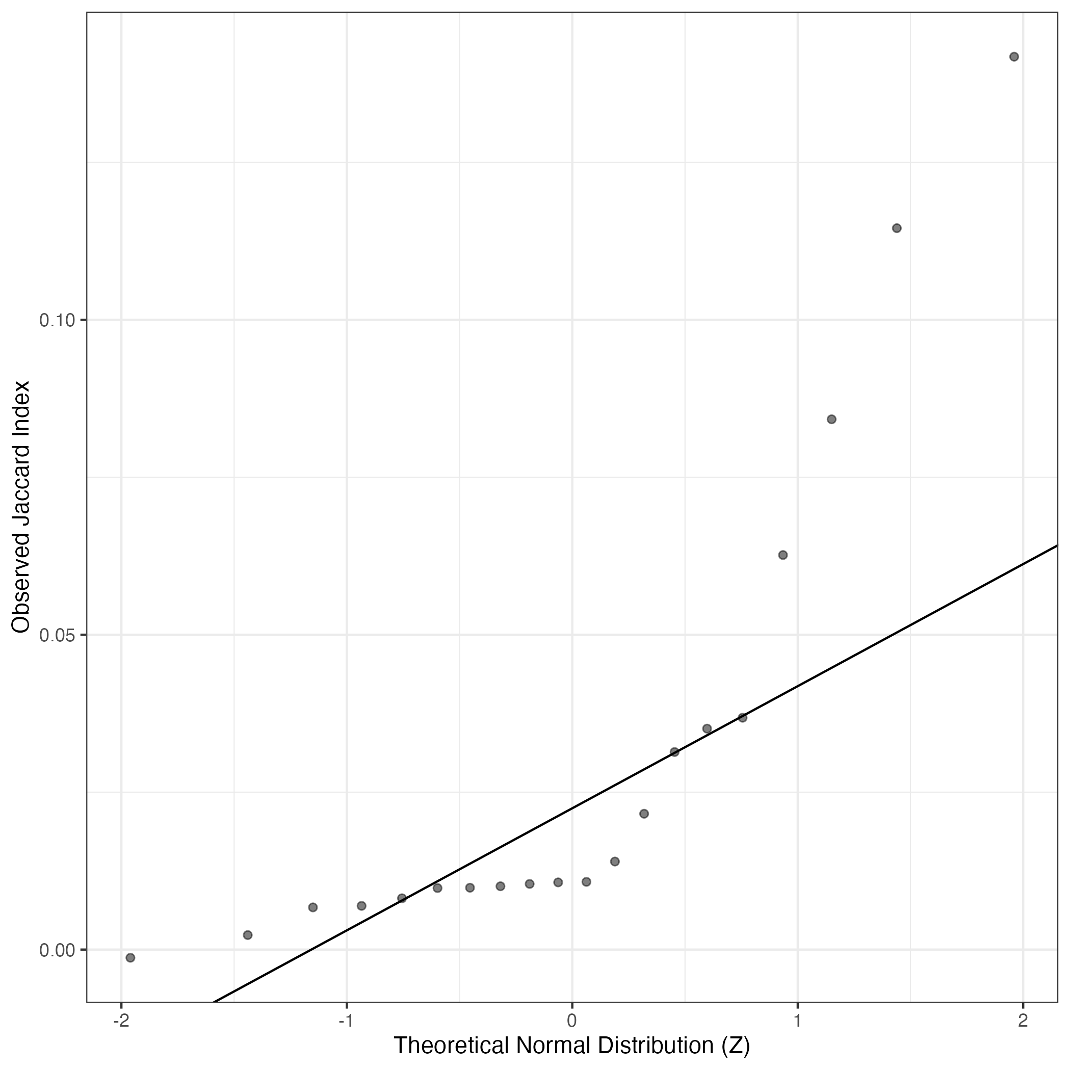 A similar QQ-plot as above, but only for instances where the H value is e.g. > 25, i.e. we are confident that the expression program is active above noise. Agreemenet between these binary vectors is tested using the Jaccard Index, with the P-values calculated by an exact test: