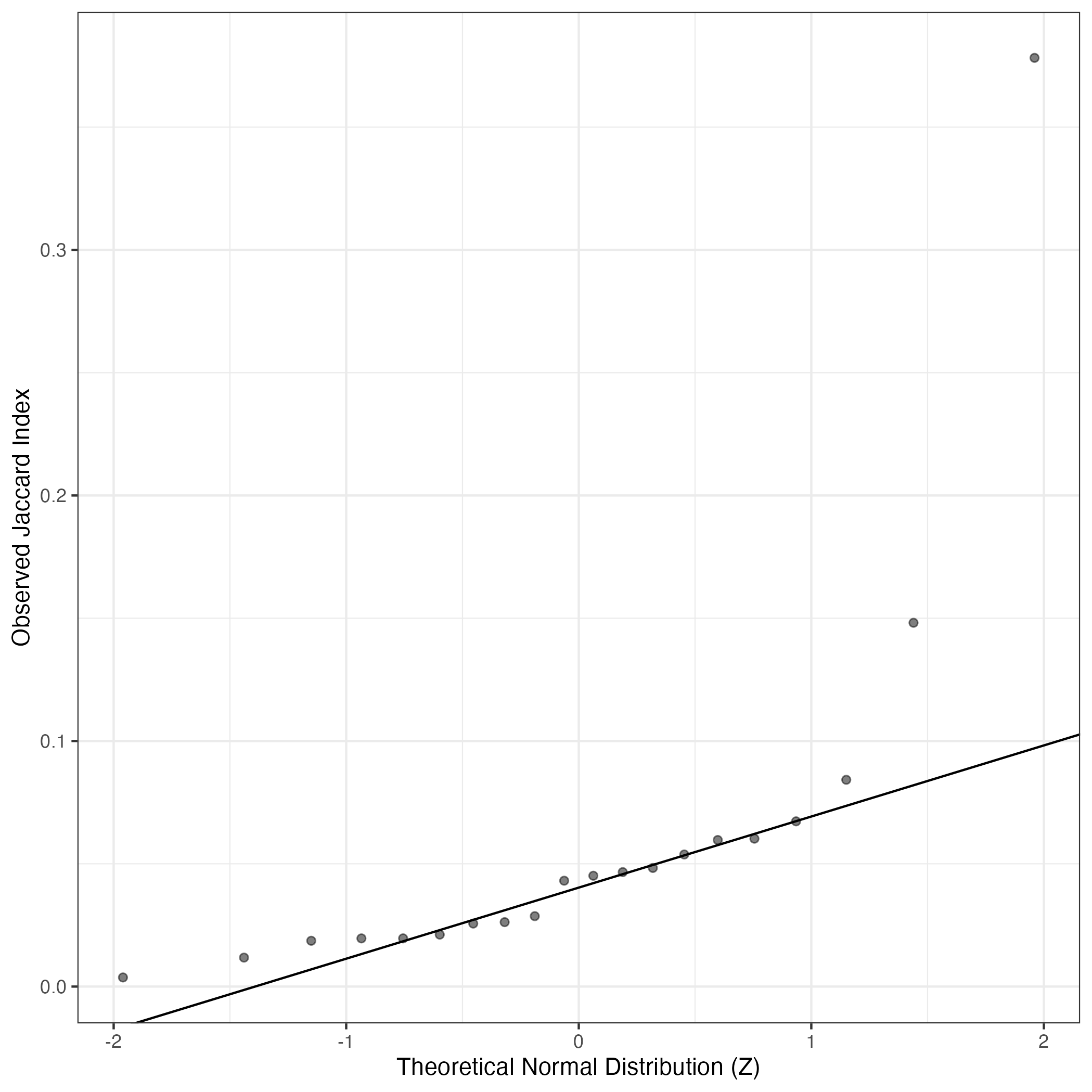 A similar QQ-plot as above, but only for instances where the H value is e.g. > 25, i.e. we are confident that the expression program is active above noise. Agreemenet between these binary vectors is tested using the Jaccard Index, with the P-values calculated by an exact test: