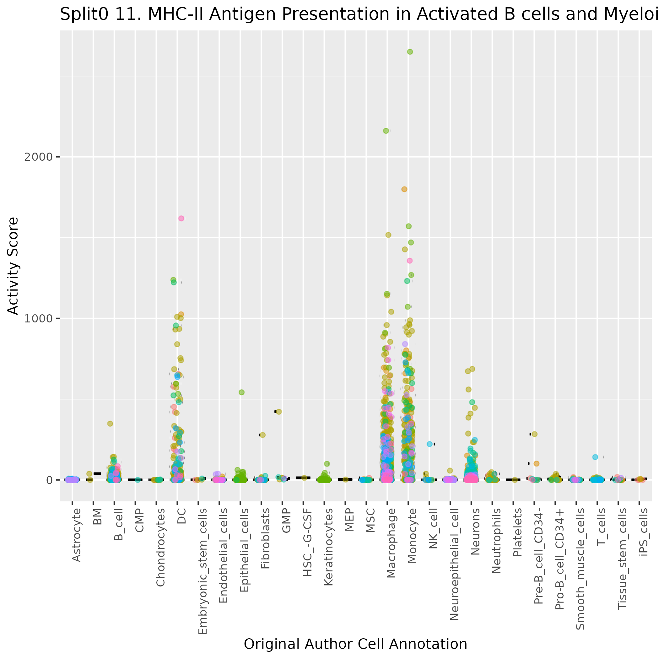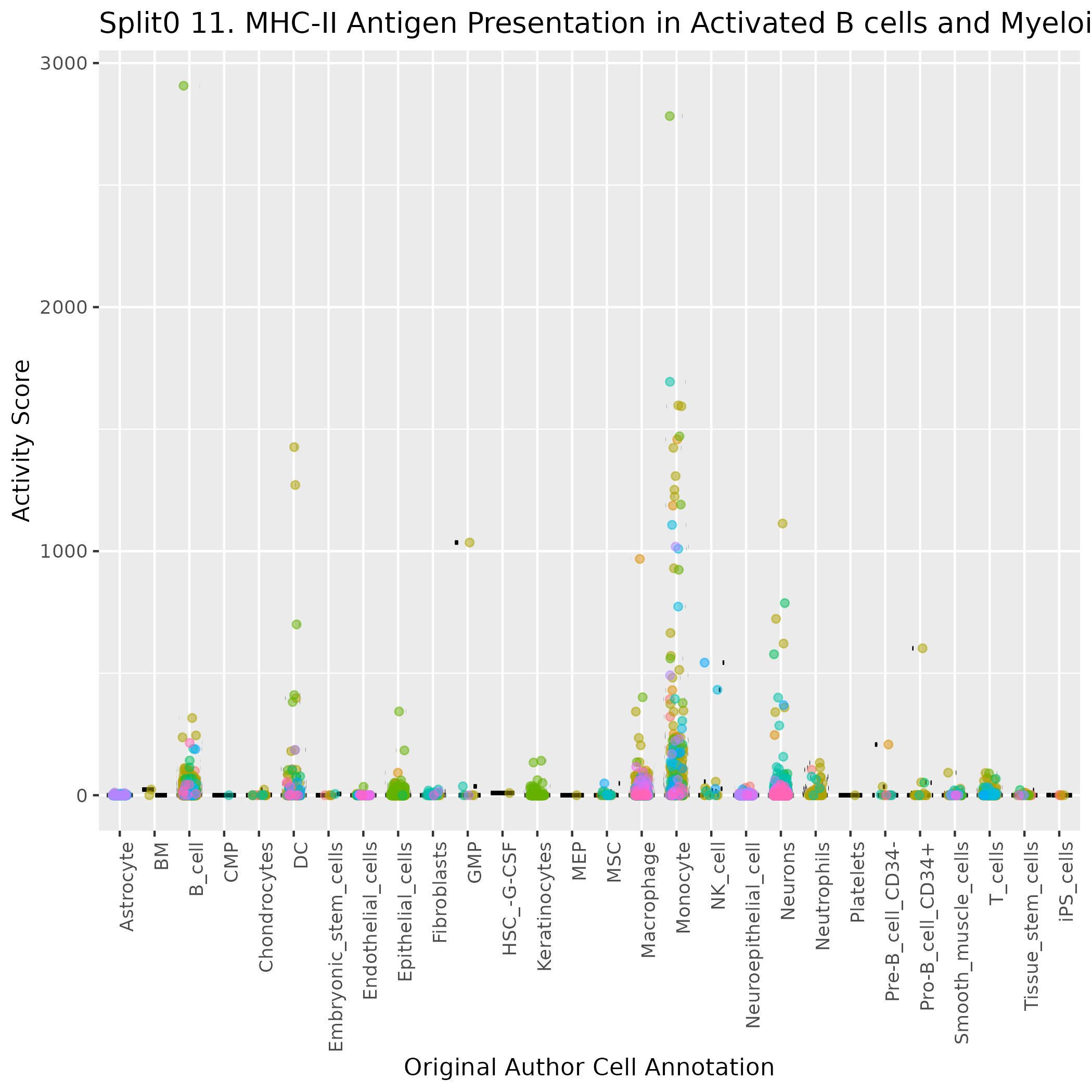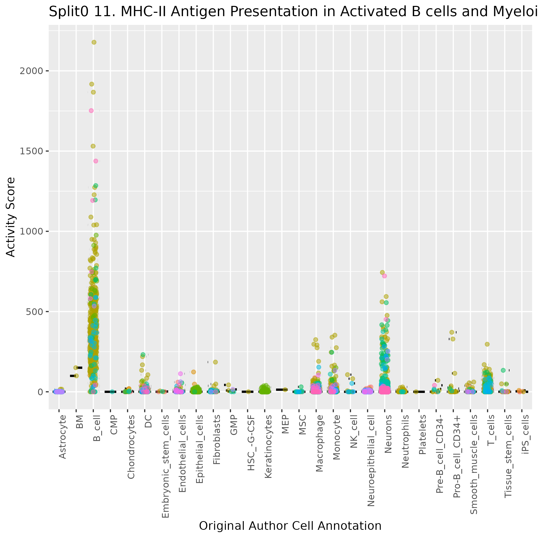 Boxlot showing activity of gene expression program identified in GEP 11. MHC-II Antigen Presentation in Activated B cells and Myeloid APCs (IFN--responsive):