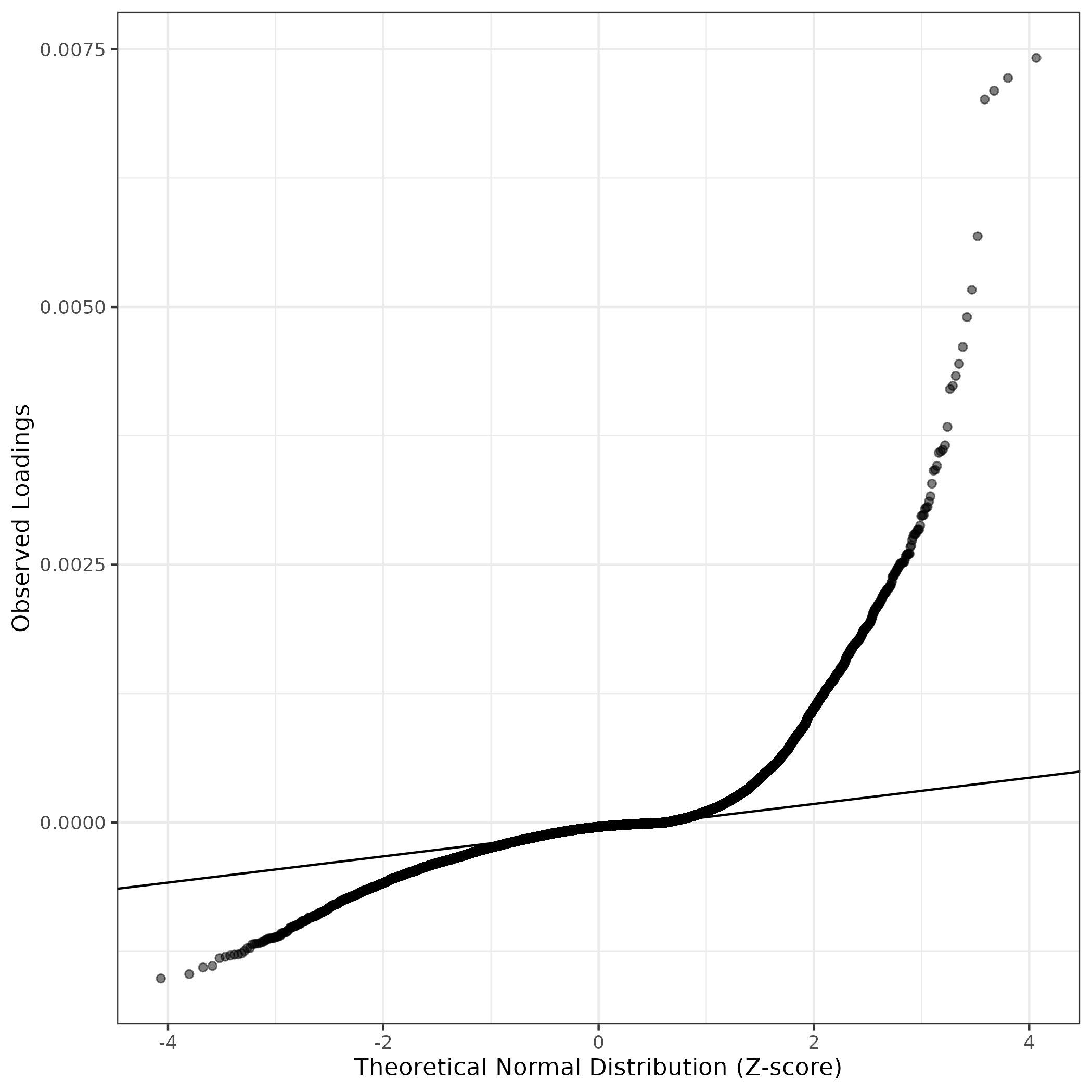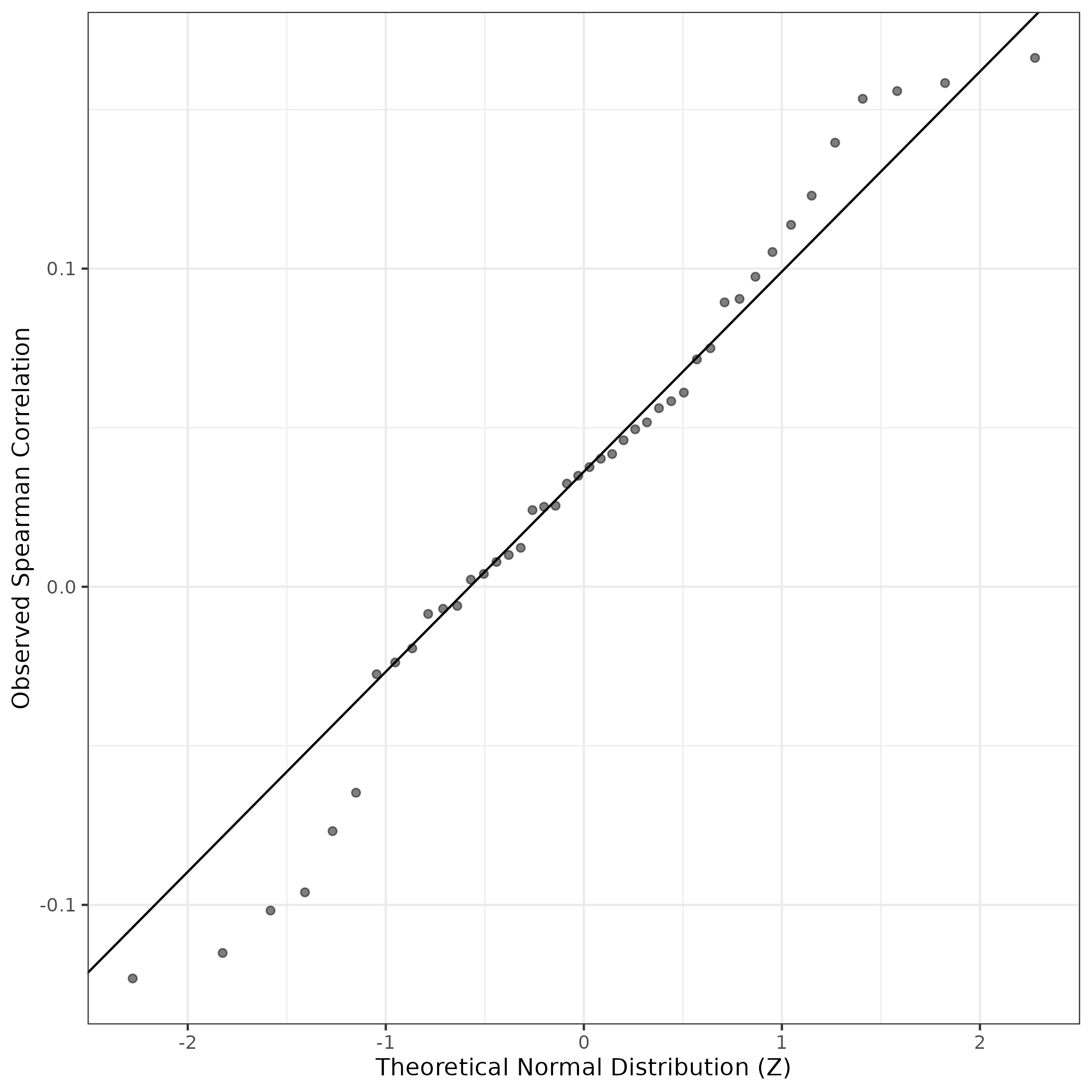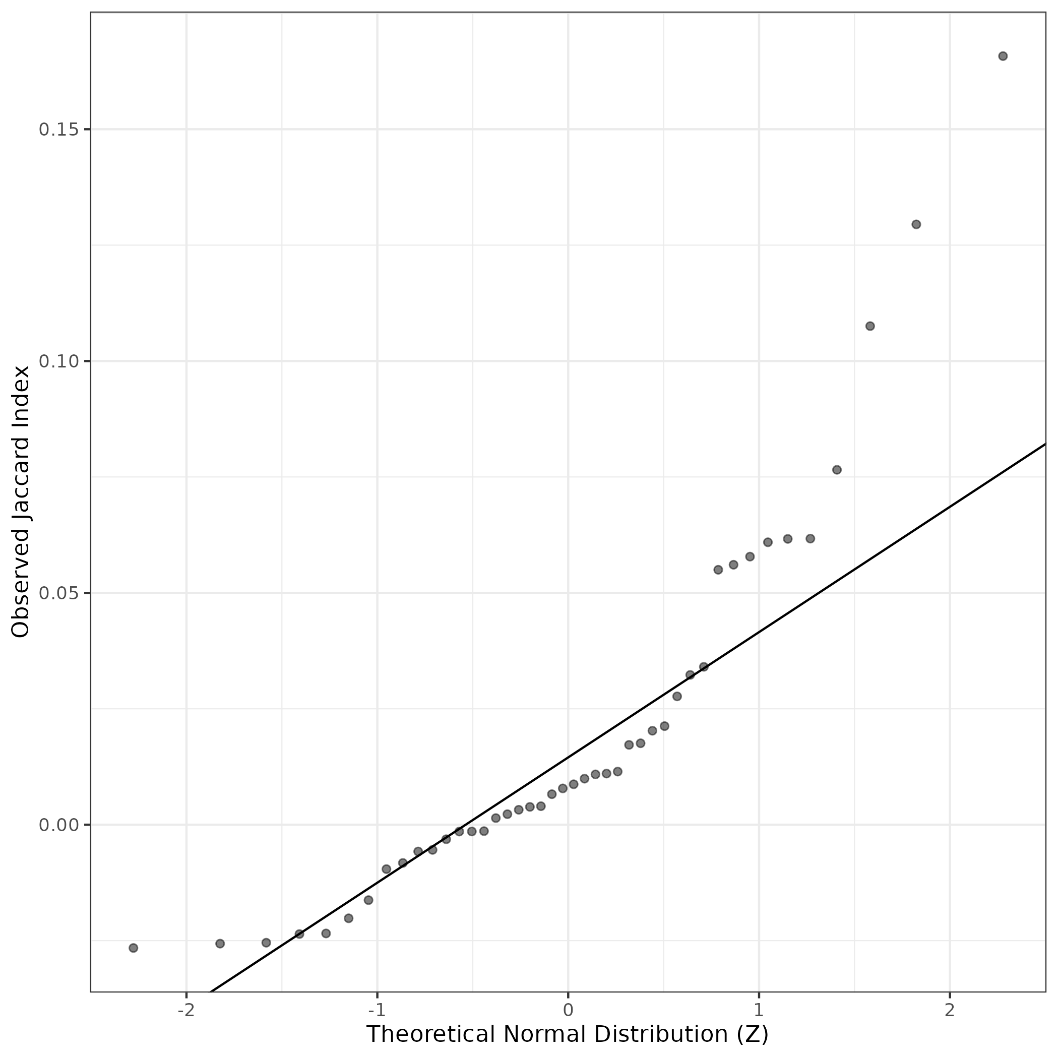 A similar QQ-plot as above, but only for instances where the H value is e.g. > 25, i.e. we are confident that the expression program is active above noise. Agreemenet between these binary vectors is tested using the Jaccard Index, with the P-values calculated by an exact test: