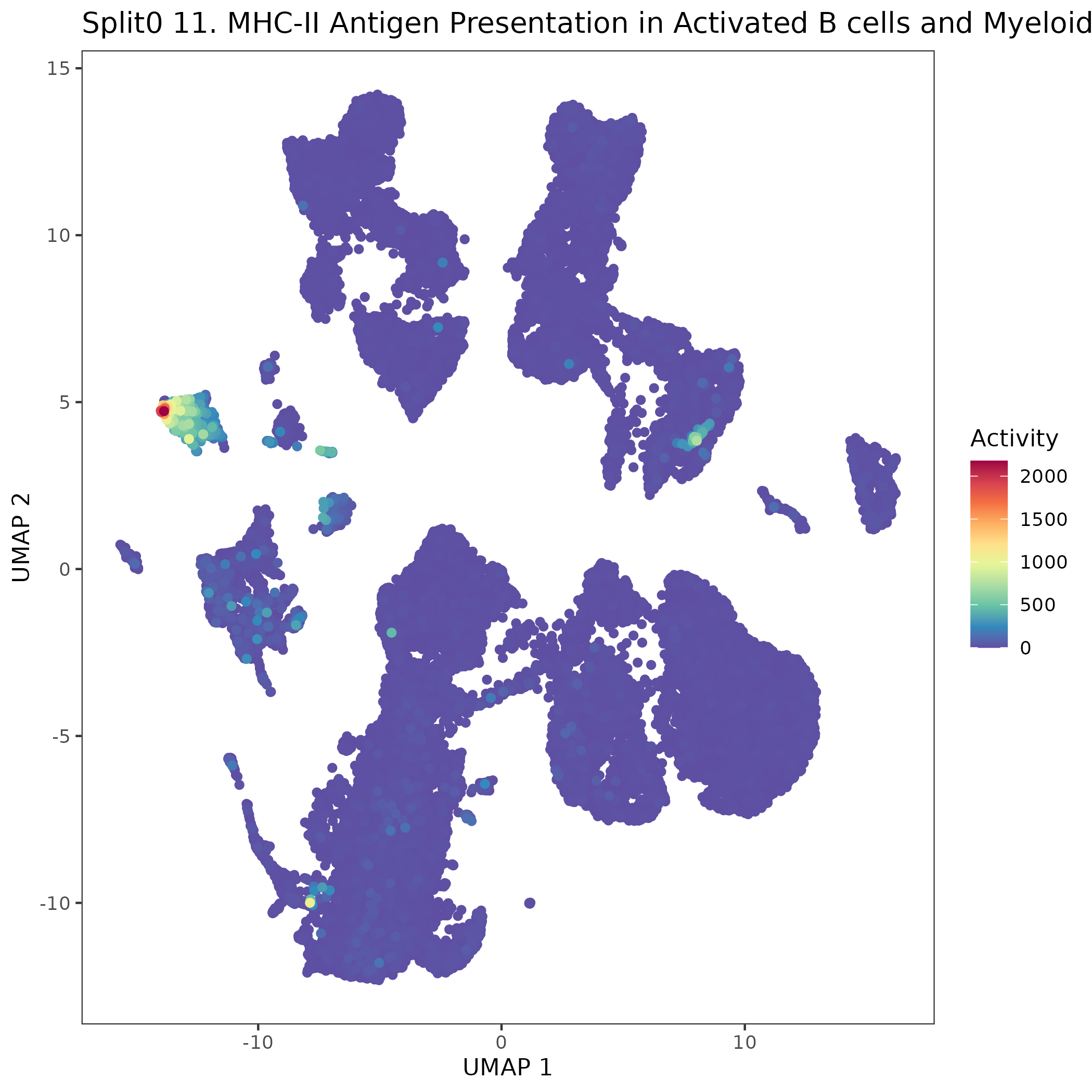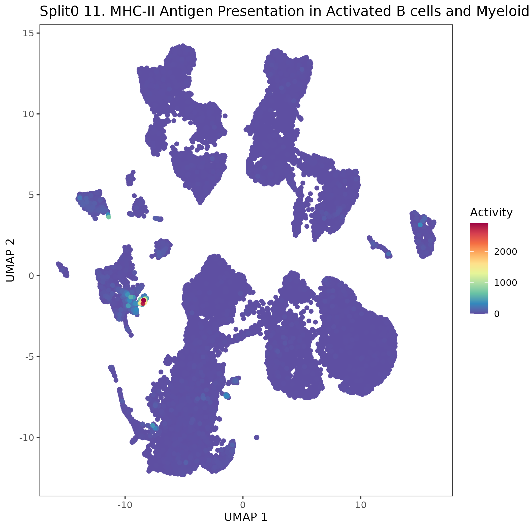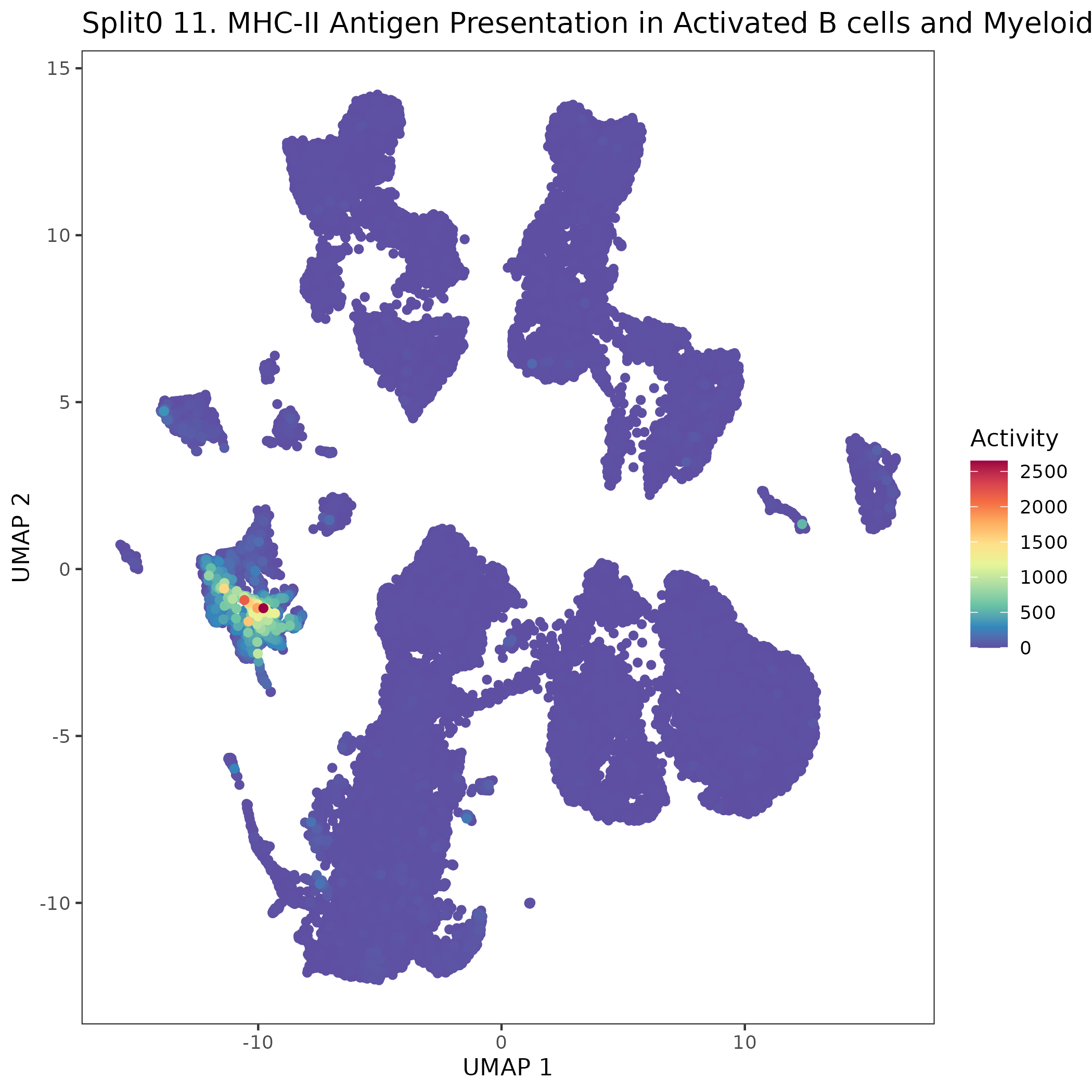 UMAP plots showing activity of gene expression program identified in GEP 11. MHC-II Antigen Presentation in Activated B cells and Myeloid APCs (IFN-<U+03B3>-responsive):