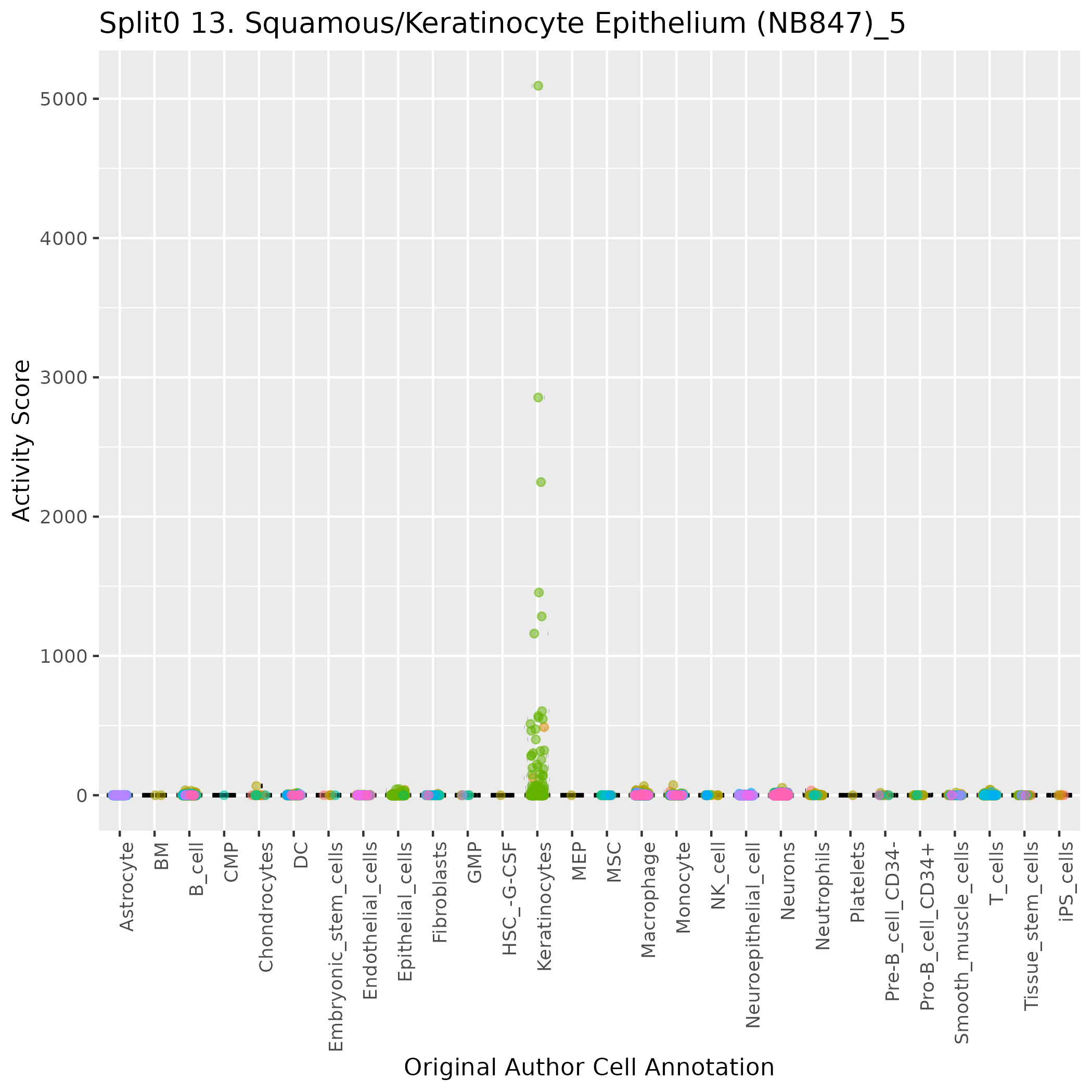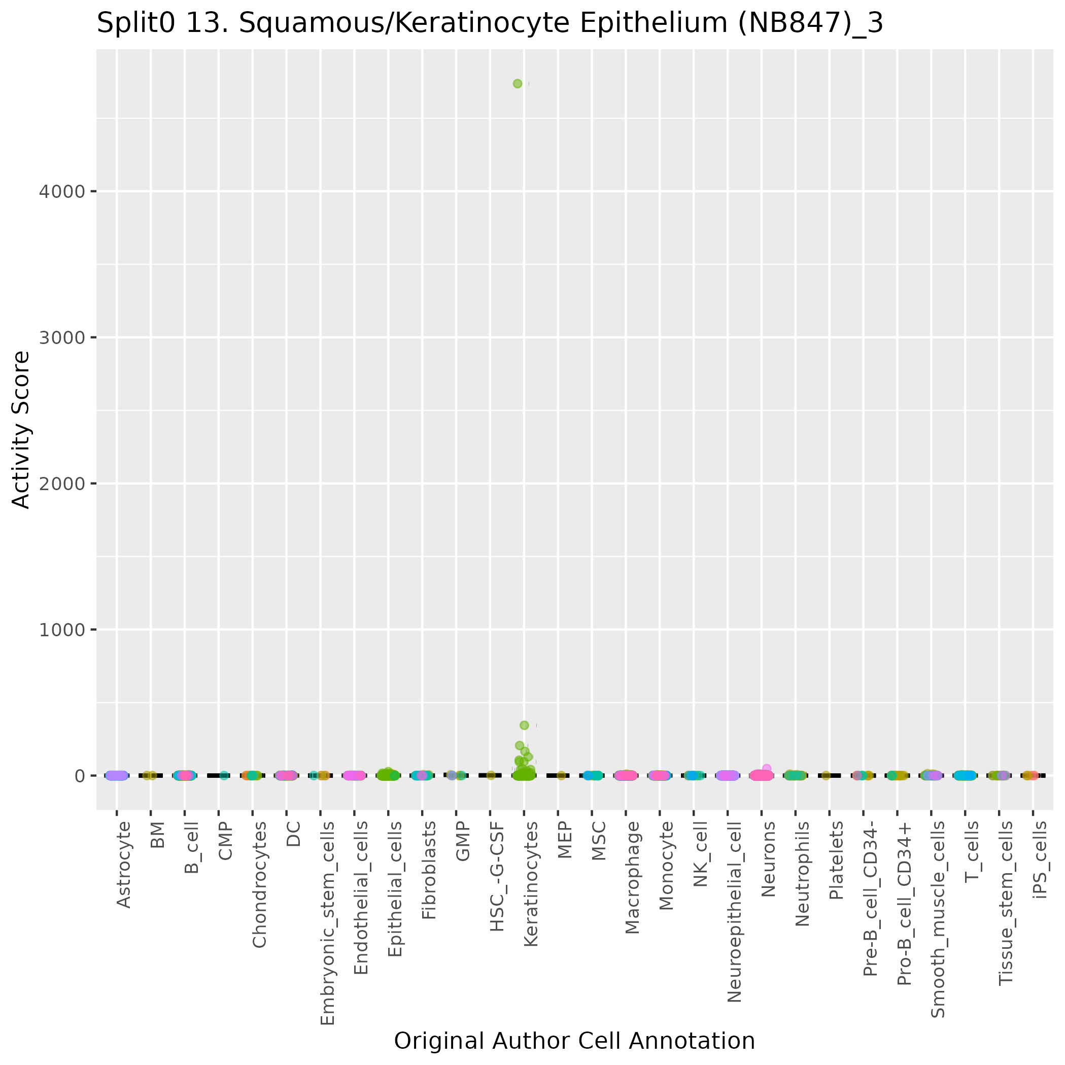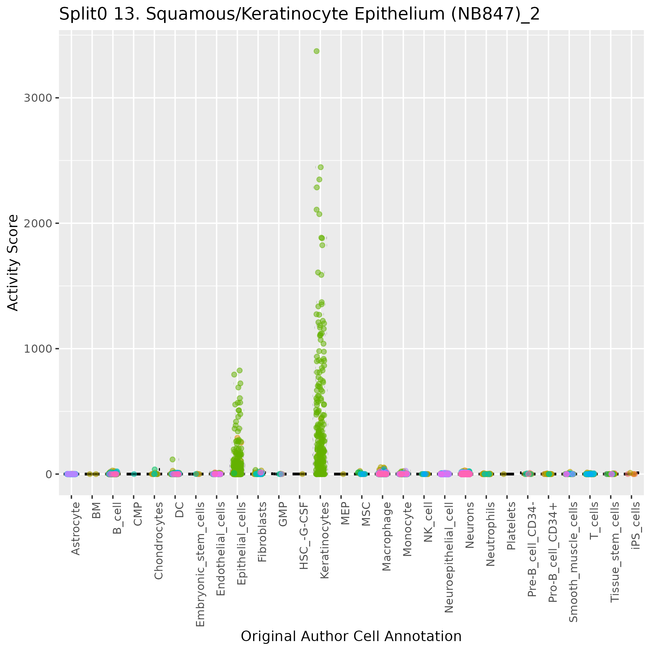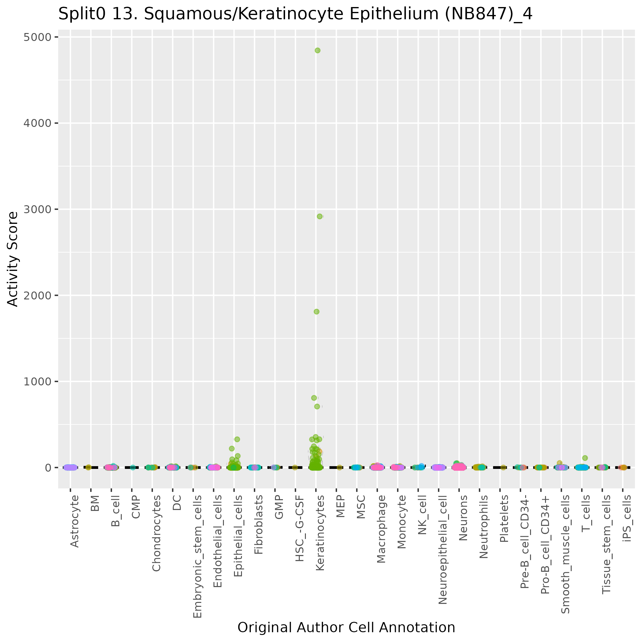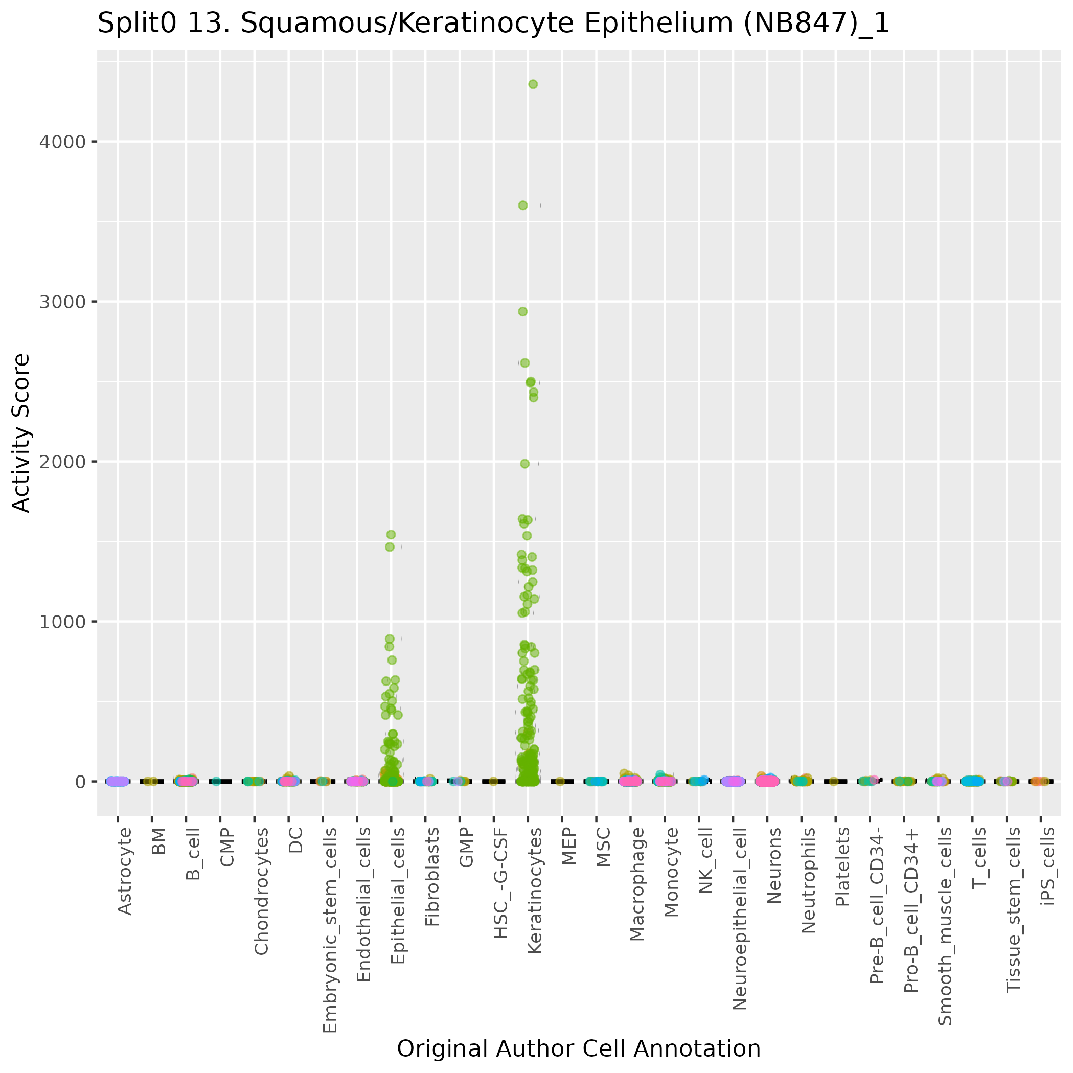 Epithelial cells: Epithelial cells (curated markers) highly specialised cells which are located in the outer layer of stroma and form the cellular components of the epithelium: Wilcoxon ranksum test P-value for gene set overrepresentation: 3.19e-01 Mean rank of genes in gene set: 8830 Rank on gene expression program of genes in gene set: