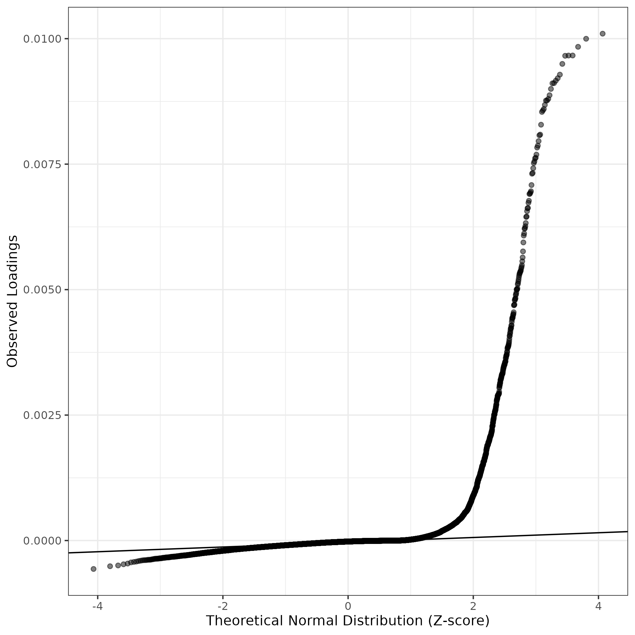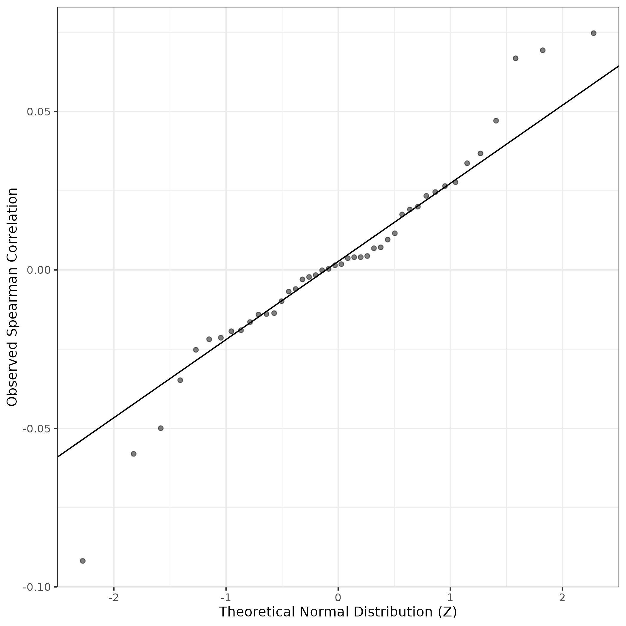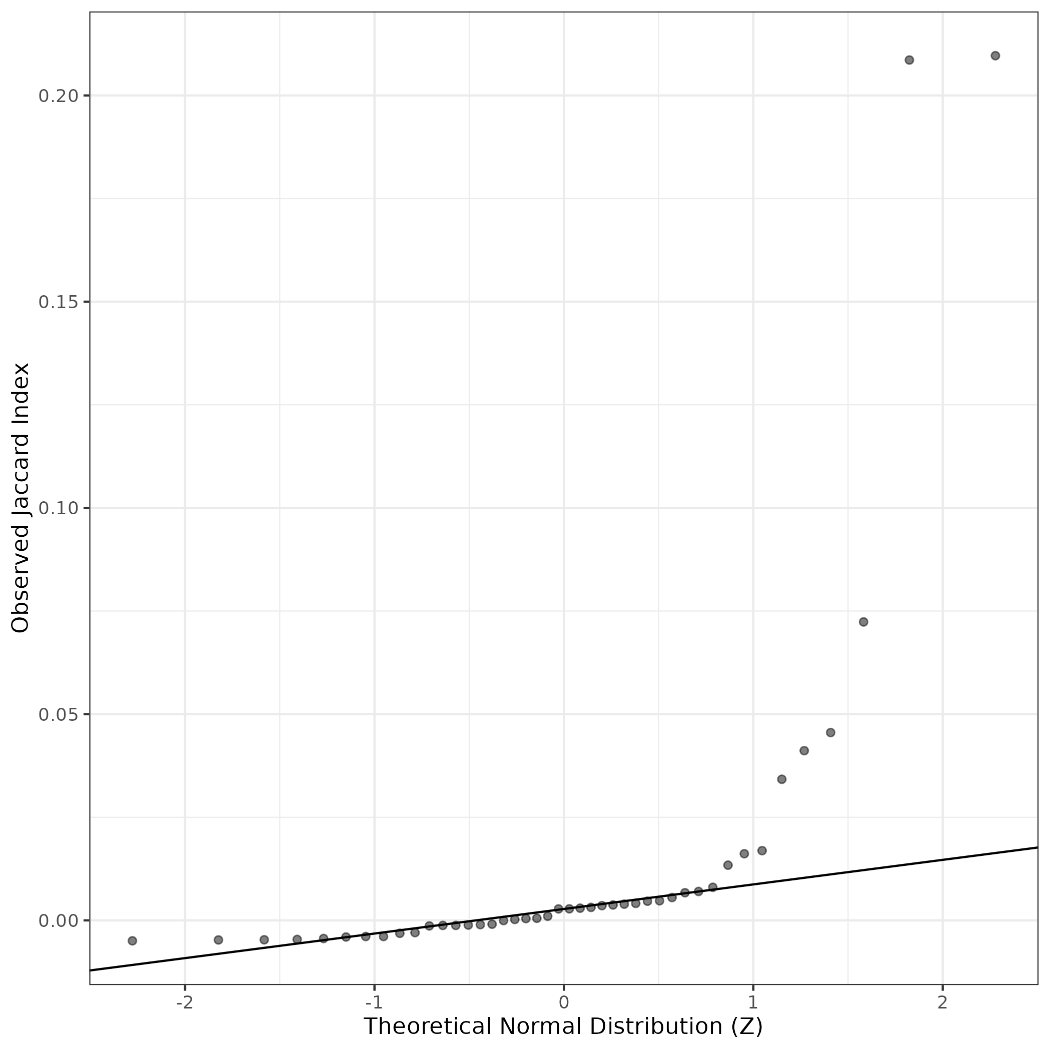 A similar QQ-plot as above, but only for instances where the H value is e.g. > 25, i.e. we are confident that the expression program is active above noise. Agreemenet between these binary vectors is tested using the Jaccard Index, with the P-values calculated by an exact test: