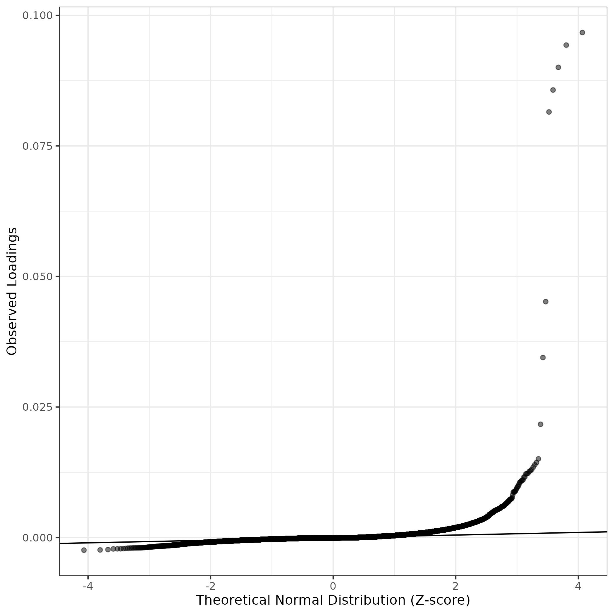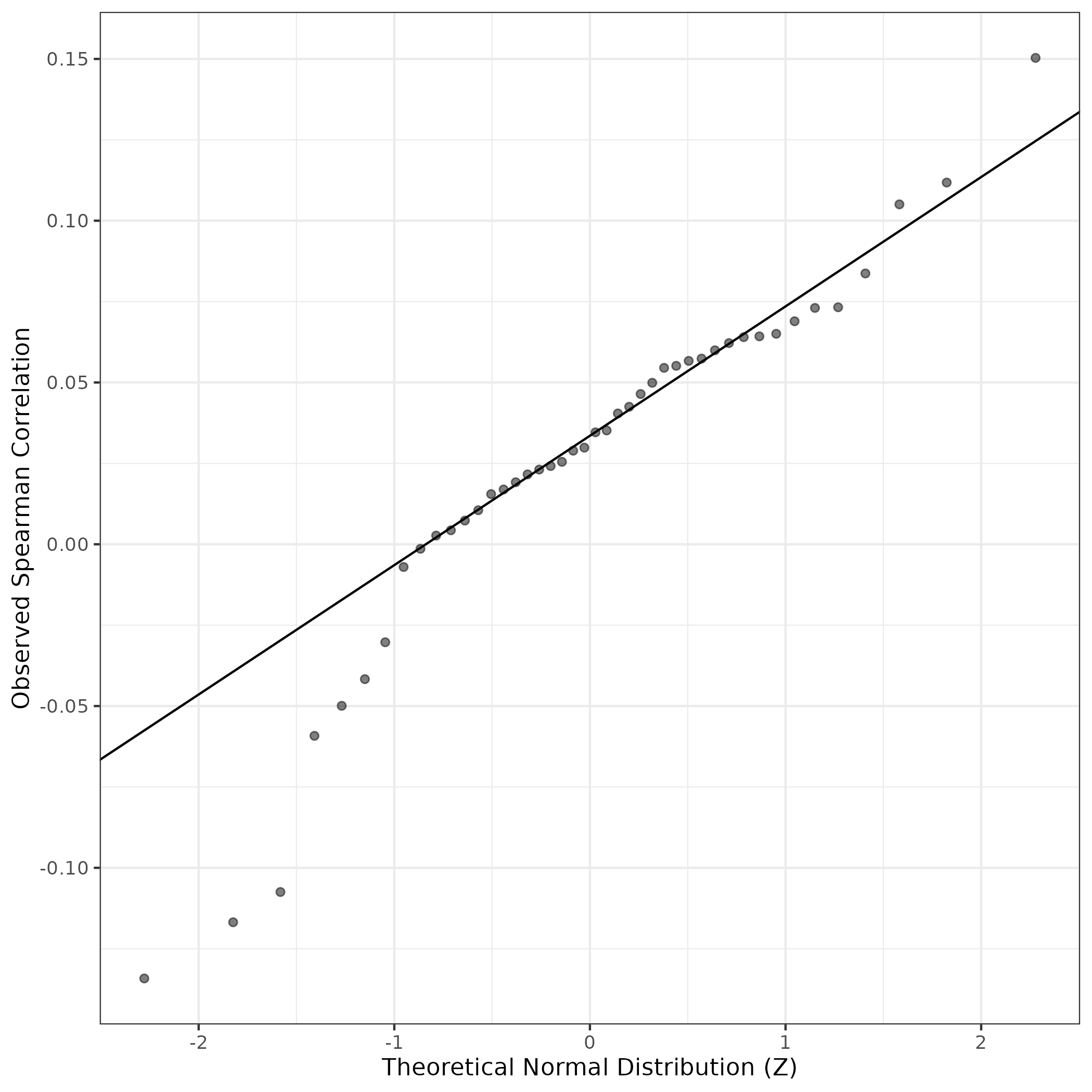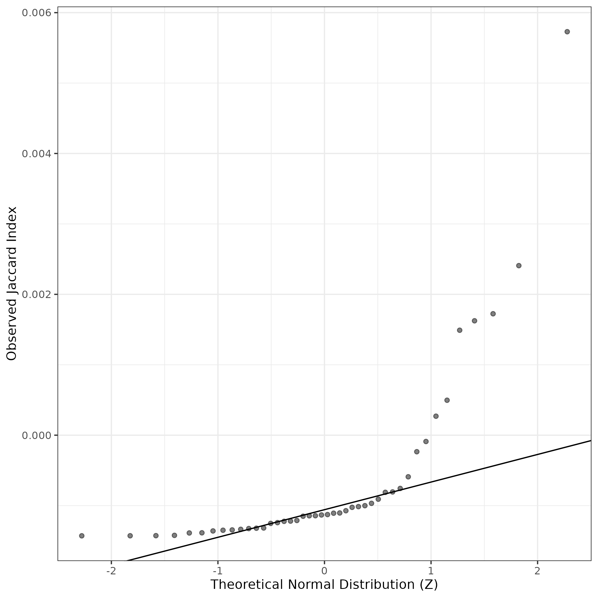 A similar QQ-plot as above, but only for instances where the H value is e.g. > 25, i.e. we are confident that the expression program is active above noise. Agreemenet between these binary vectors is tested using the Jaccard Index, with the P-values calculated by an exact test: