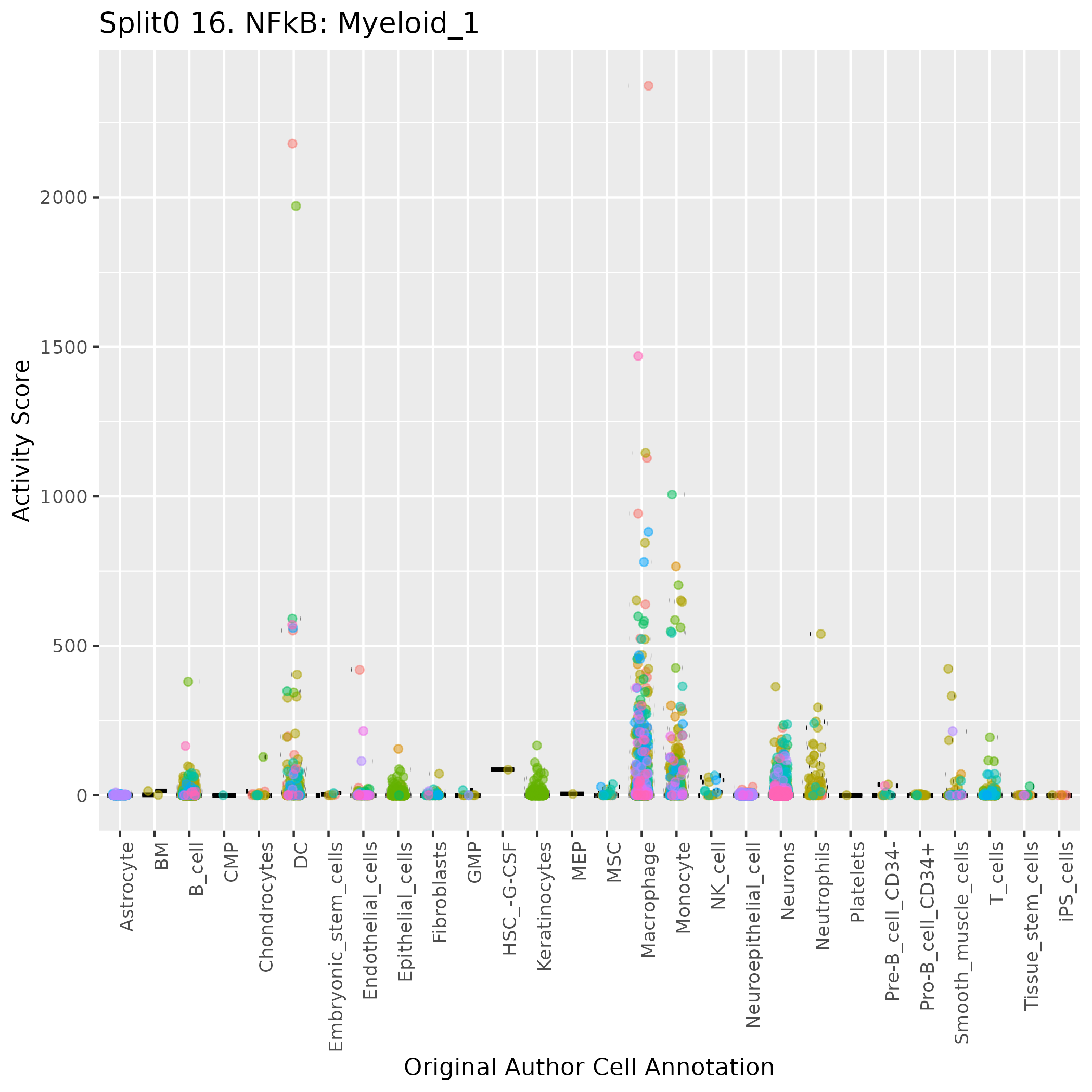 Monocytes: Monocytes (curated markers) myeloid mononuclear recirculating leukocytes that are capable of differentiating into macrophages and myeloid lineage dendritic cells: Wilcoxon ranksum test P-value for gene set overrepresentation: 9.58e-01 Mean rank of genes in gene set: 20942 Rank on gene expression program of genes in gene set: