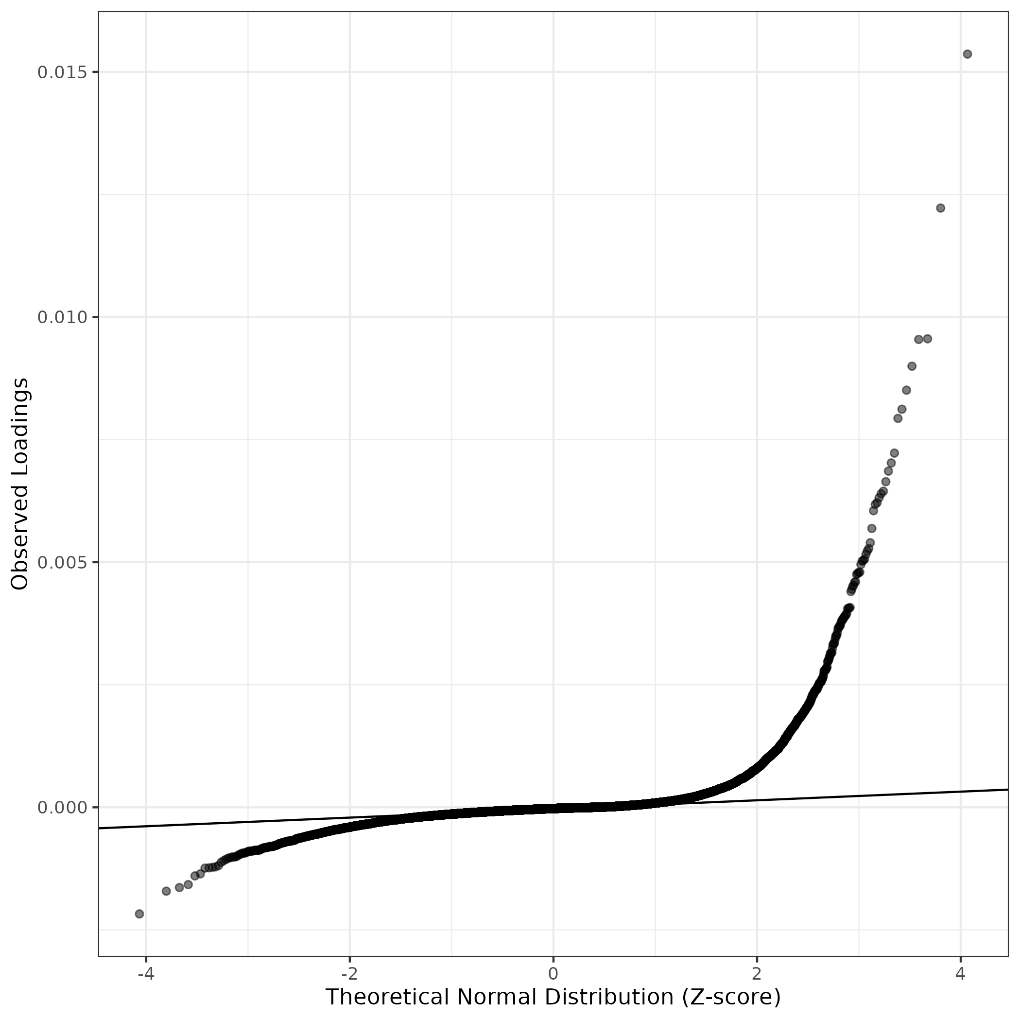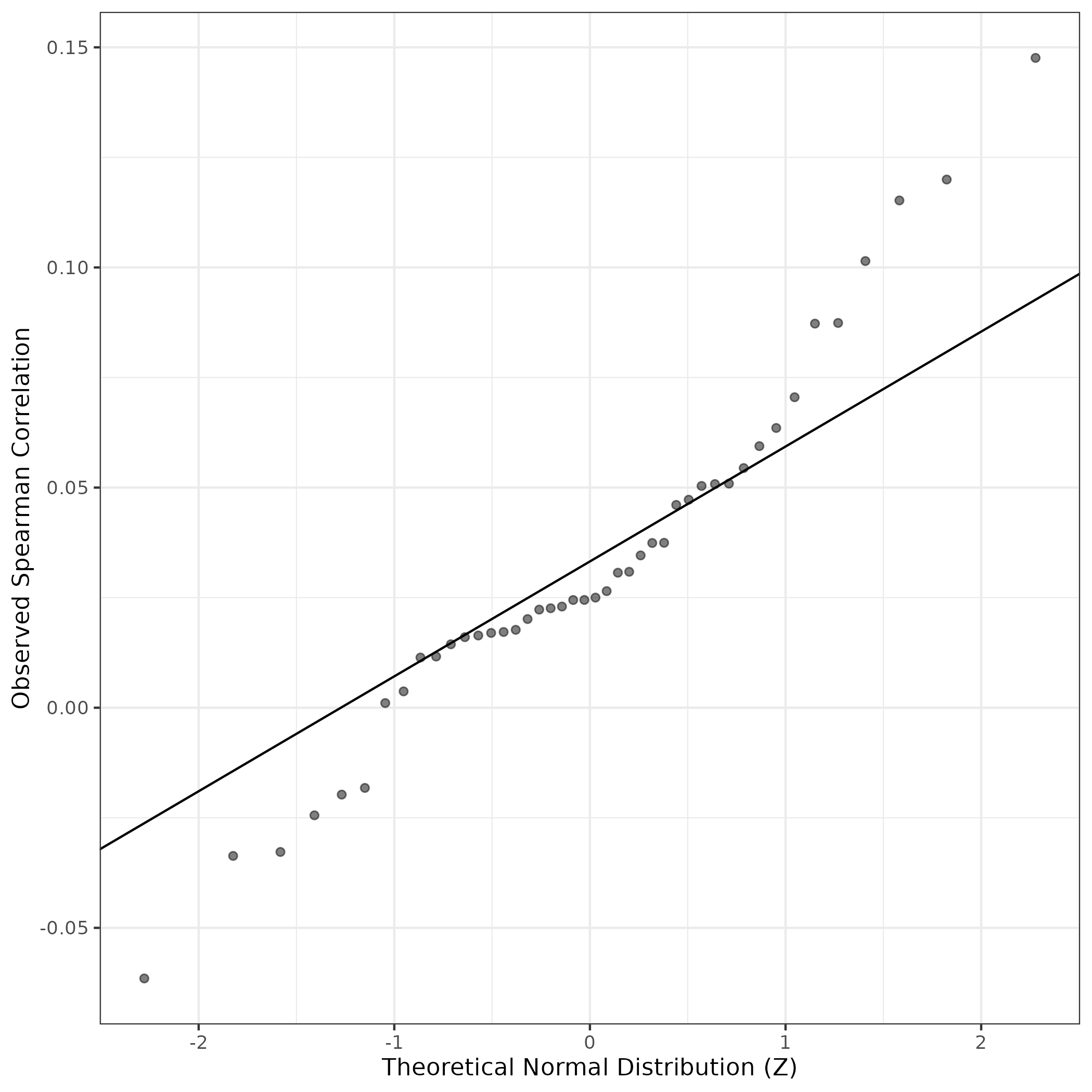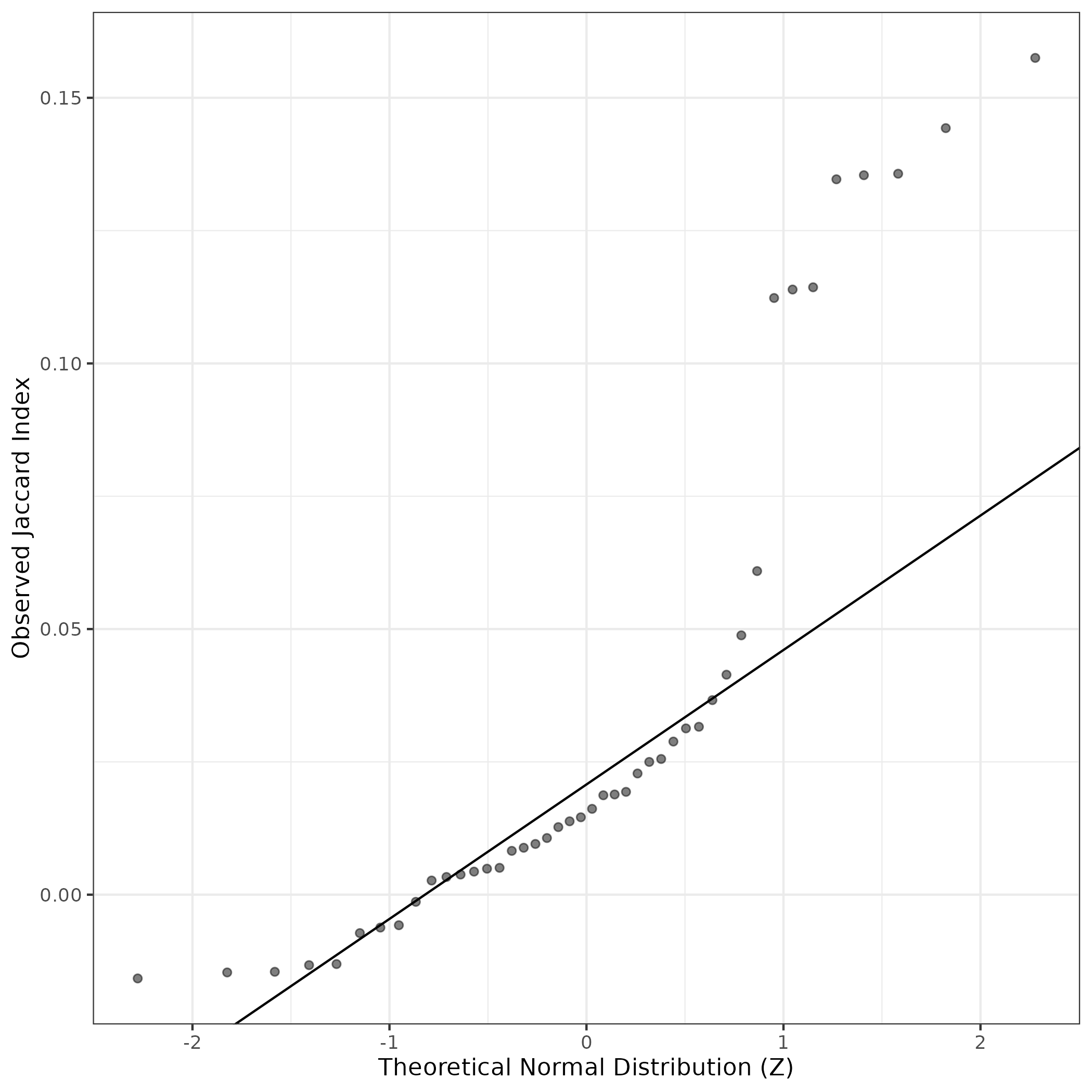 A similar QQ-plot as above, but only for instances where the H value is e.g. > 25, i.e. we are confident that the expression program is active above noise. Agreemenet between these binary vectors is tested using the Jaccard Index, with the P-values calculated by an exact test: