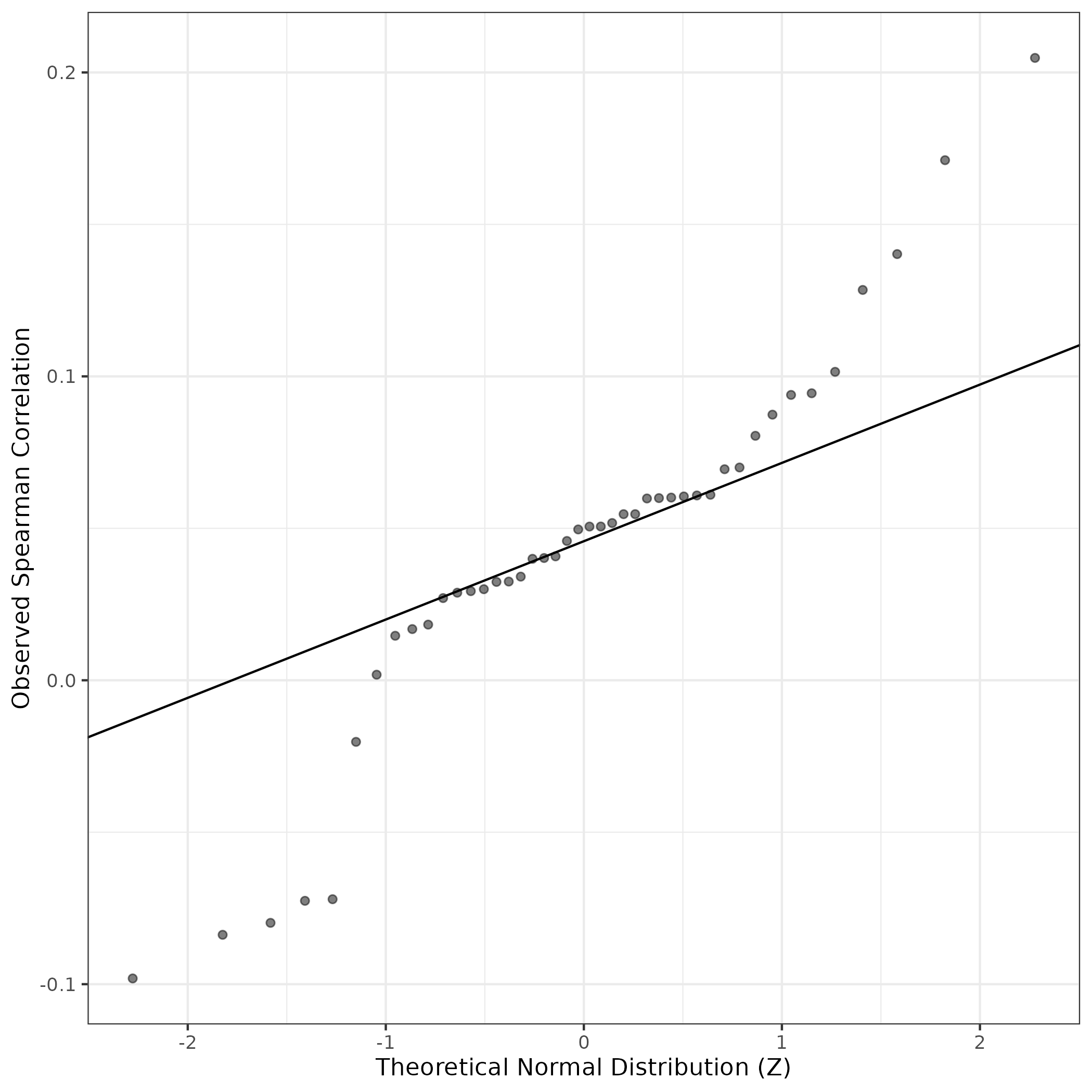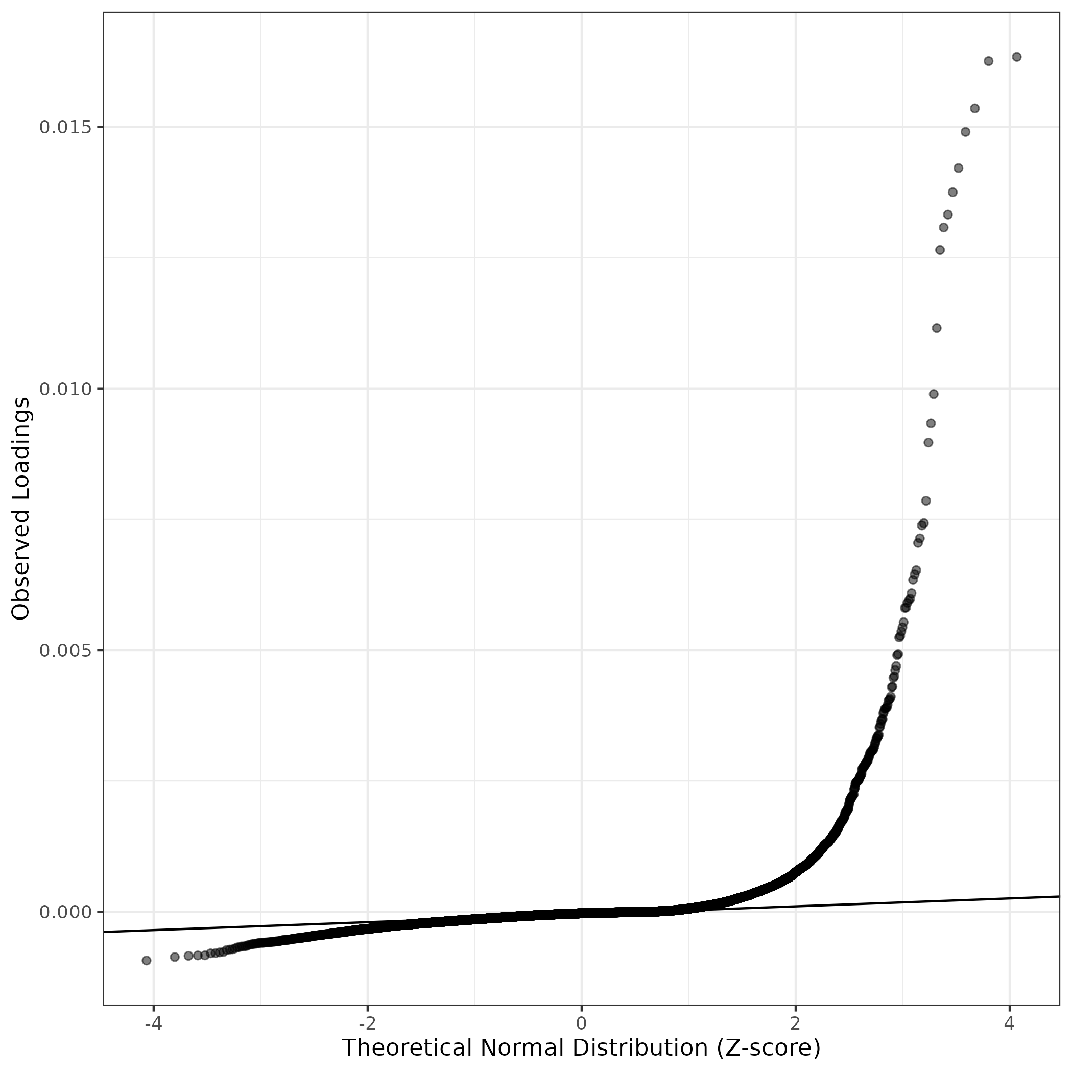 QQ-plot of gene loadings, averaged over both independent splits of the data
