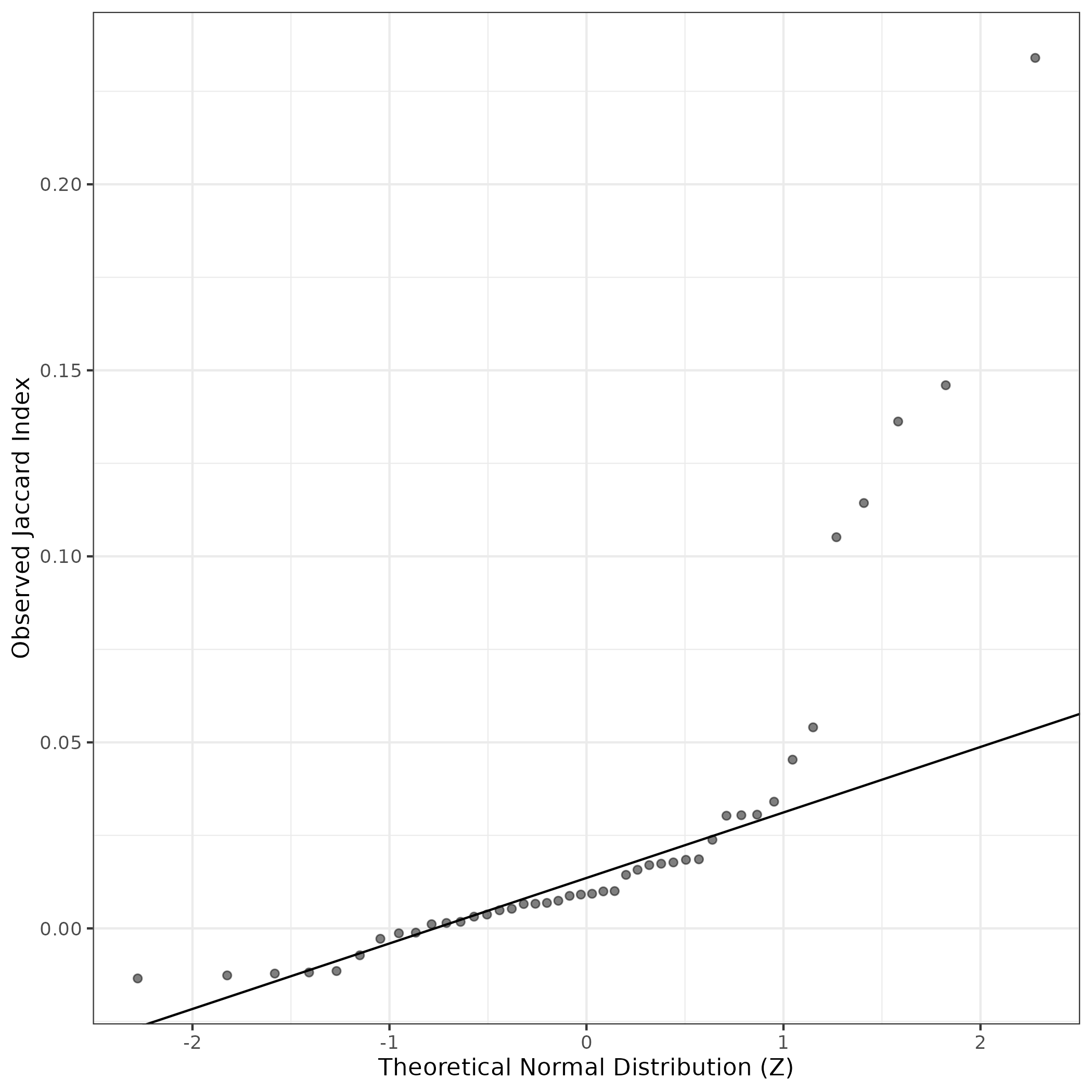 A similar QQ-plot as above, but only for instances where the H value is e.g. > 25, i.e. we are confident that the expression program is active above noise. Agreemenet between these binary vectors is tested using the Jaccard Index, with the P-values calculated by an exact test: