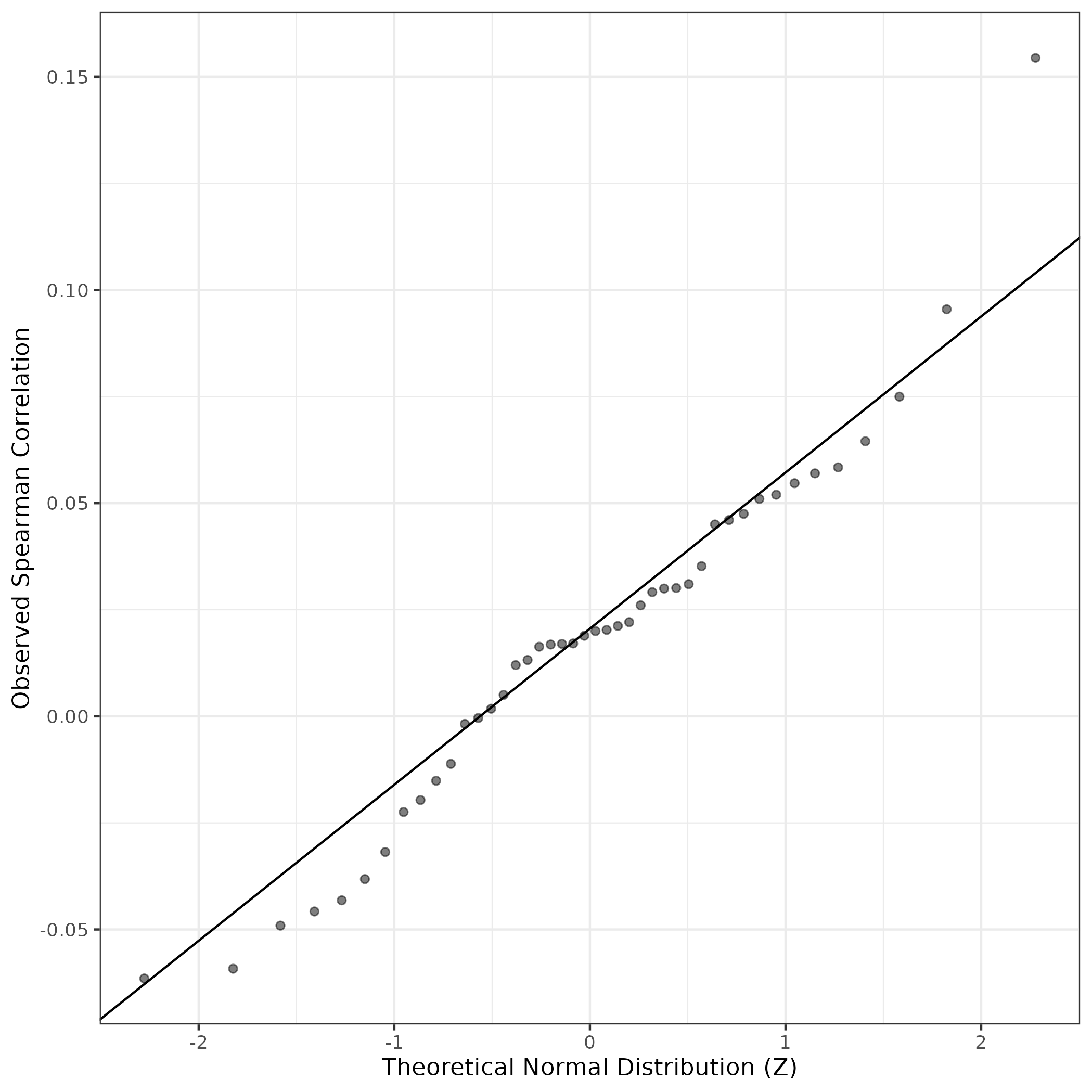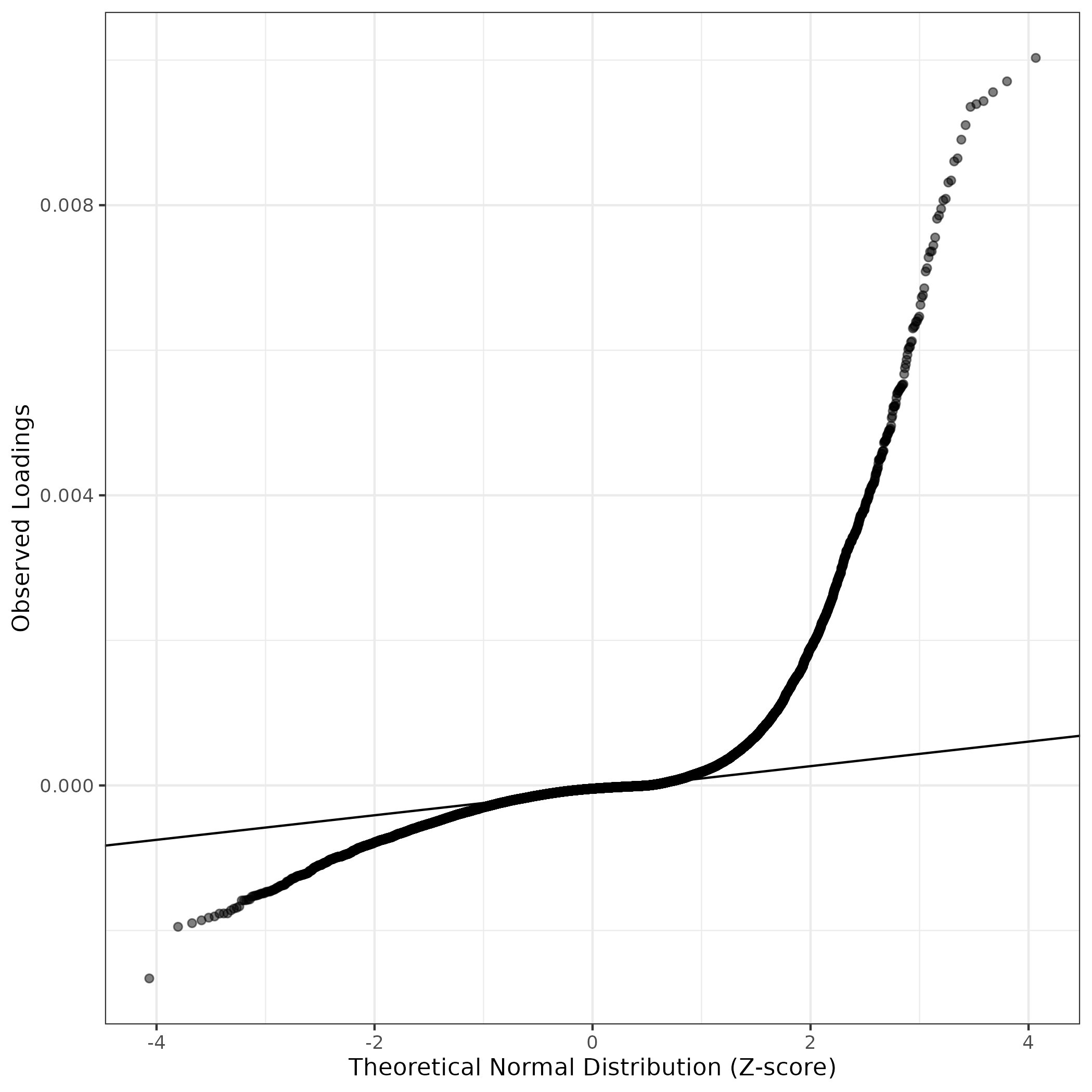 QQ-plot of gene loadings, averaged over both independent splits of the data