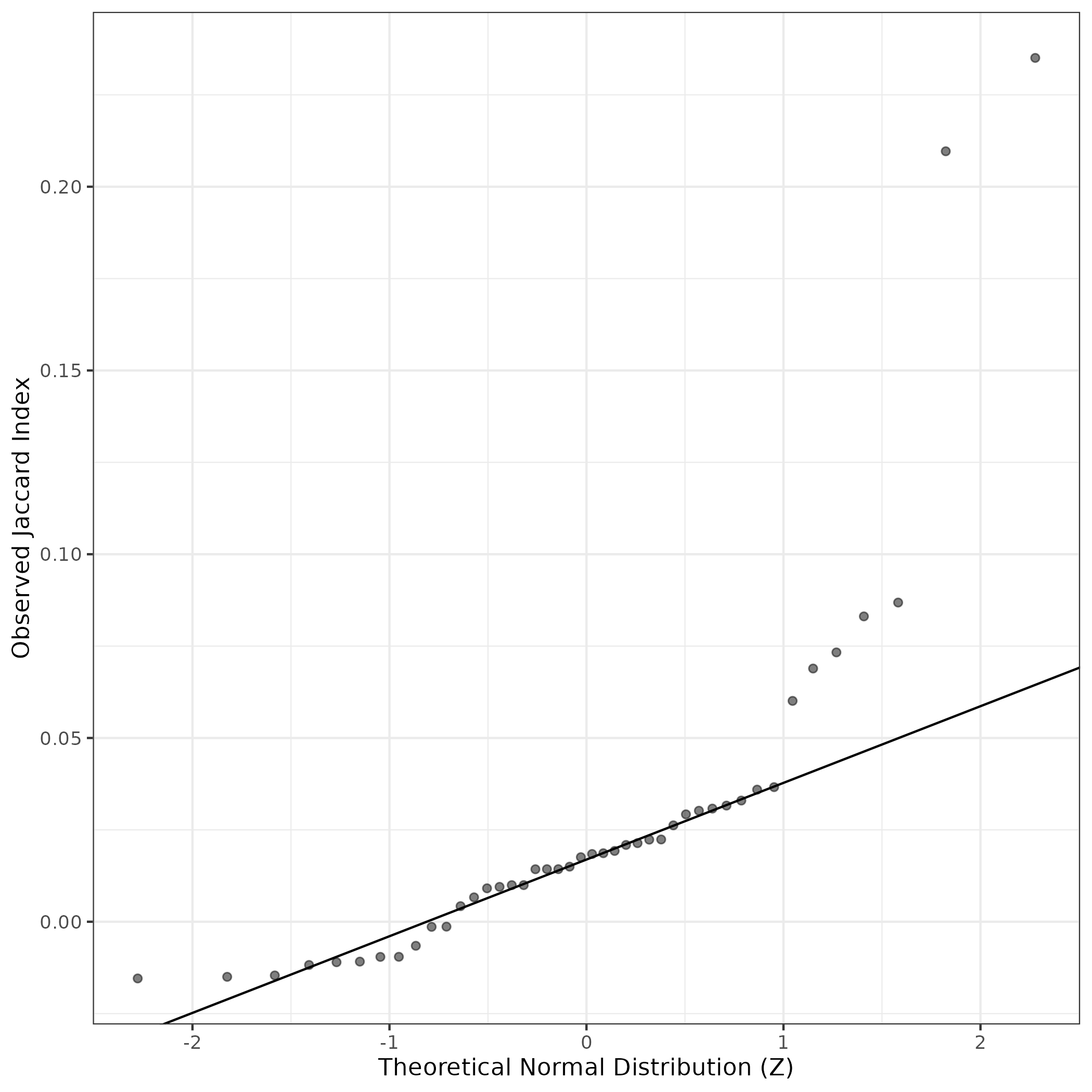 A similar QQ-plot as above, but only for instances where the H value is e.g. > 25, i.e. we are confident that the expression program is active above noise. Agreemenet between these binary vectors is tested using the Jaccard Index, with the P-values calculated by an exact test: