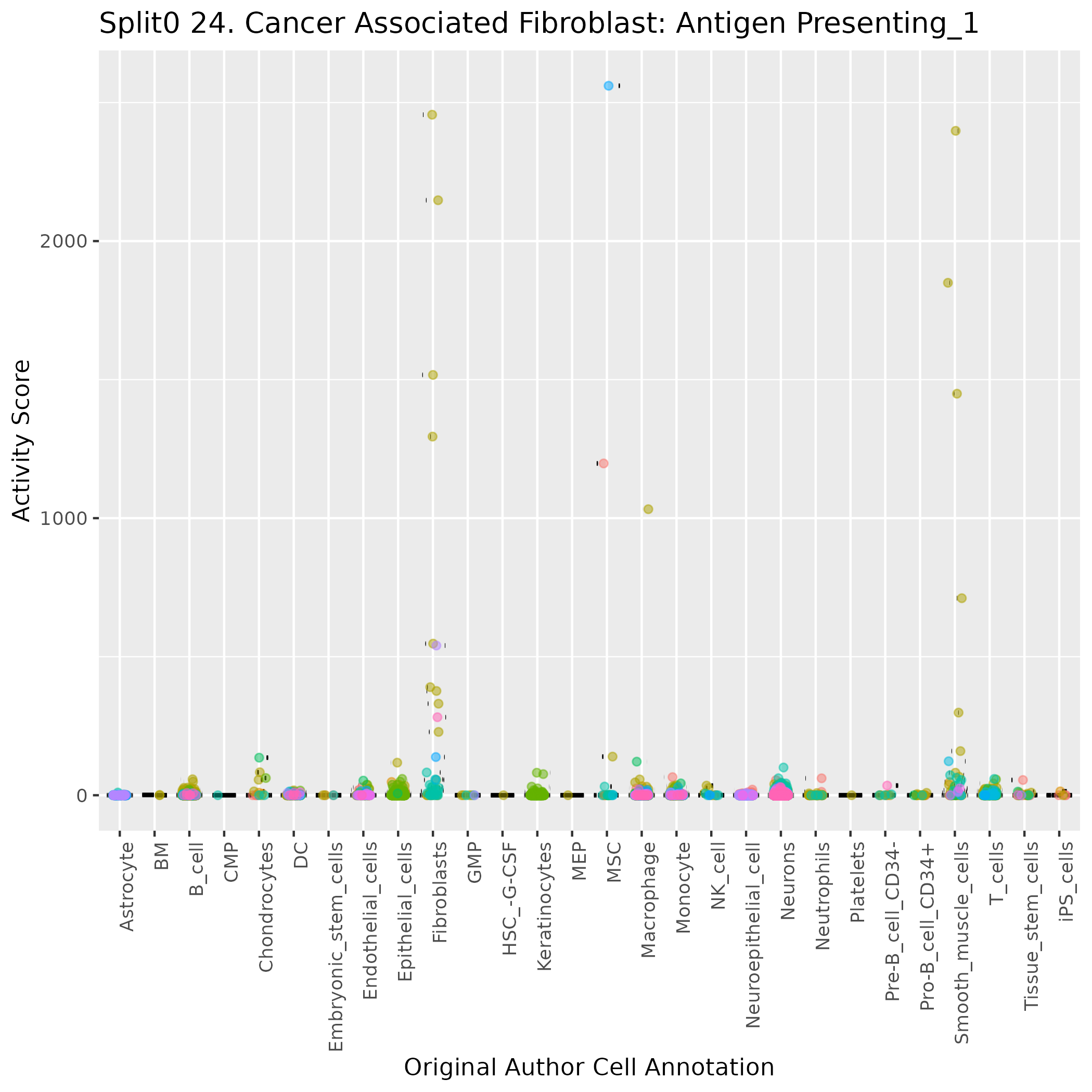 Antigen Presenting CAF These marker genes were curated across cancer subtypes in multiple organ systems as reviewed in Lavie et. al. (PMID 35883004) and contain antigen presenting specific CAF genes: Wilcoxon ranksum test P-value for gene set overrepresentation: 3.00e-07 Mean rank of genes in gene set: 3157.59 Rank on gene expression program of genes in gene set: