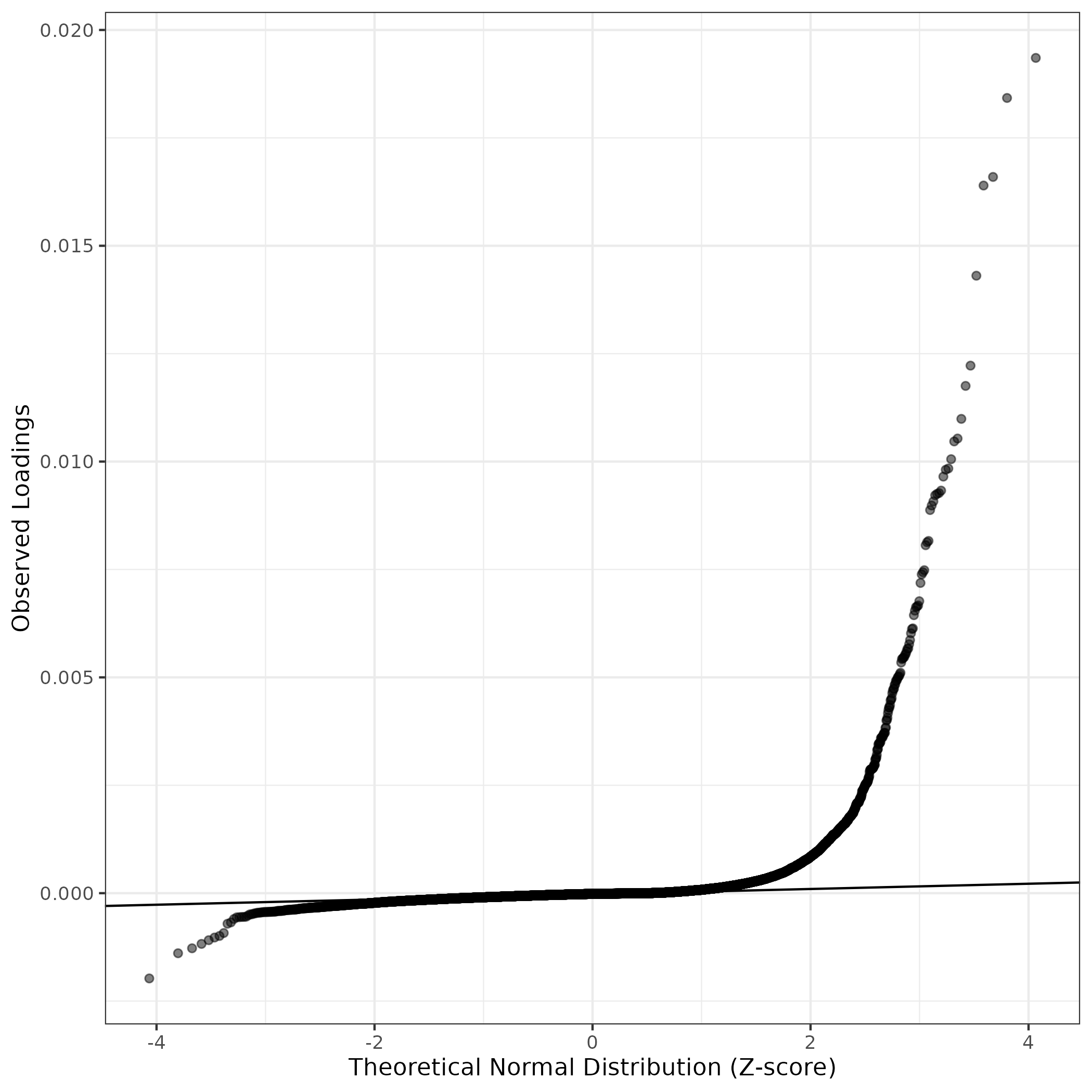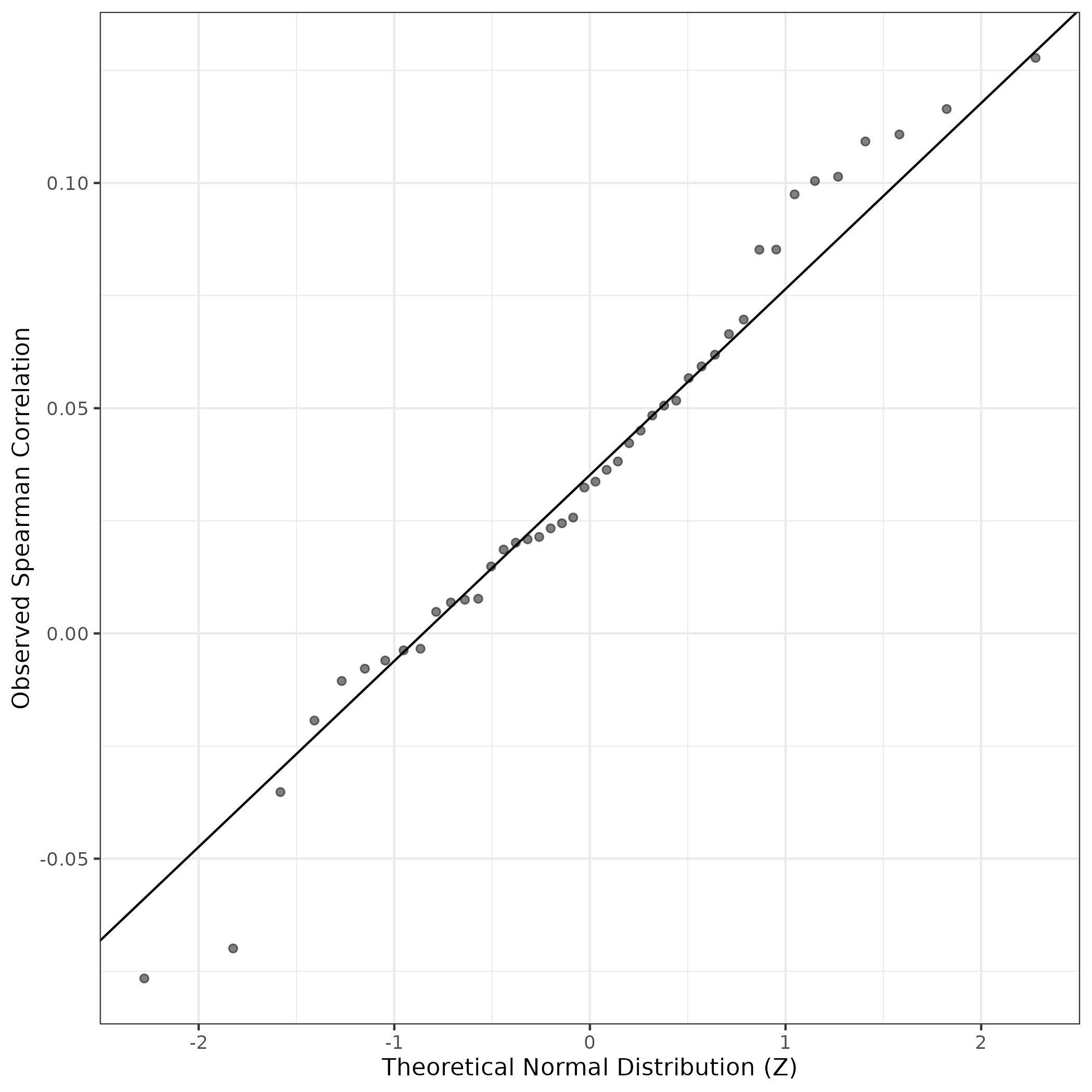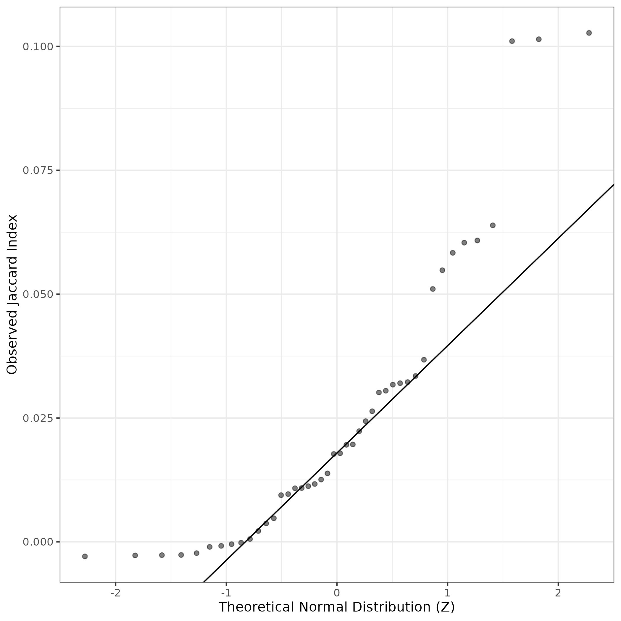 A similar QQ-plot as above, but only for instances where the H value is e.g. > 25, i.e. we are confident that the expression program is active above noise. Agreemenet between these binary vectors is tested using the Jaccard Index, with the P-values calculated by an exact test: