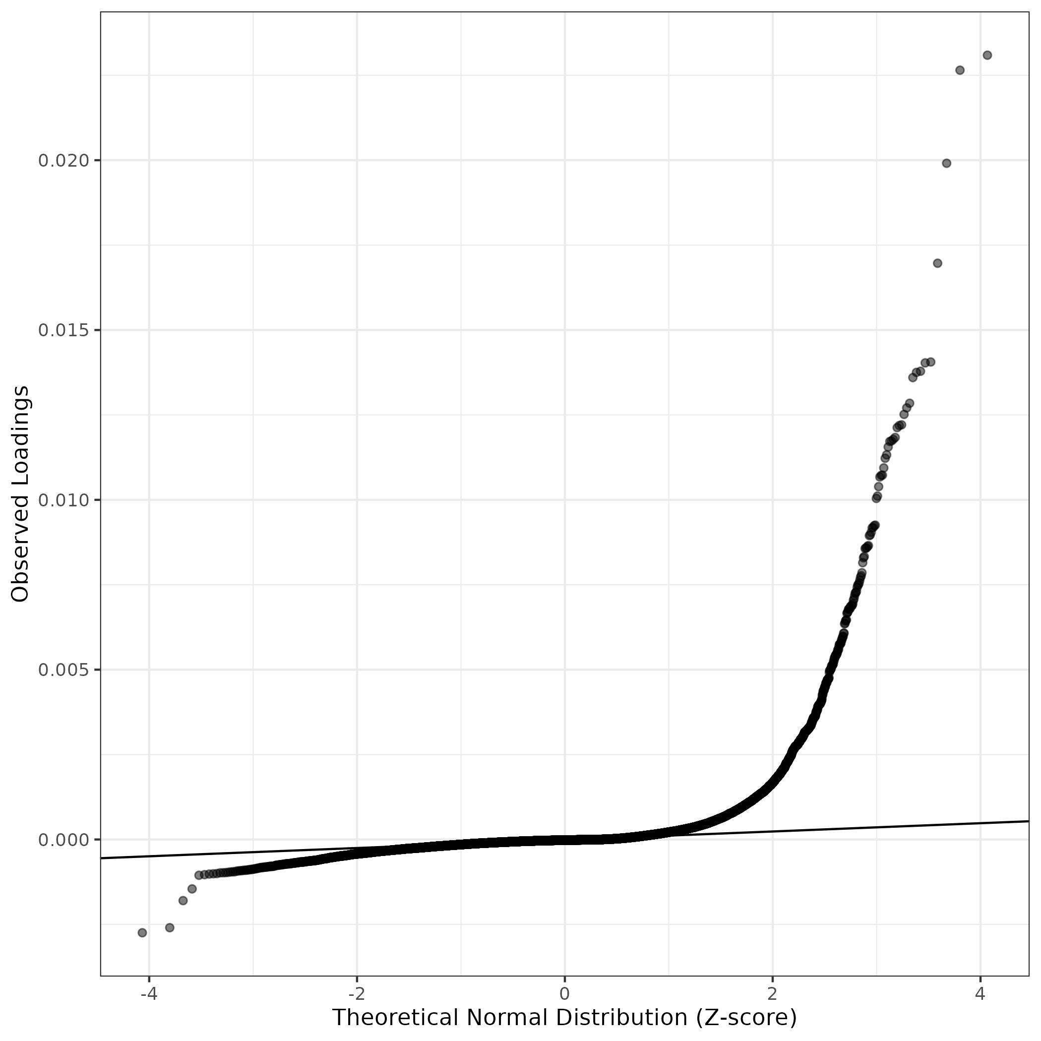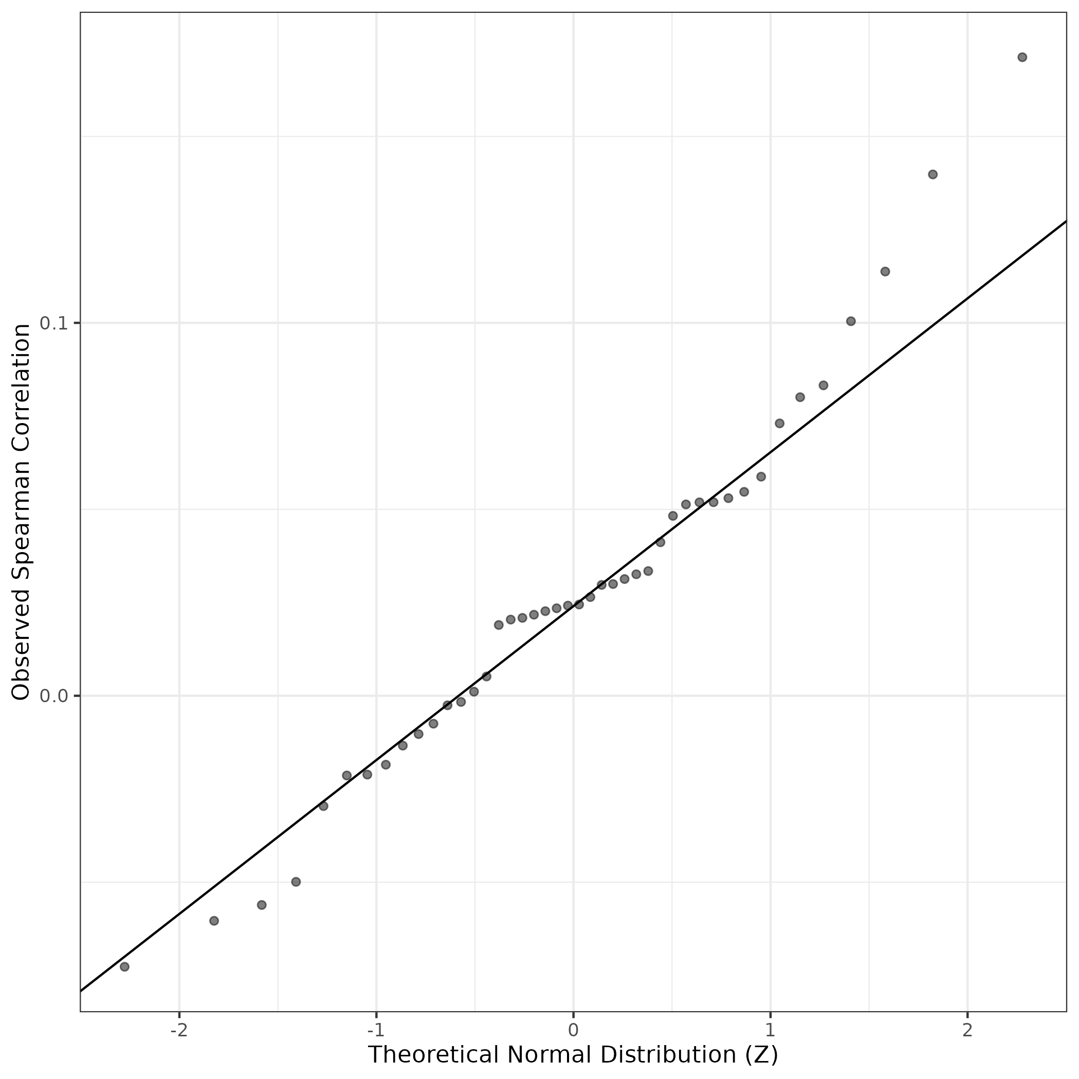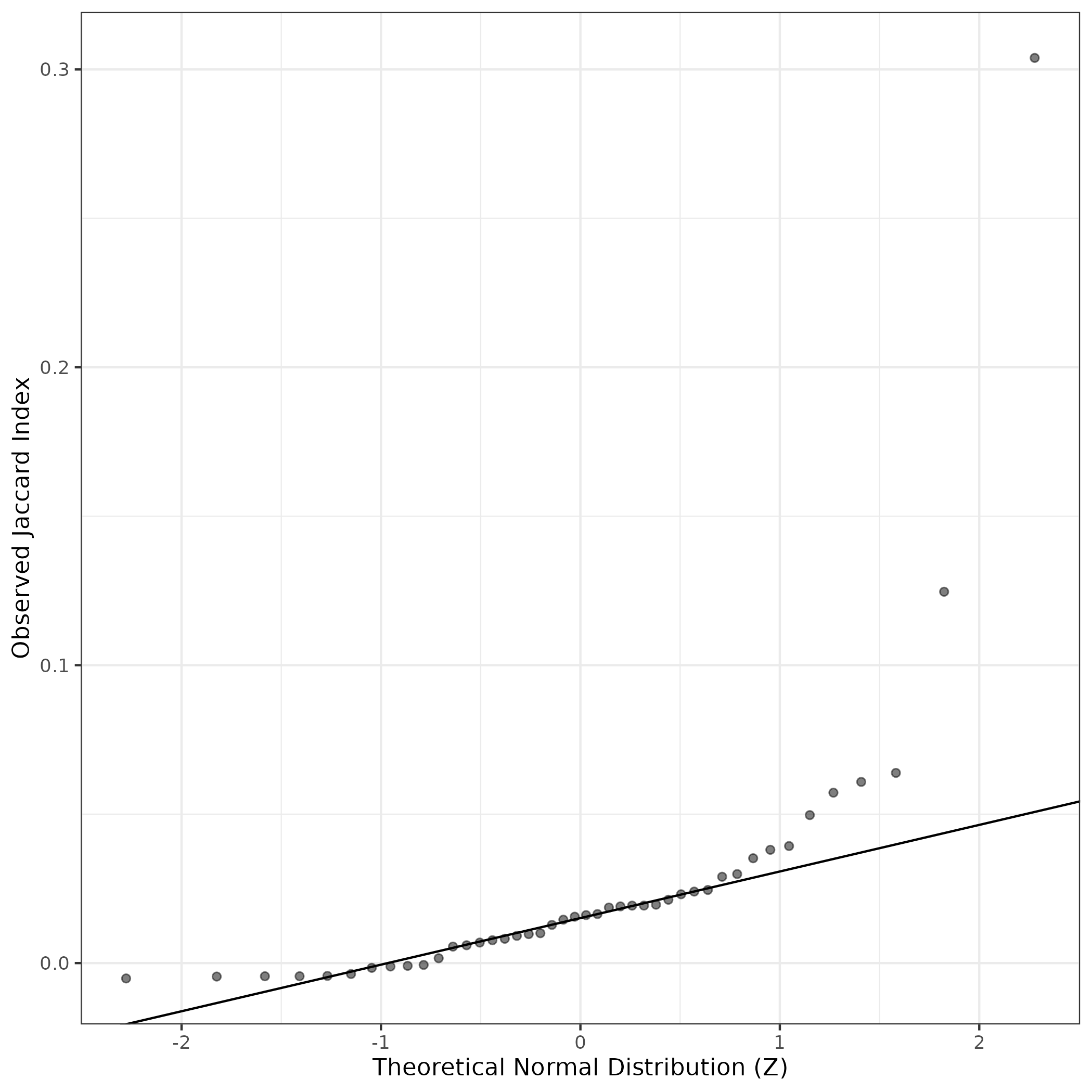 A similar QQ-plot as above, but only for instances where the H value is e.g. > 25, i.e. we are confident that the expression program is active above noise. Agreemenet between these binary vectors is tested using the Jaccard Index, with the P-values calculated by an exact test: