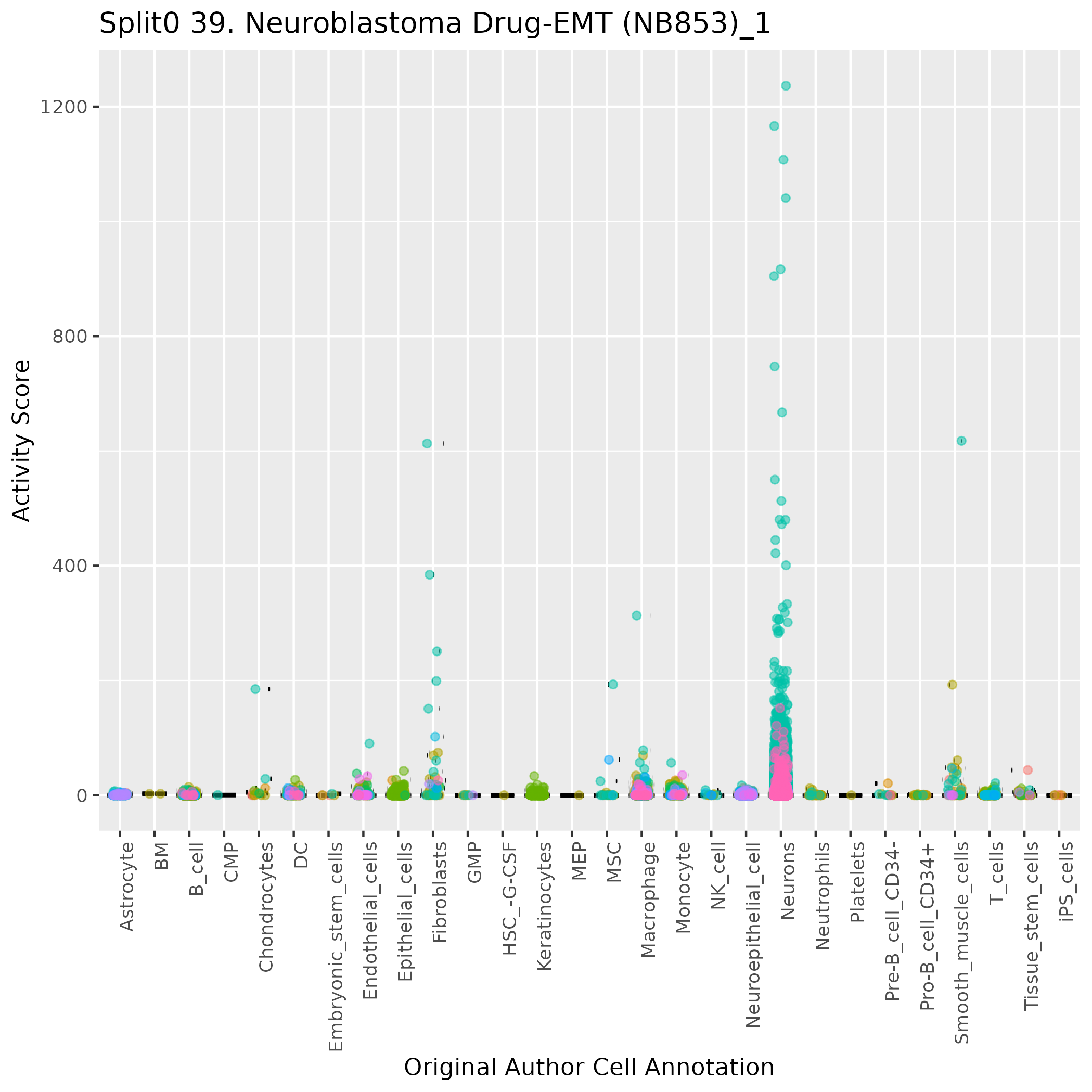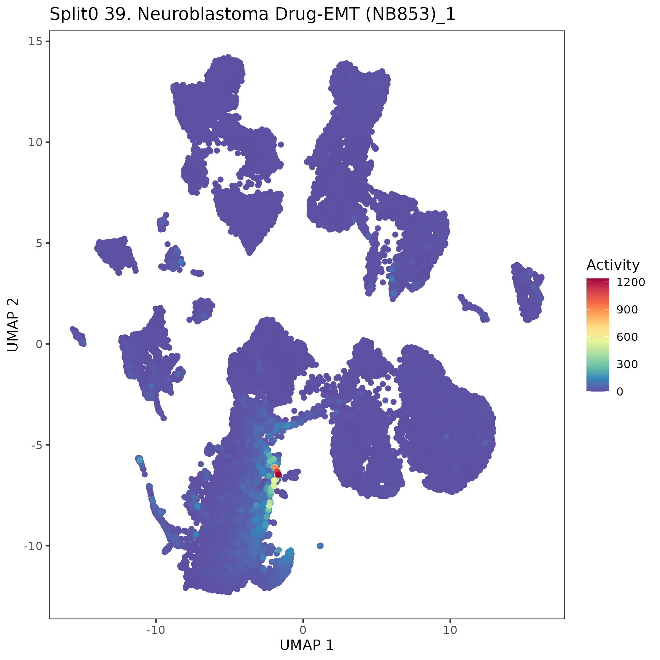 SCPs neuroblastoma unique (Olsen) Similar to above, but for genes unique to neuroblastoma SCP-like cells. Note FN1 is often used as a mesenchymal marker gene.: Wilcoxon ranksum test P-value for gene set overrepresentation: 8.99e-01 Mean rank of genes in gene set: 13626 Rank on gene expression program of genes in gene set: