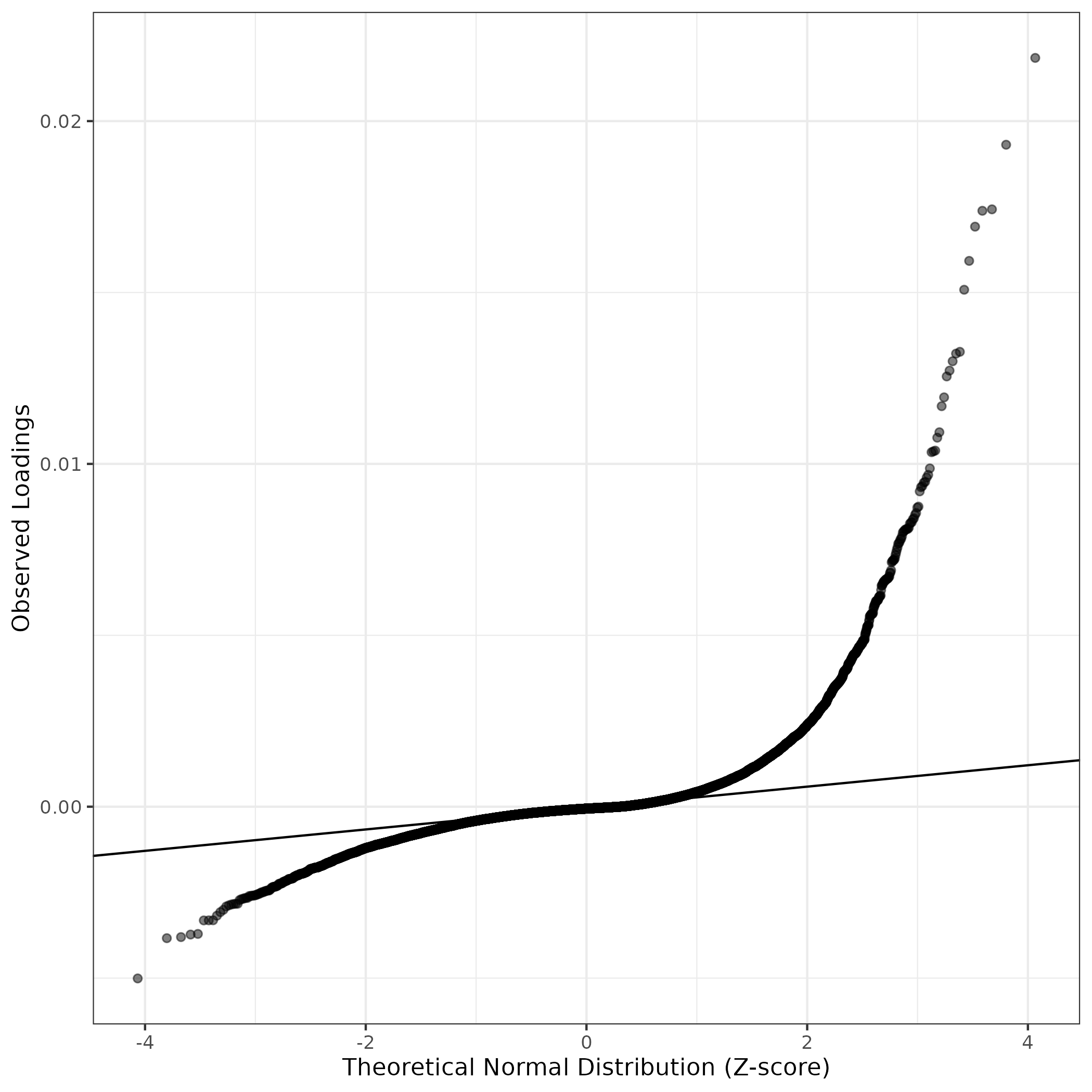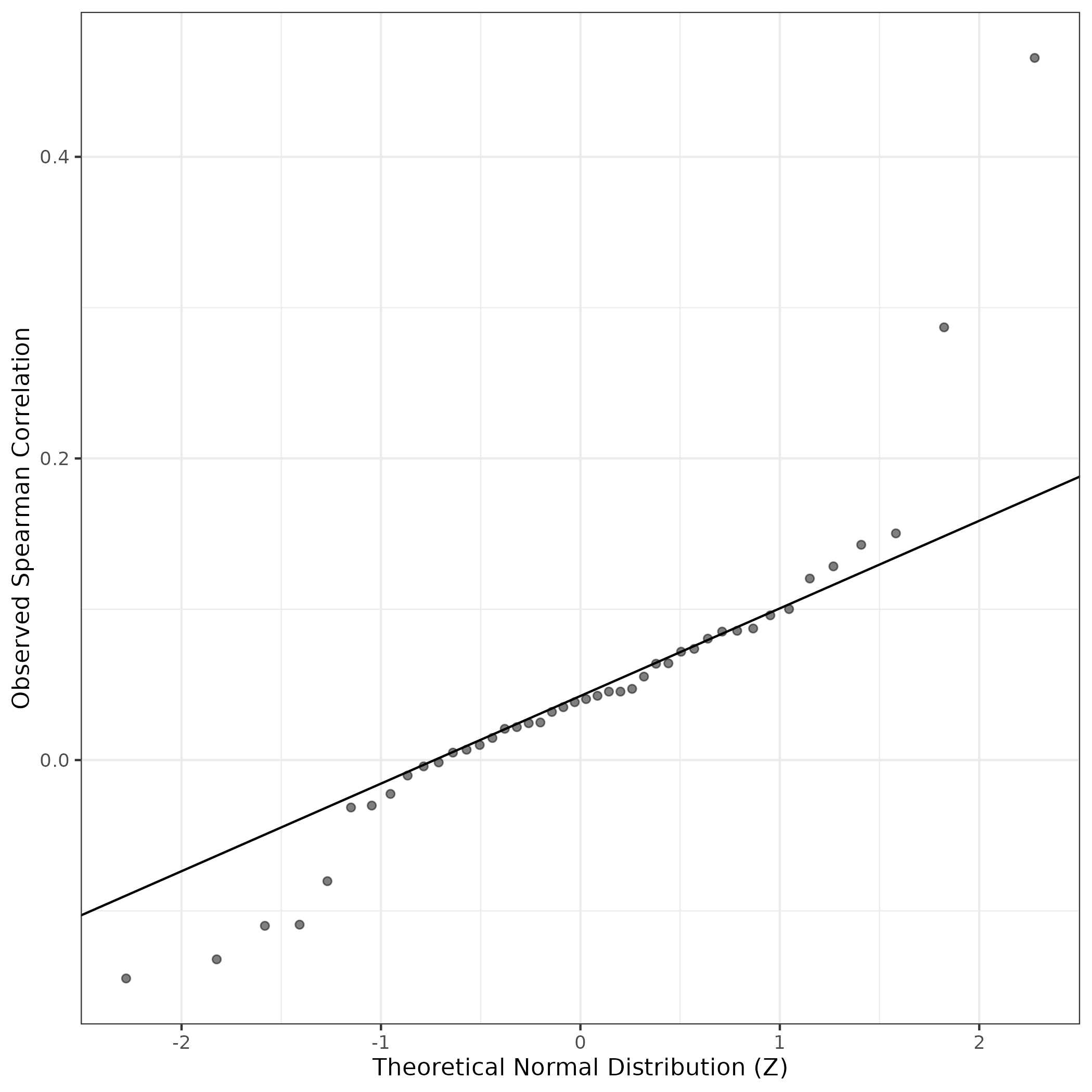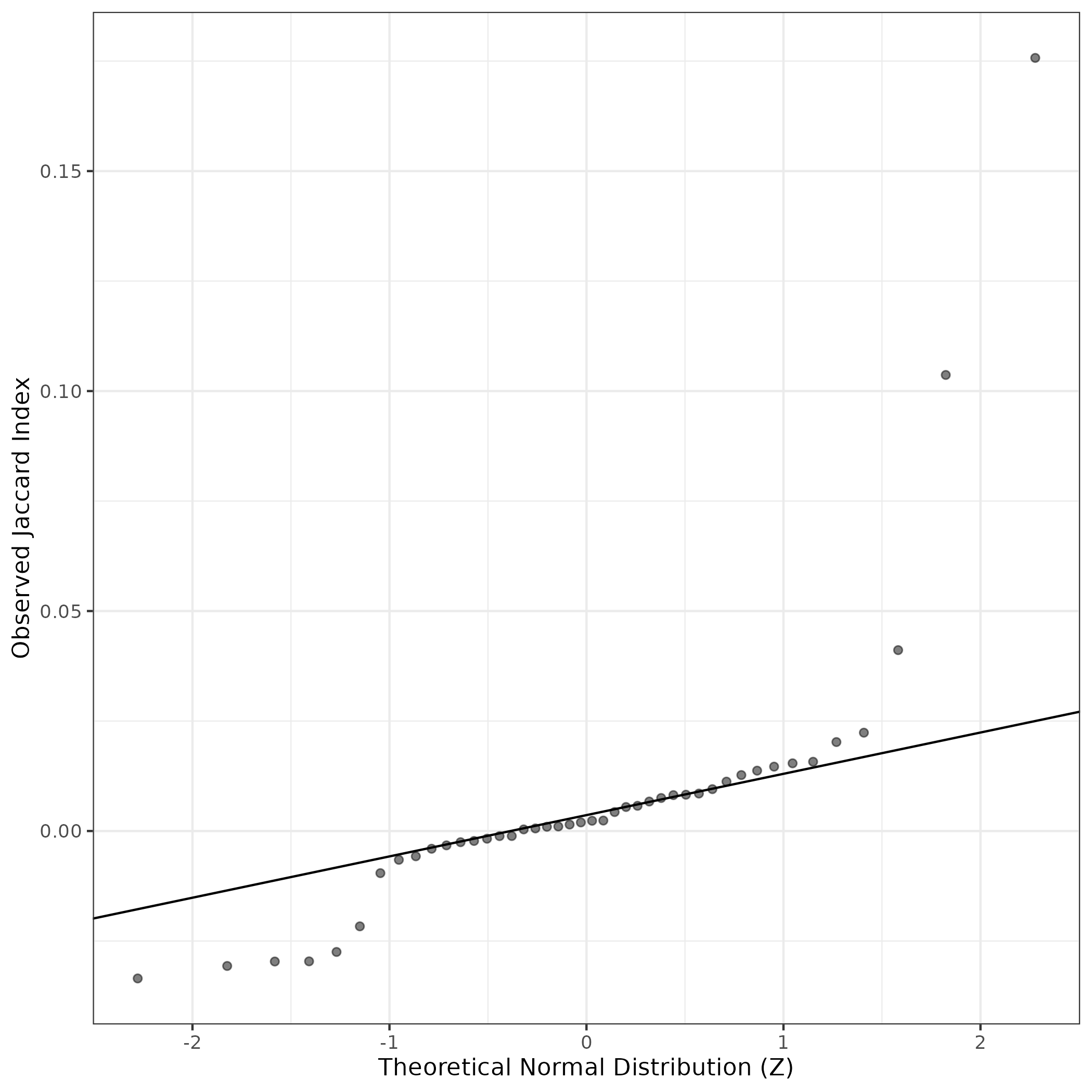 A similar QQ-plot as above, but only for instances where the H value is e.g. > 25, i.e. we are confident that the expression program is active above noise. Agreemenet between these binary vectors is tested using the Jaccard Index, with the P-values calculated by an exact test: