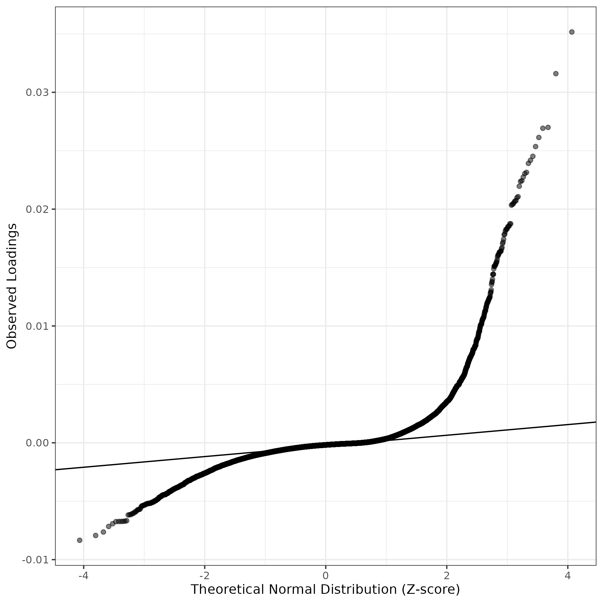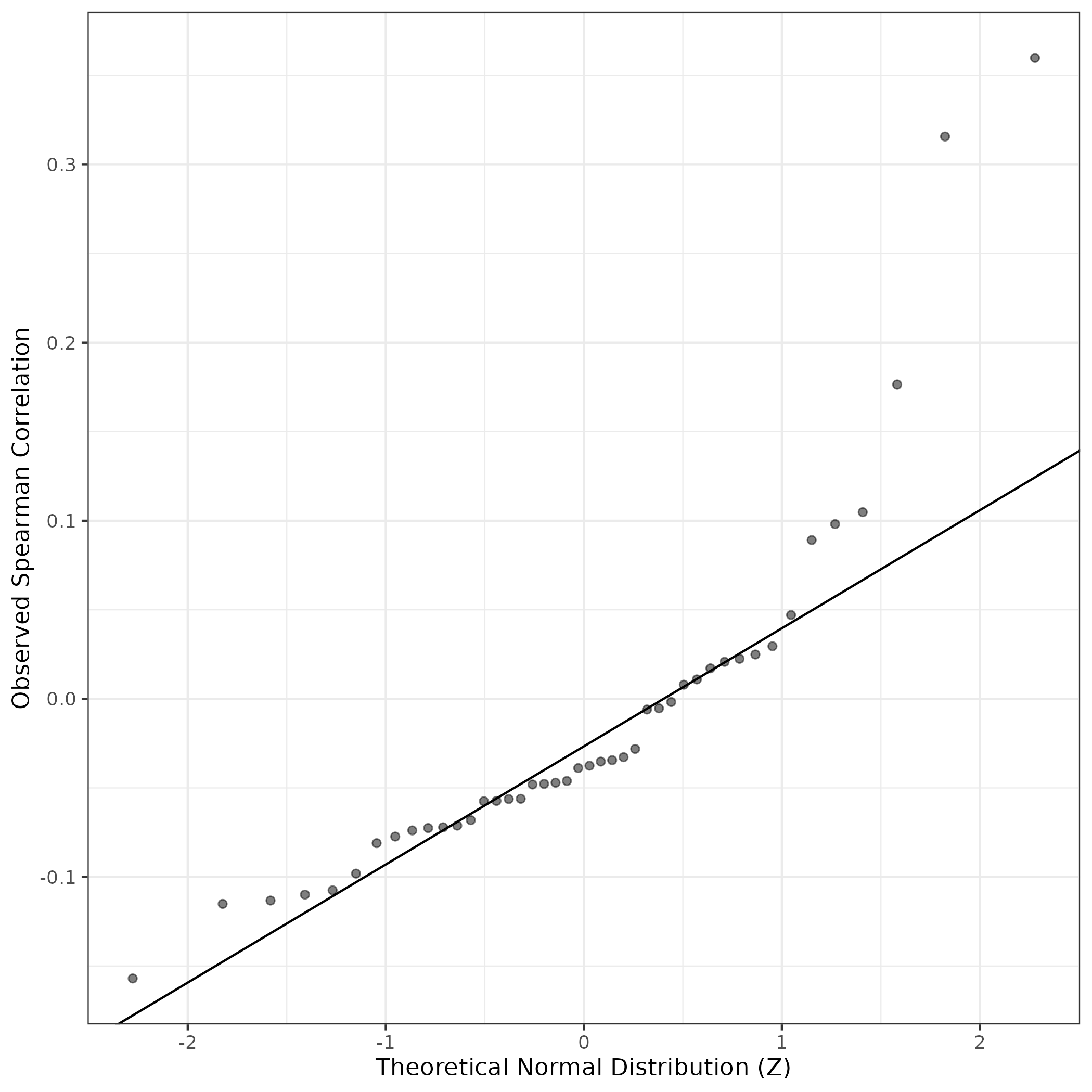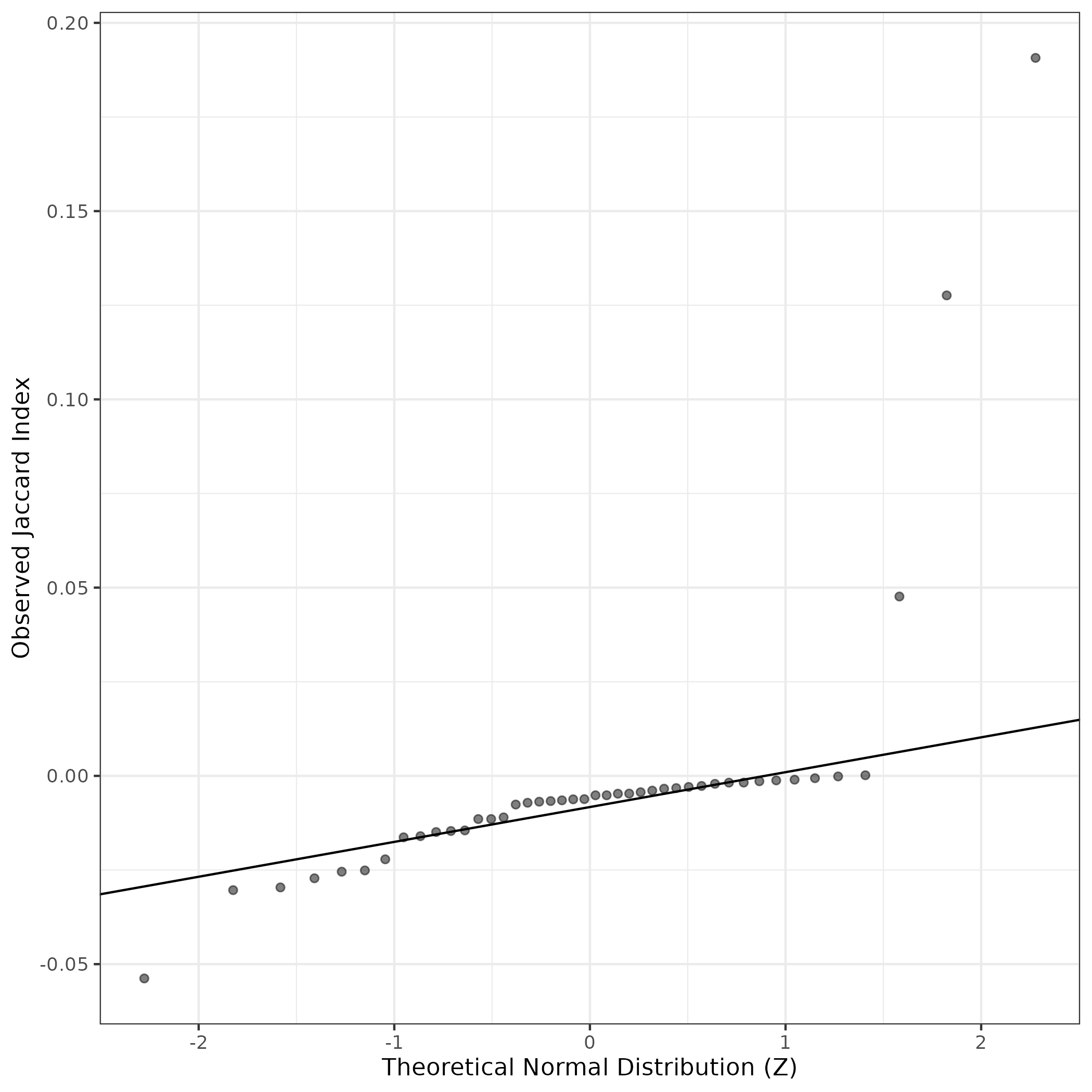 A similar QQ-plot as above, but only for instances where the H value is e.g. > 25, i.e. we are confident that the expression program is active above noise. Agreemenet between these binary vectors is tested using the Jaccard Index, with the P-values calculated by an exact test: