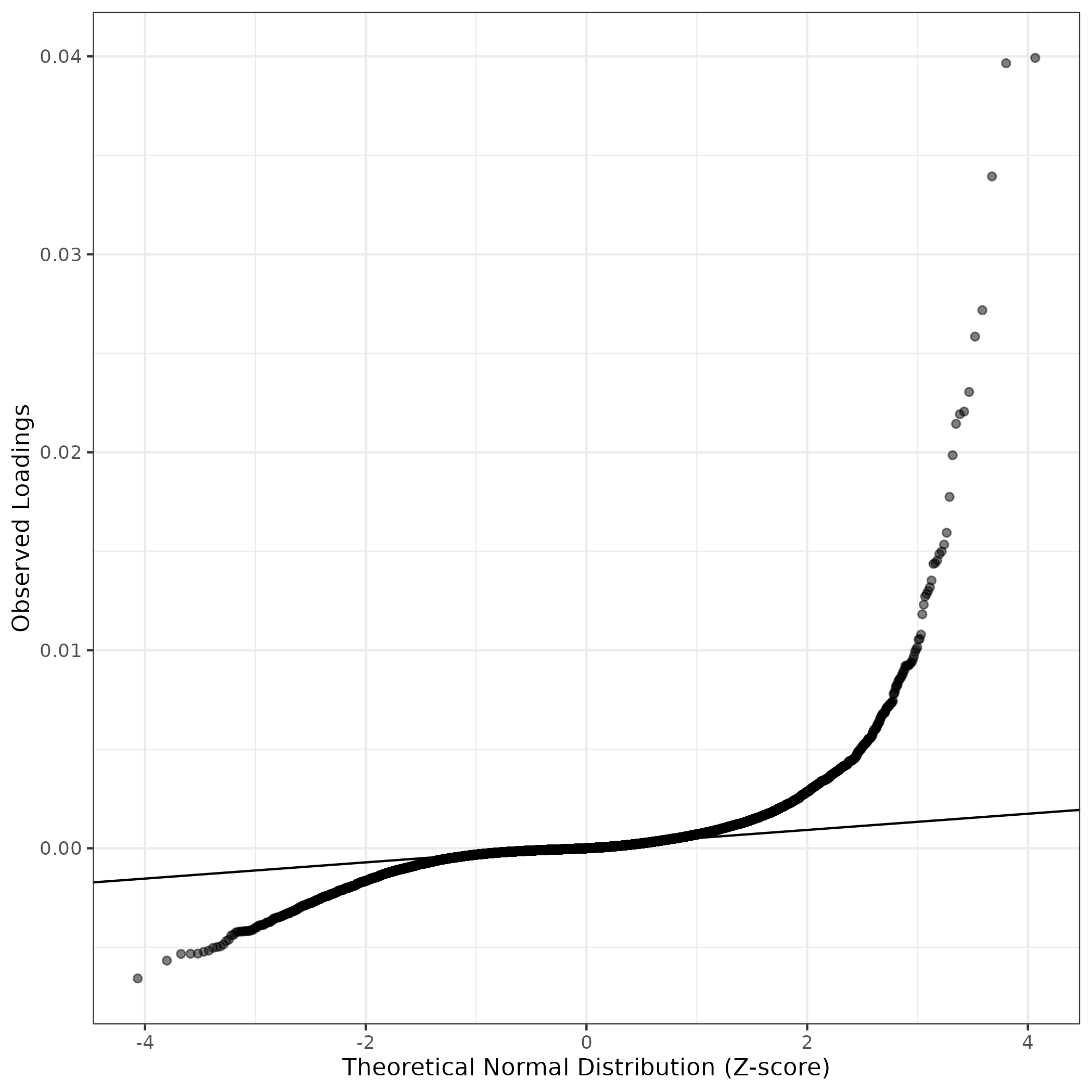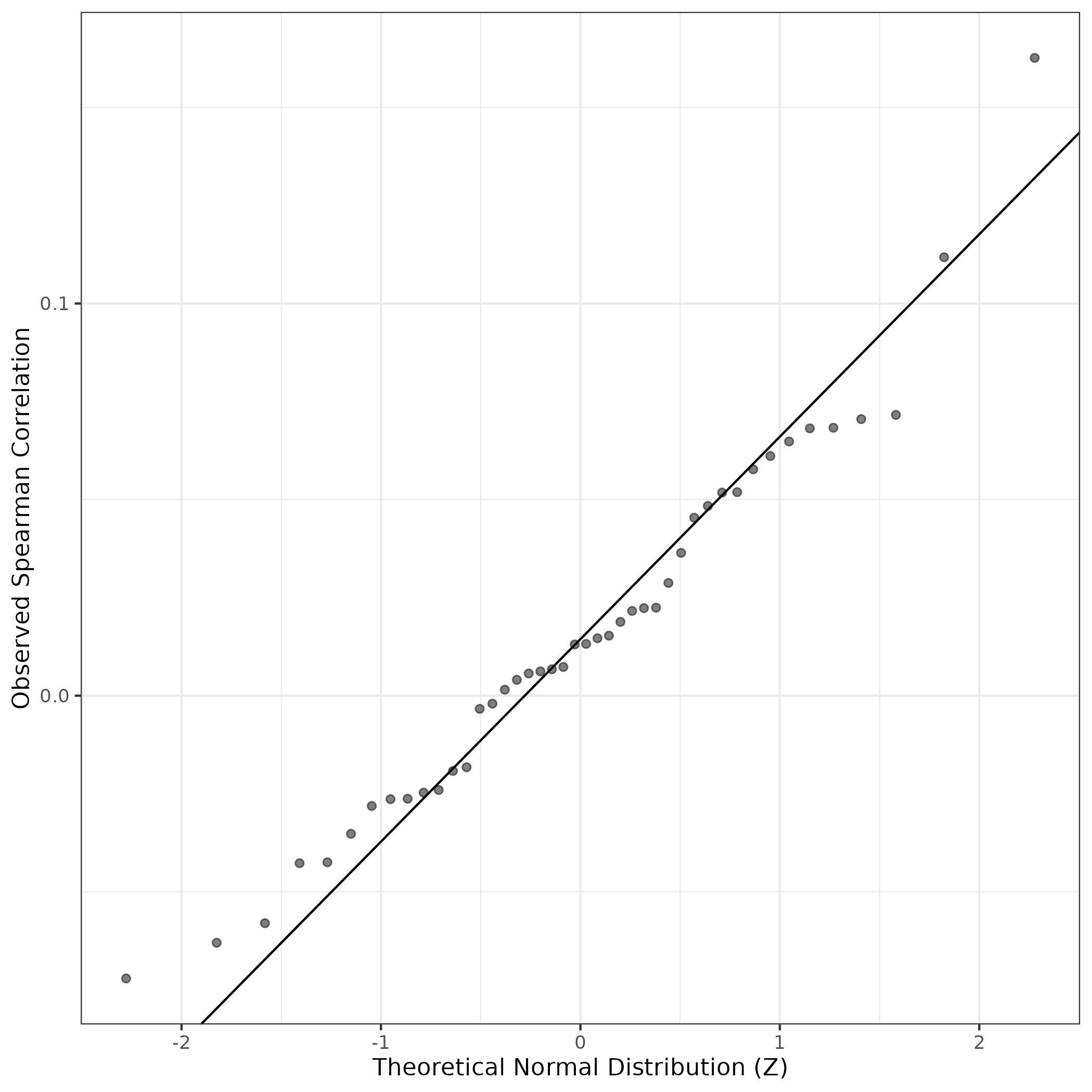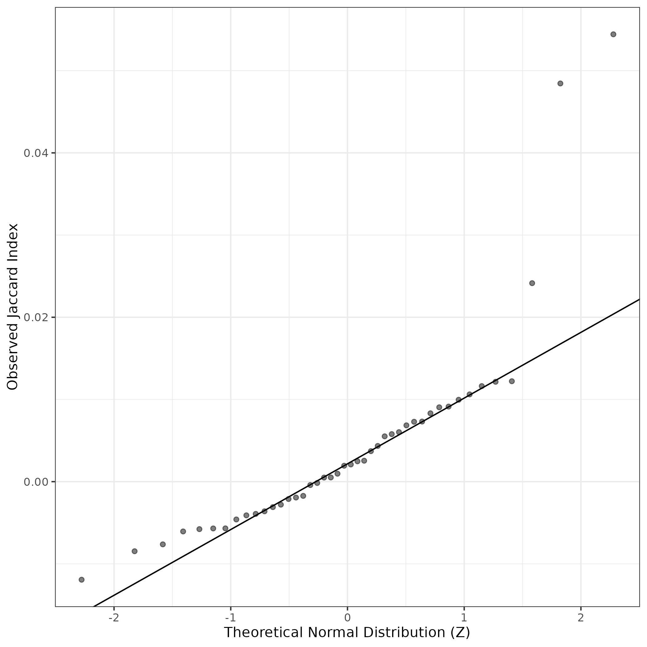 A similar QQ-plot as above, but only for instances where the H value is e.g. > 25, i.e. we are confident that the expression program is active above noise. Agreemenet between these binary vectors is tested using the Jaccard Index, with the P-values calculated by an exact test: