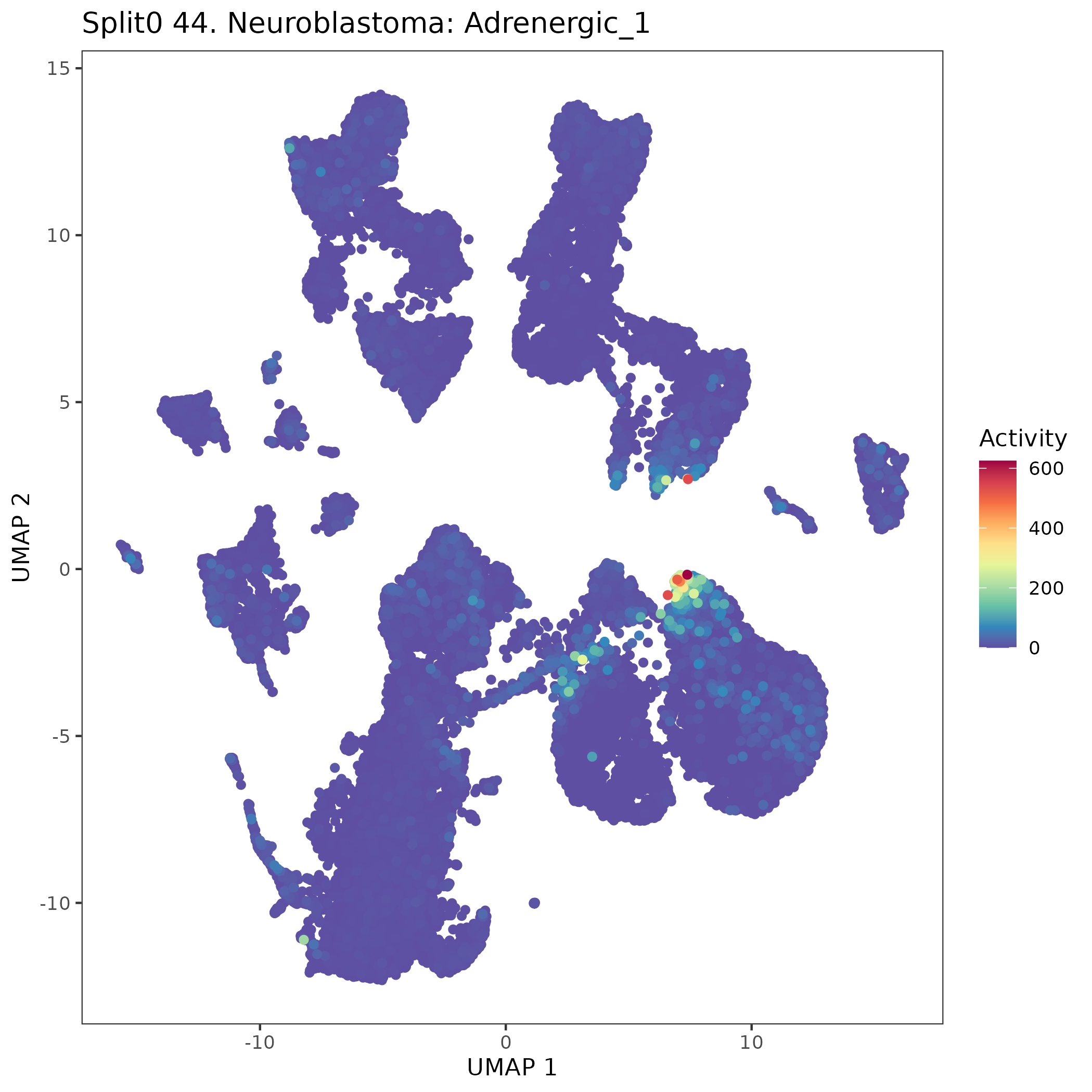 Adrenergic mature (olsen) Stated on pages 6 and 7 of the main text of Olsen et al. https://www.biorxiv.org/content/10.1101/2020.05.04.077057v1 - it is argued that upon reanalysis of the adrenergic neuroblastoma cells, there is further heterogeneity, grouped into proliferating, mature and immature cell populations. These markers are specific to the mature adrenergic cells: Wilcoxon ranksum test P-value for gene set overrepresentation: 8.33e-02 Mean rank of genes in gene set: 5646.67 Rank on gene expression program of genes in gene set: