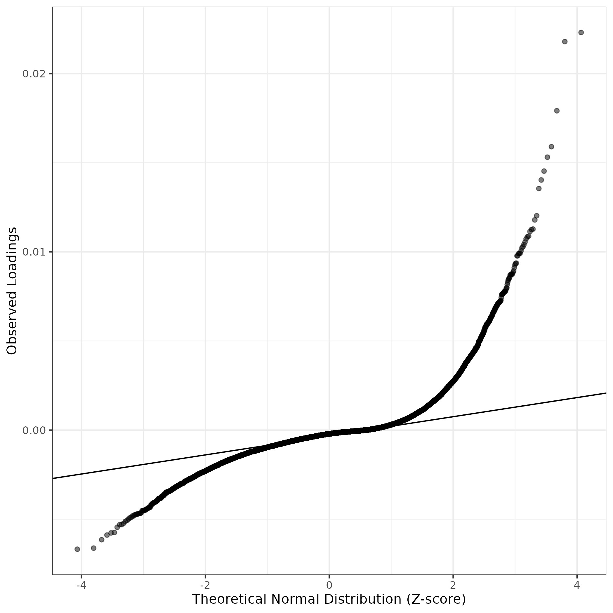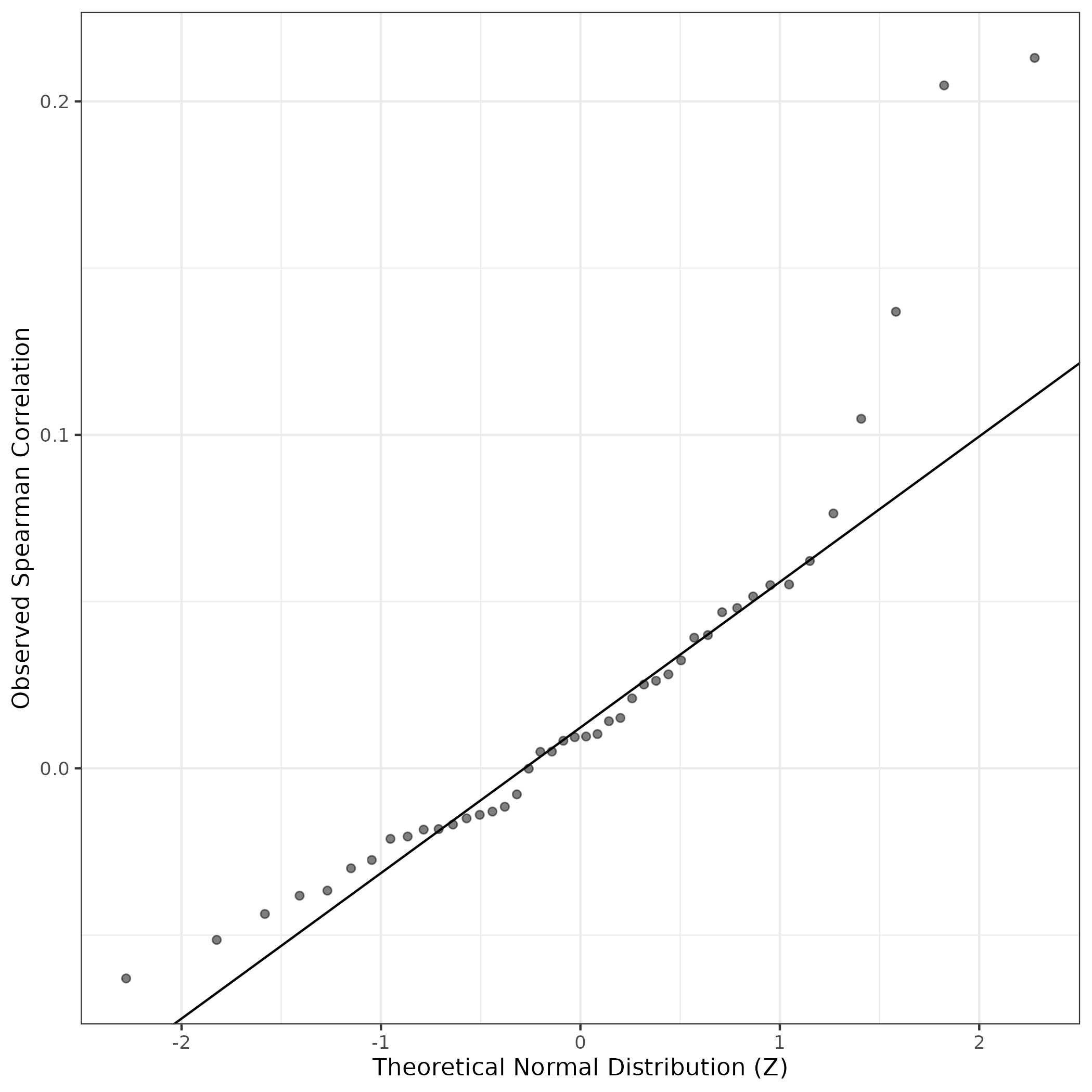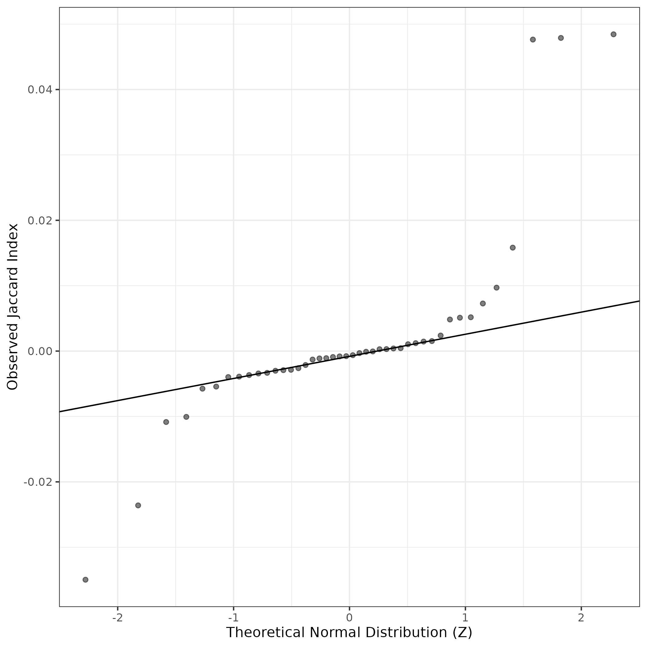 A similar QQ-plot as above, but only for instances where the H value is e.g. > 25, i.e. we are confident that the expression program is active above noise. Agreemenet between these binary vectors is tested using the Jaccard Index, with the P-values calculated by an exact test: