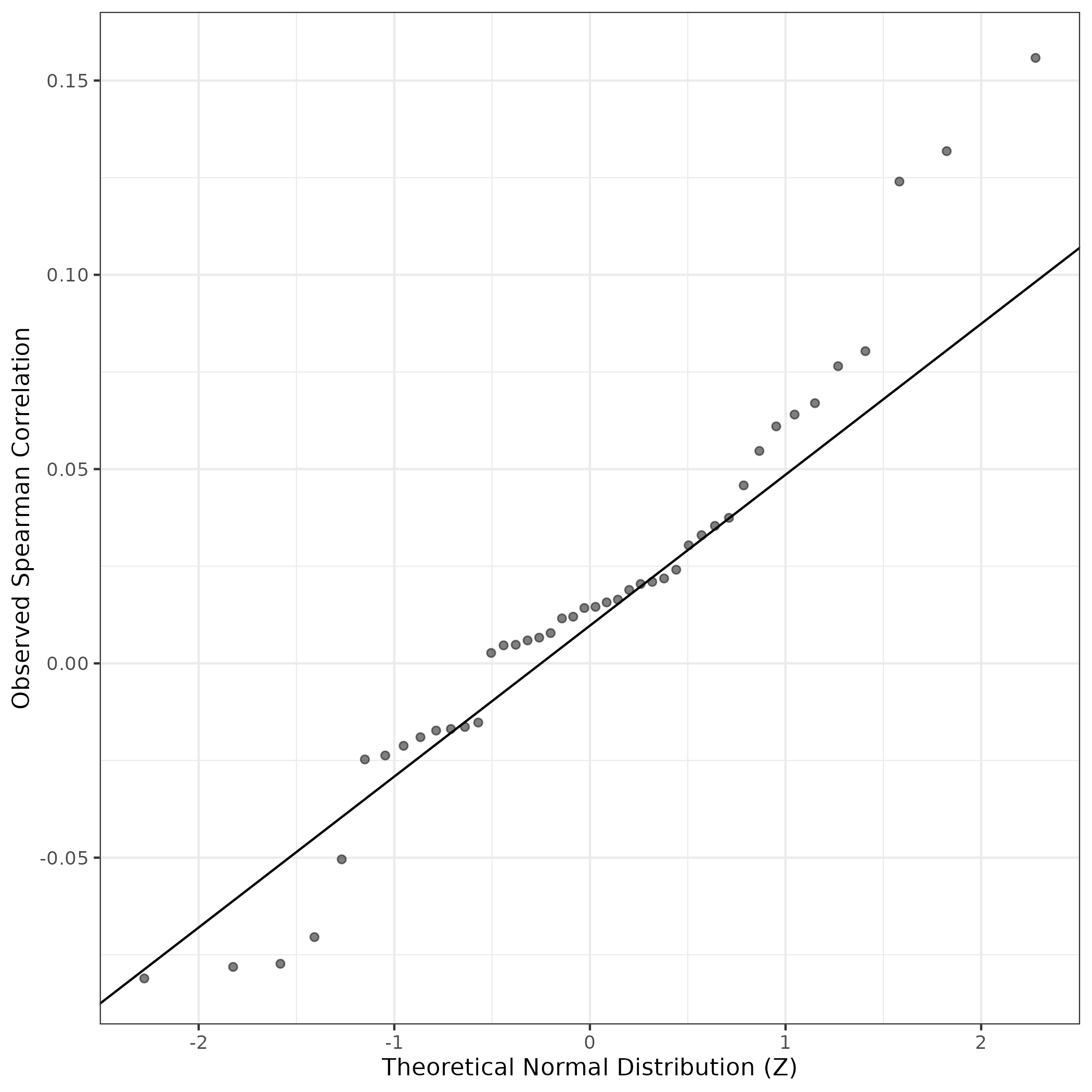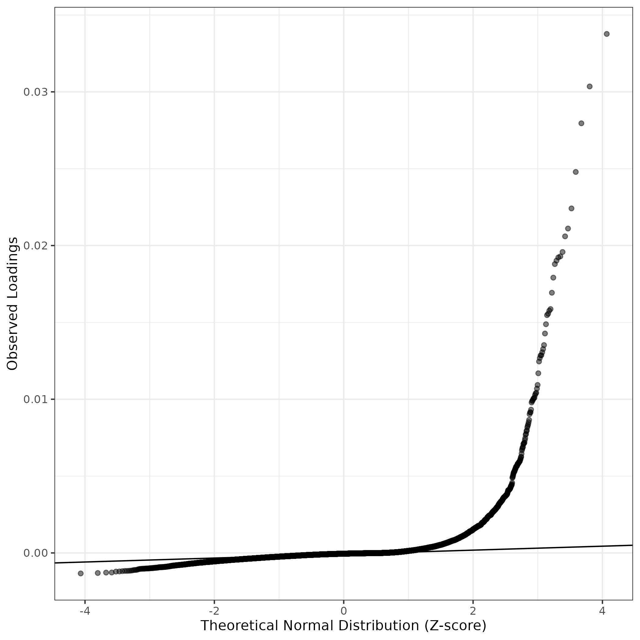QQ-plot of gene loadings, averaged over both independent splits of the data