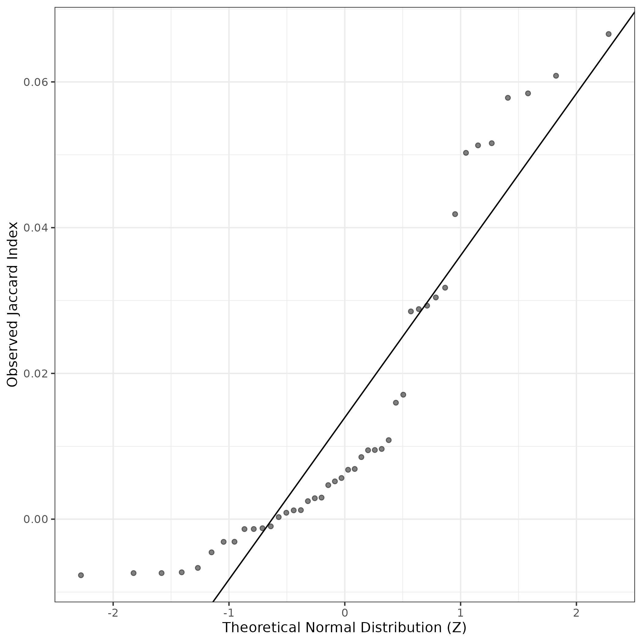 A similar QQ-plot as above, but only for instances where the H value is e.g. > 25, i.e. we are confident that the expression program is active above noise. Agreemenet between these binary vectors is tested using the Jaccard Index, with the P-values calculated by an exact test:
