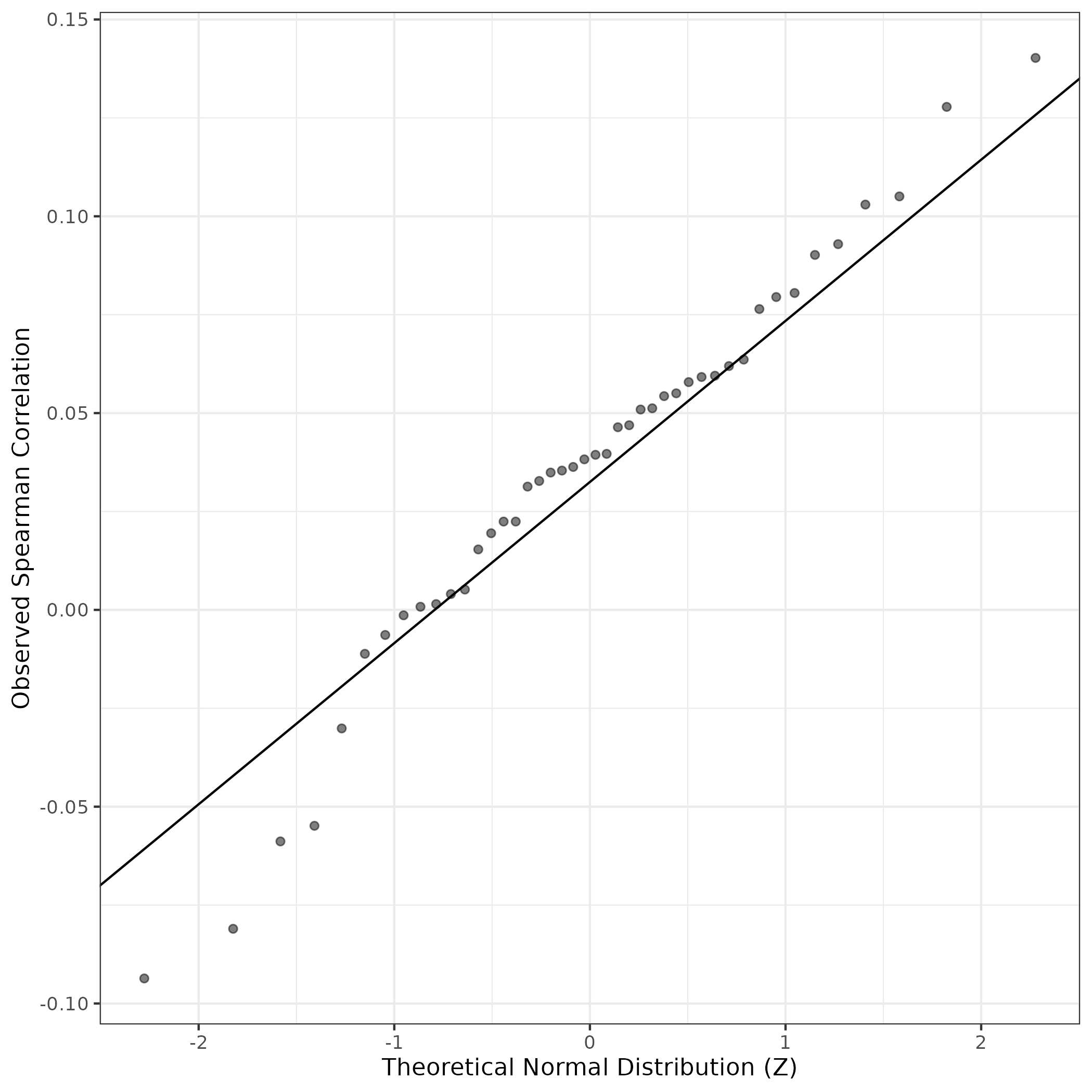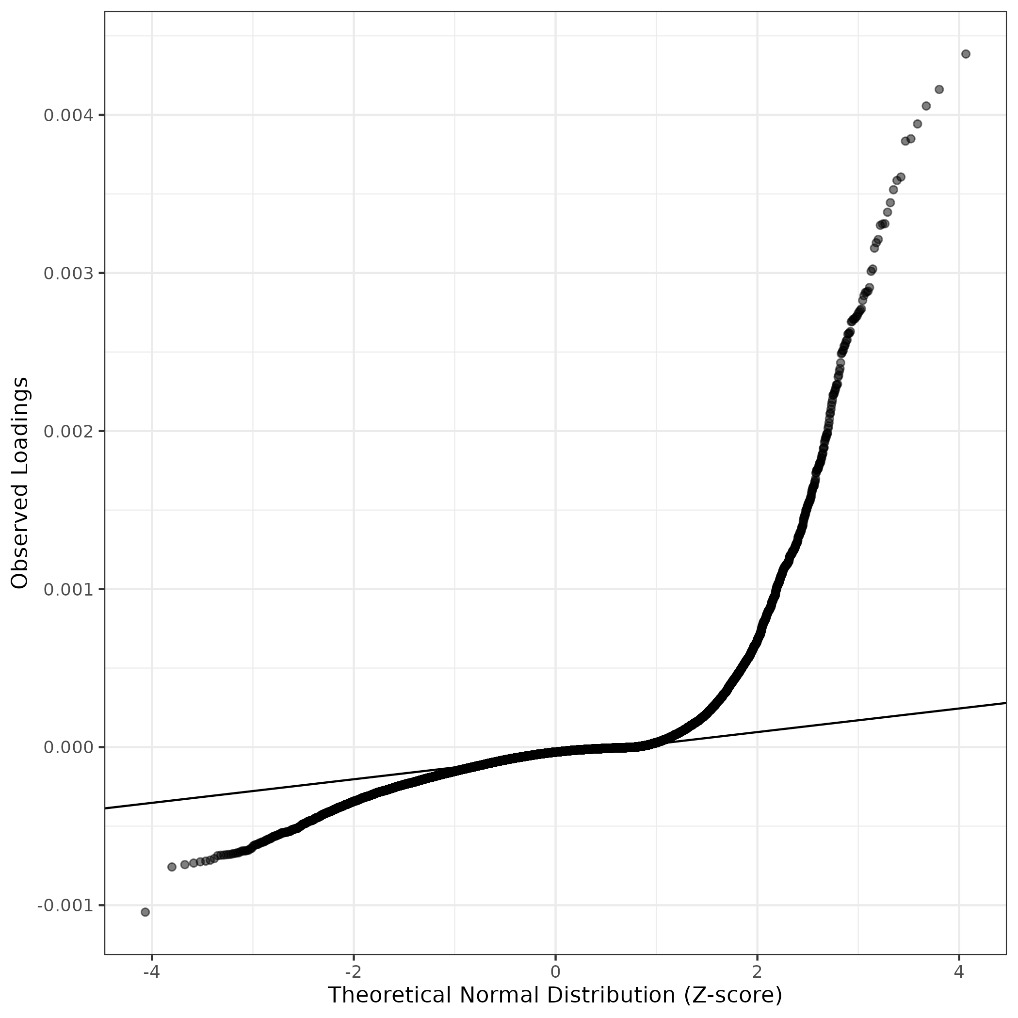 QQ-plot of gene loadings, averaged over both independent splits of the data