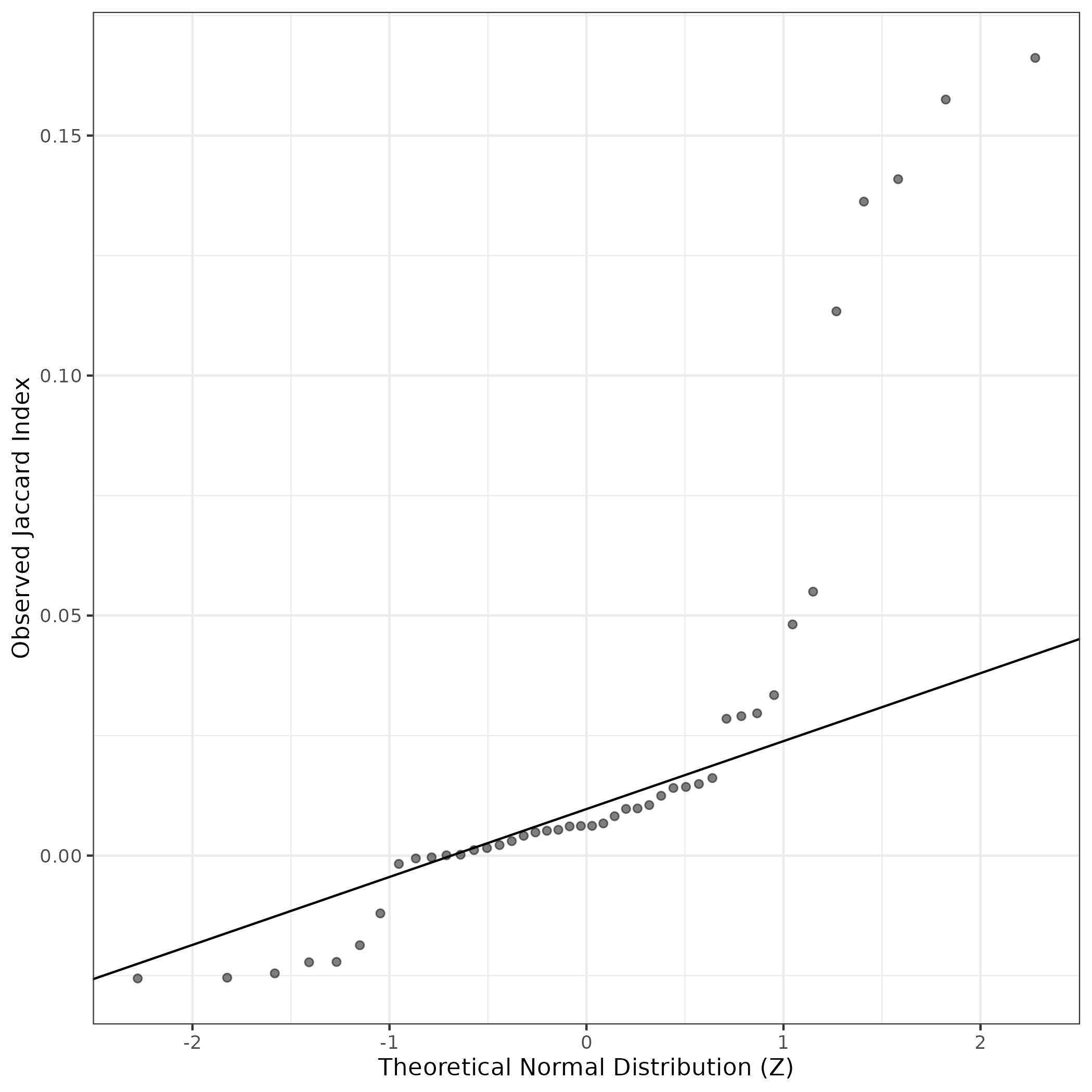 A similar QQ-plot as above, but only for instances where the H value is e.g. > 25, i.e. we are confident that the expression program is active above noise. Agreemenet between these binary vectors is tested using the Jaccard Index, with the P-values calculated by an exact test: