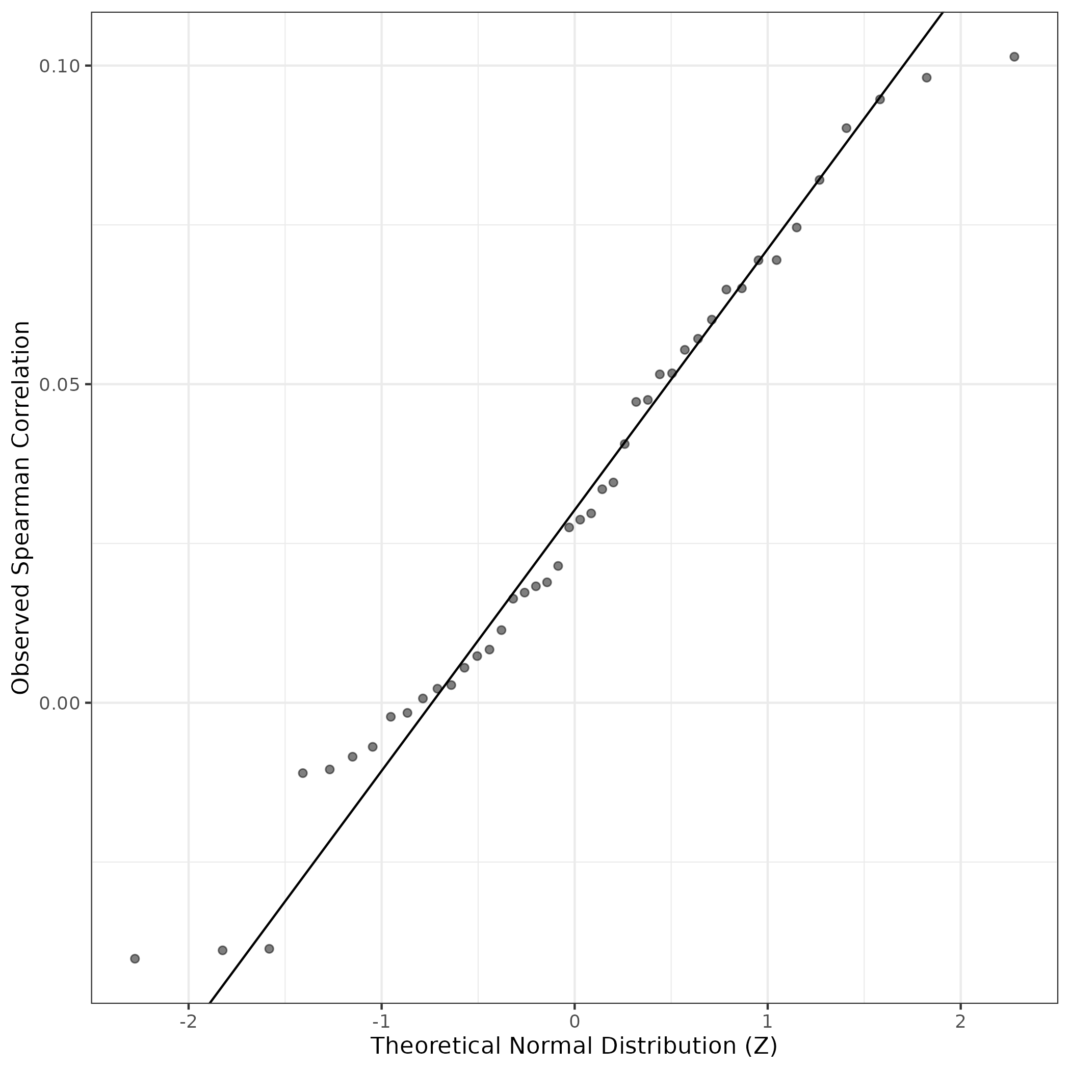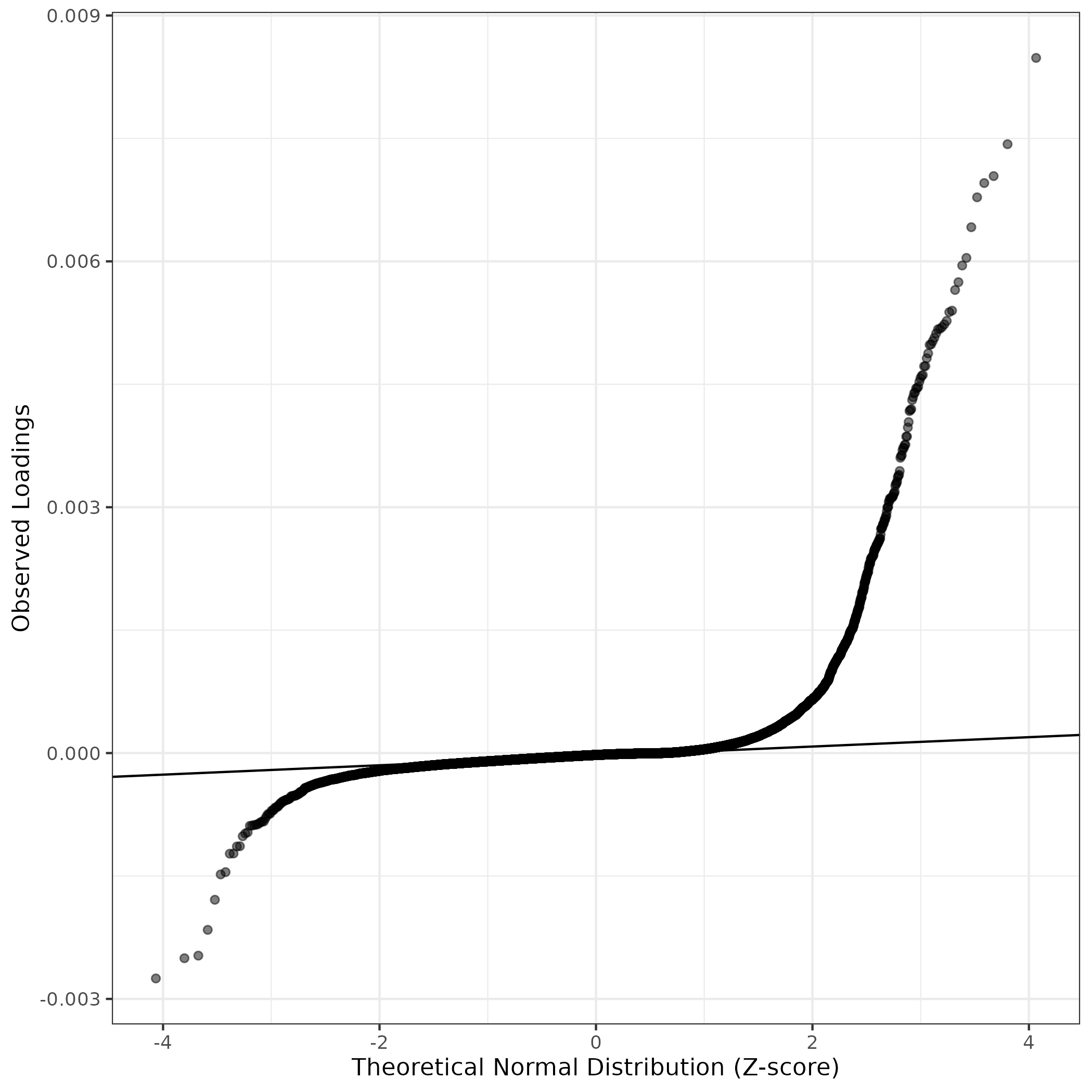 QQ-plot of gene loadings, averaged over both independent splits of the data