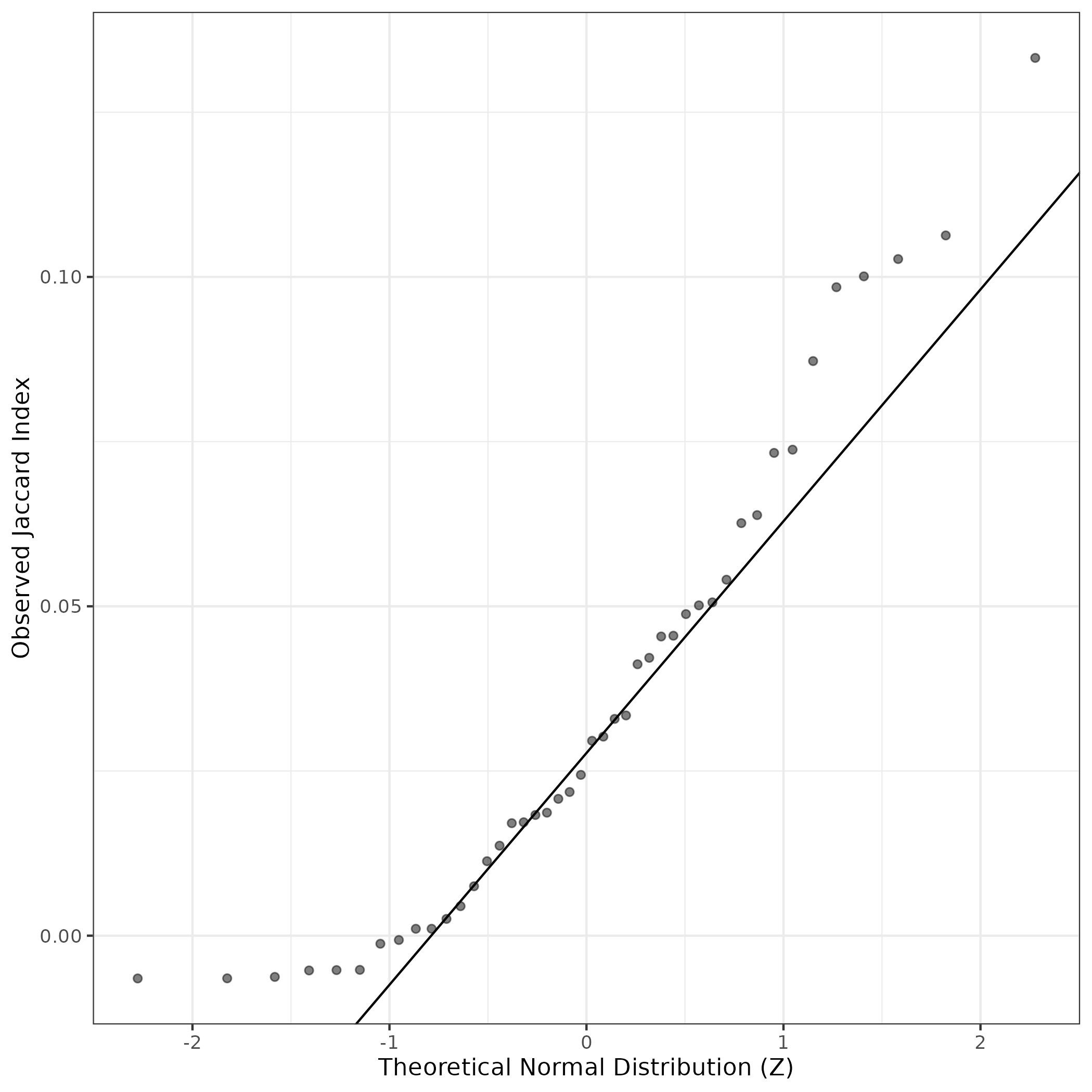 A similar QQ-plot as above, but only for instances where the H value is e.g. > 25, i.e. we are confident that the expression program is active above noise. Agreemenet between these binary vectors is tested using the Jaccard Index, with the P-values calculated by an exact test: