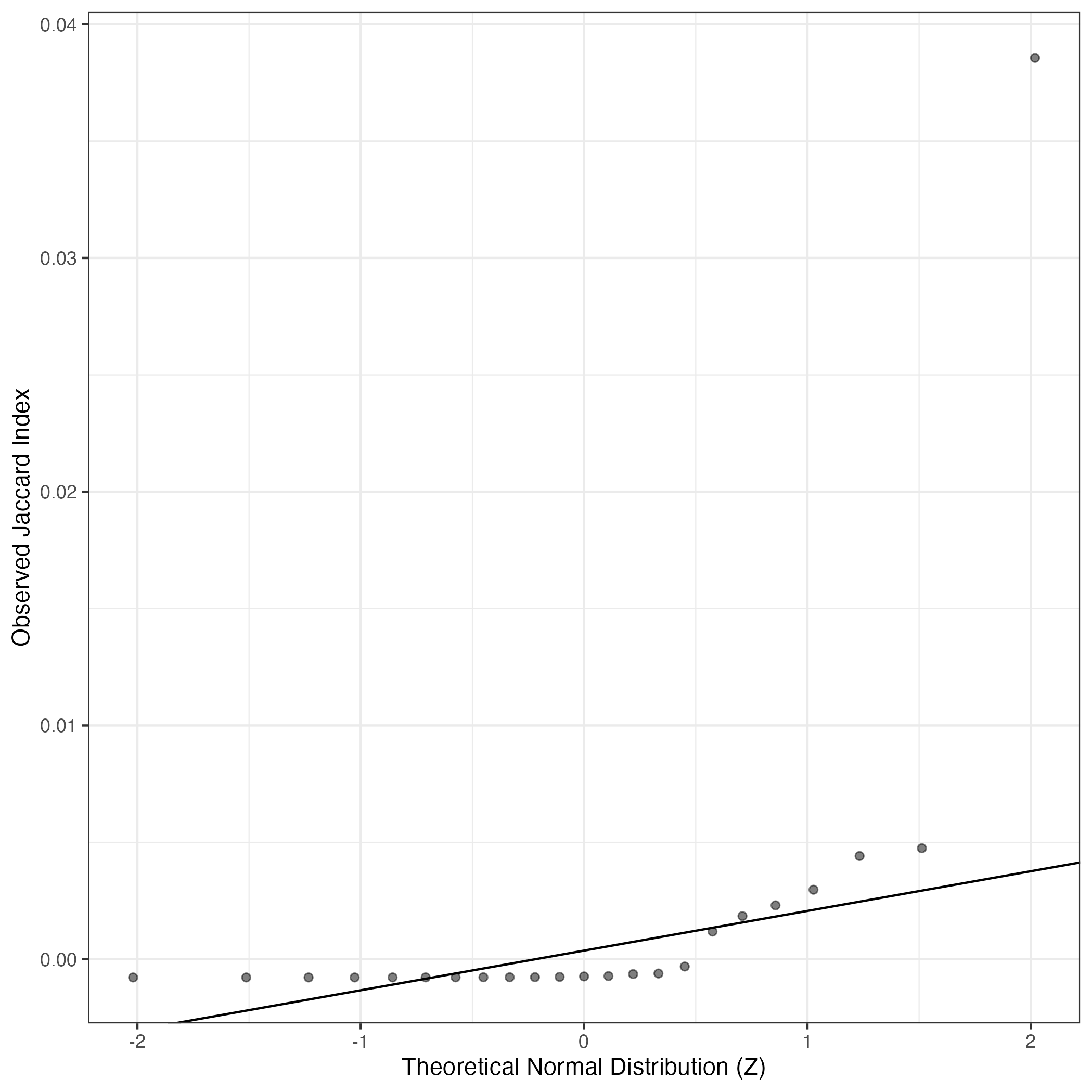 A similar QQ-plot as above, but only for instances where the H value is e.g. > 25, i.e. we are confident that the expression program is active above noise. Agreemenet between these binary vectors is tested using the Jaccard Index, with the P-values calculated by an exact test: