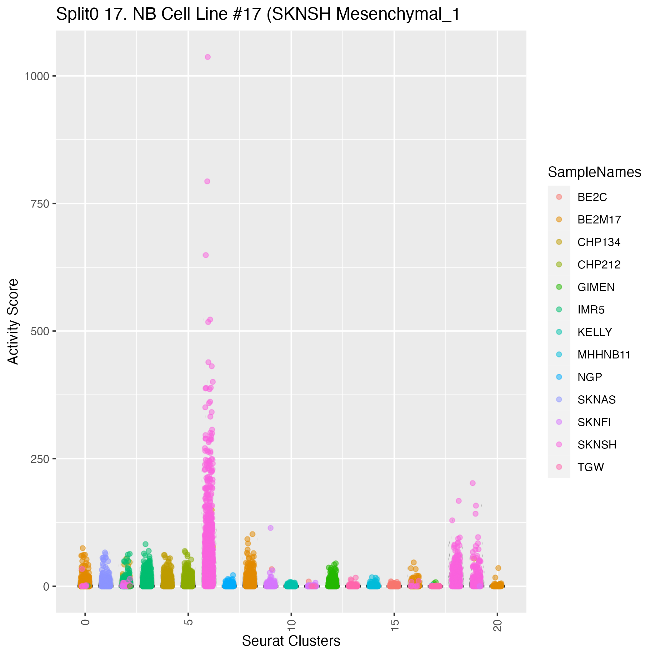 Mesemchymal validated (Olsen) Stated on pages 7 and 8 of the main text of Olsen et al. https://www.biorxiv.org/content/10.1101/2020.05.04.077057v1 - it is stated that a mesenchymal-like neuroblastoma cell state is validate by combined immunofluorescence staining for PDGFRA and FISH for PPMID gain, a gene on 17q.: Wilcoxon ranksum test P-value for gene set overrepresentation: 7.46e-01 Mean rank of genes in gene set: 8675 Rank on gene expression program of genes in gene set: