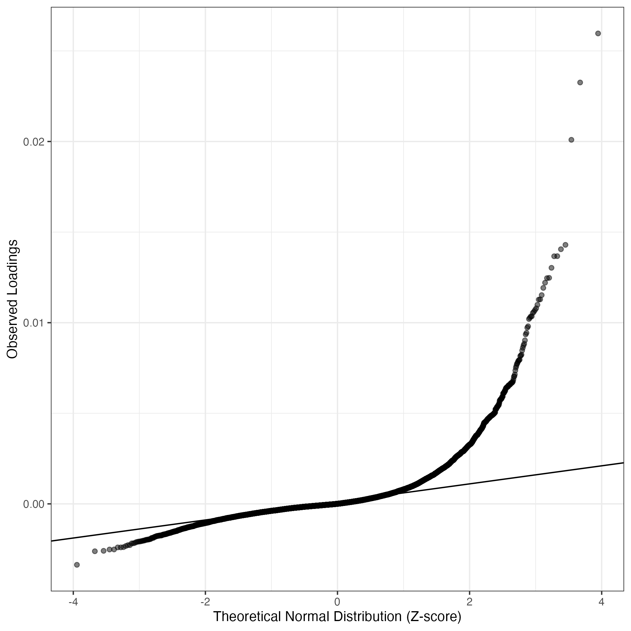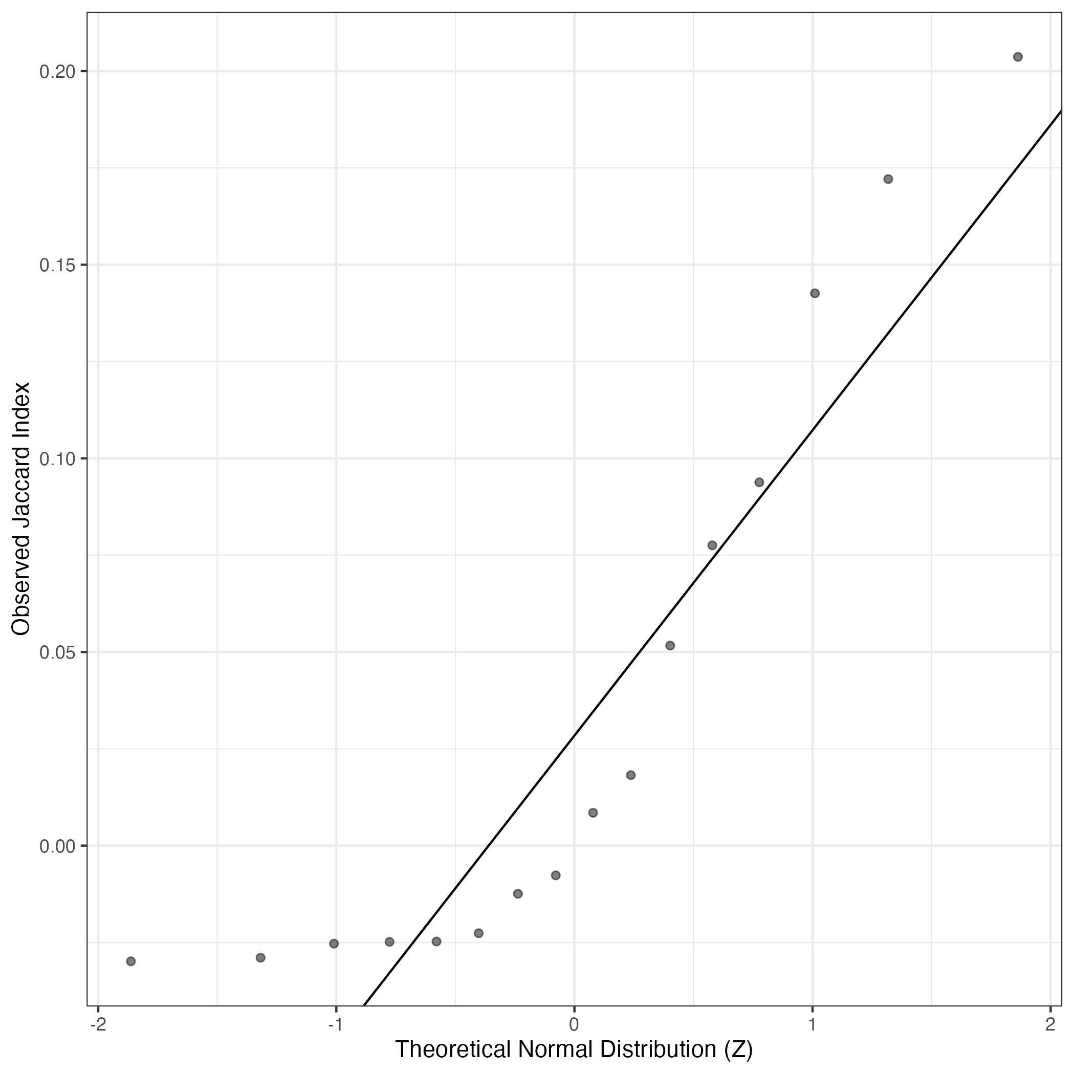 A similar QQ-plot as above, but only for instances where the H value is e.g. > 25, i.e. we are confident that the expression program is active above noise. Agreemenet between these binary vectors is tested using the Jaccard Index, with the P-values calculated by an exact test: