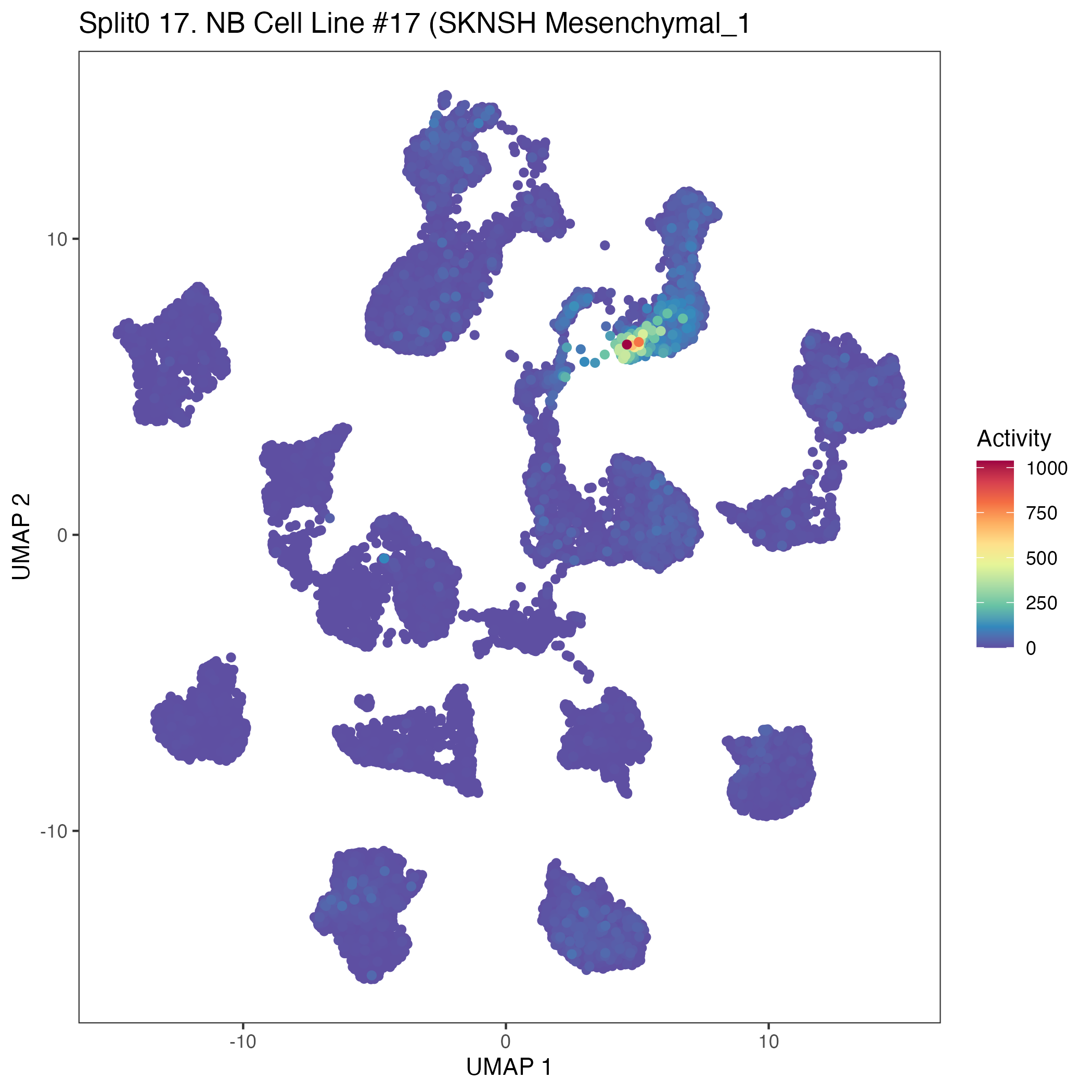 SCPs neuroblastoma unique (Olsen) Similar to above, but for genes unique to neuroblastoma SCP-like cells. Note FN1 is often used as a mesenchymal marker gene.: Wilcoxon ranksum test P-value for gene set overrepresentation: 8.66e-01 Mean rank of genes in gene set: 7910 Rank on gene expression program of genes in gene set: