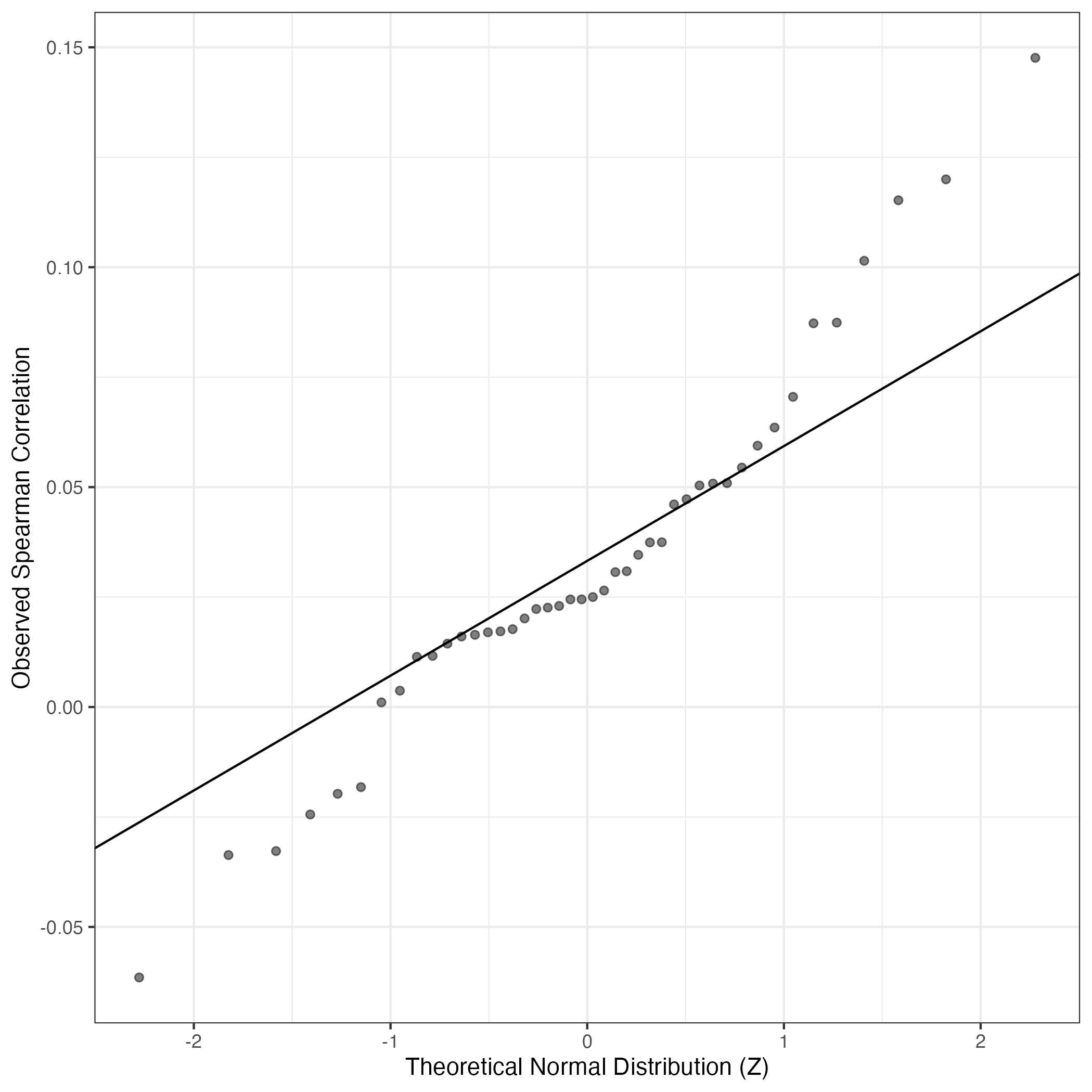 QQ-plot of gene loadings, averaged over both independent splits of the data