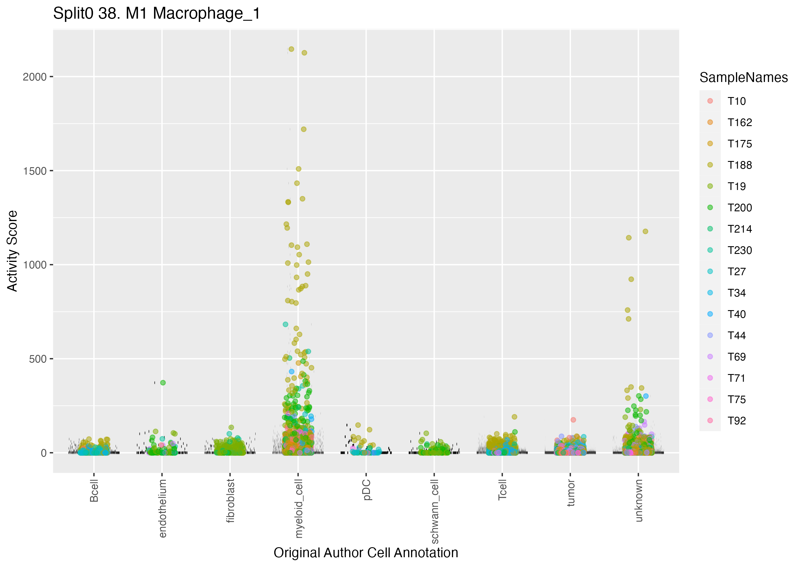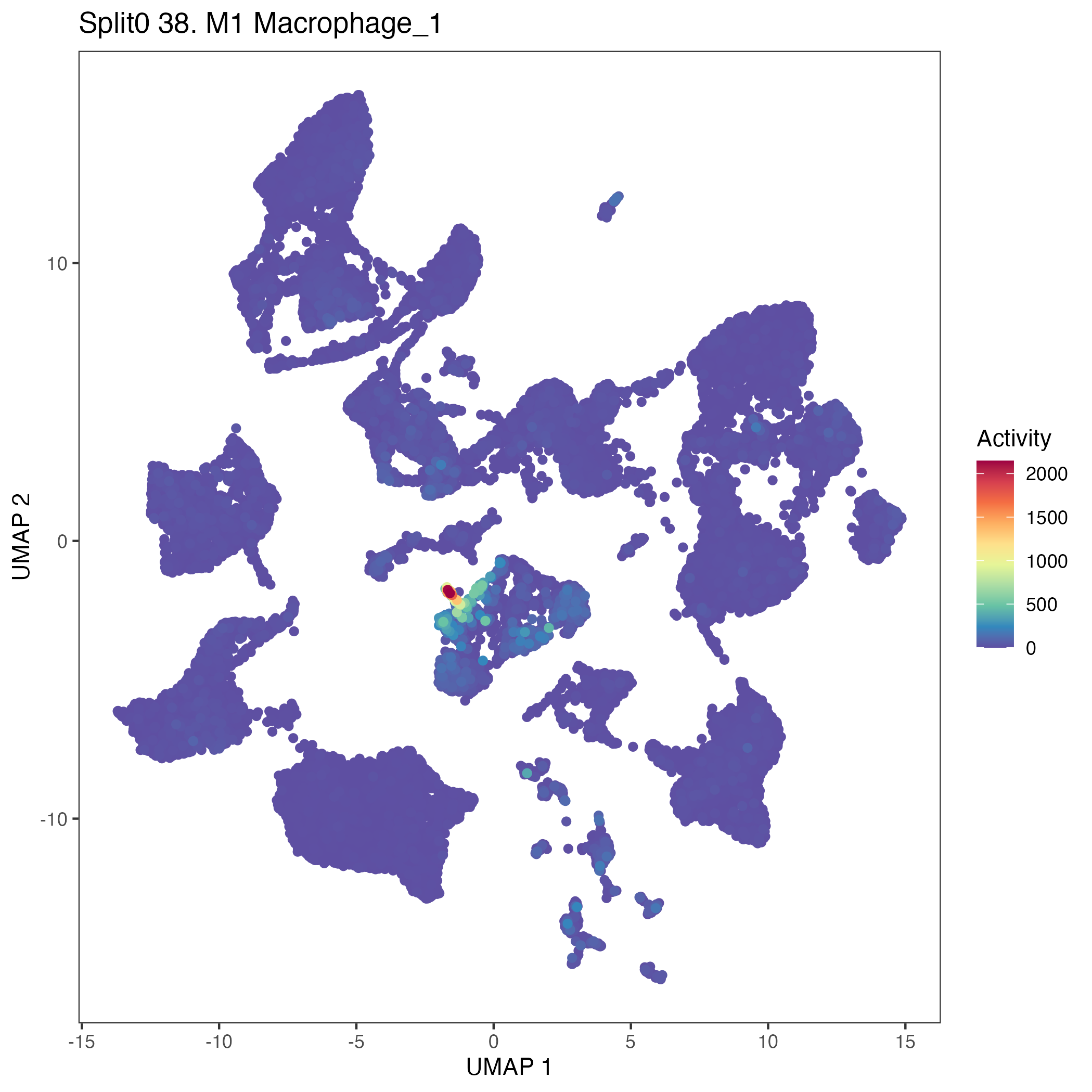 UMAP plots showing activity of gene expression program identified in GEP 38. M1 Macrophage: