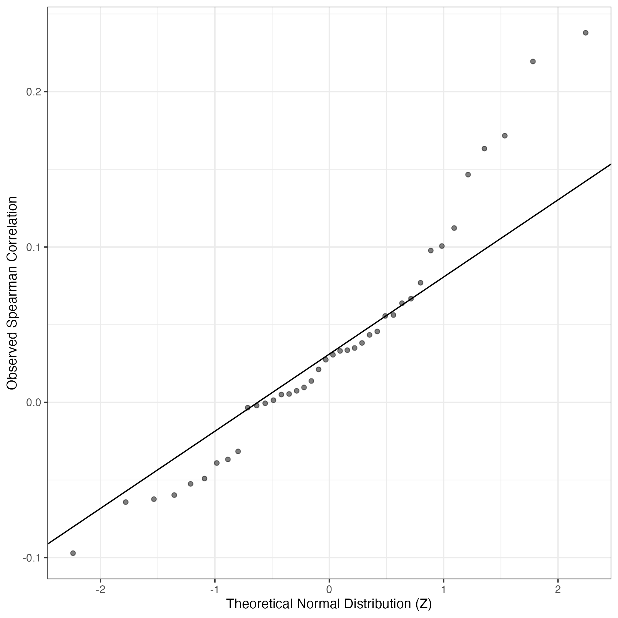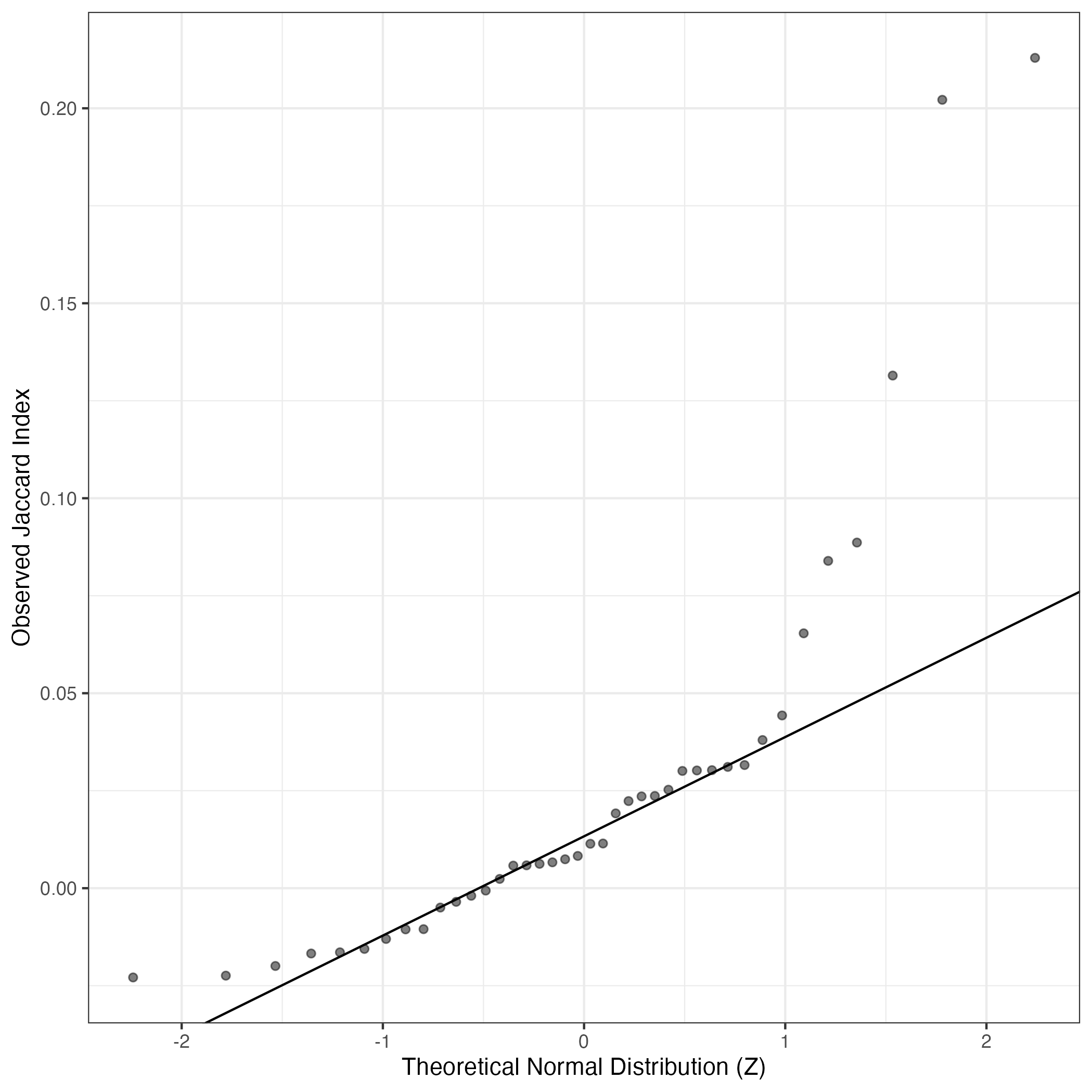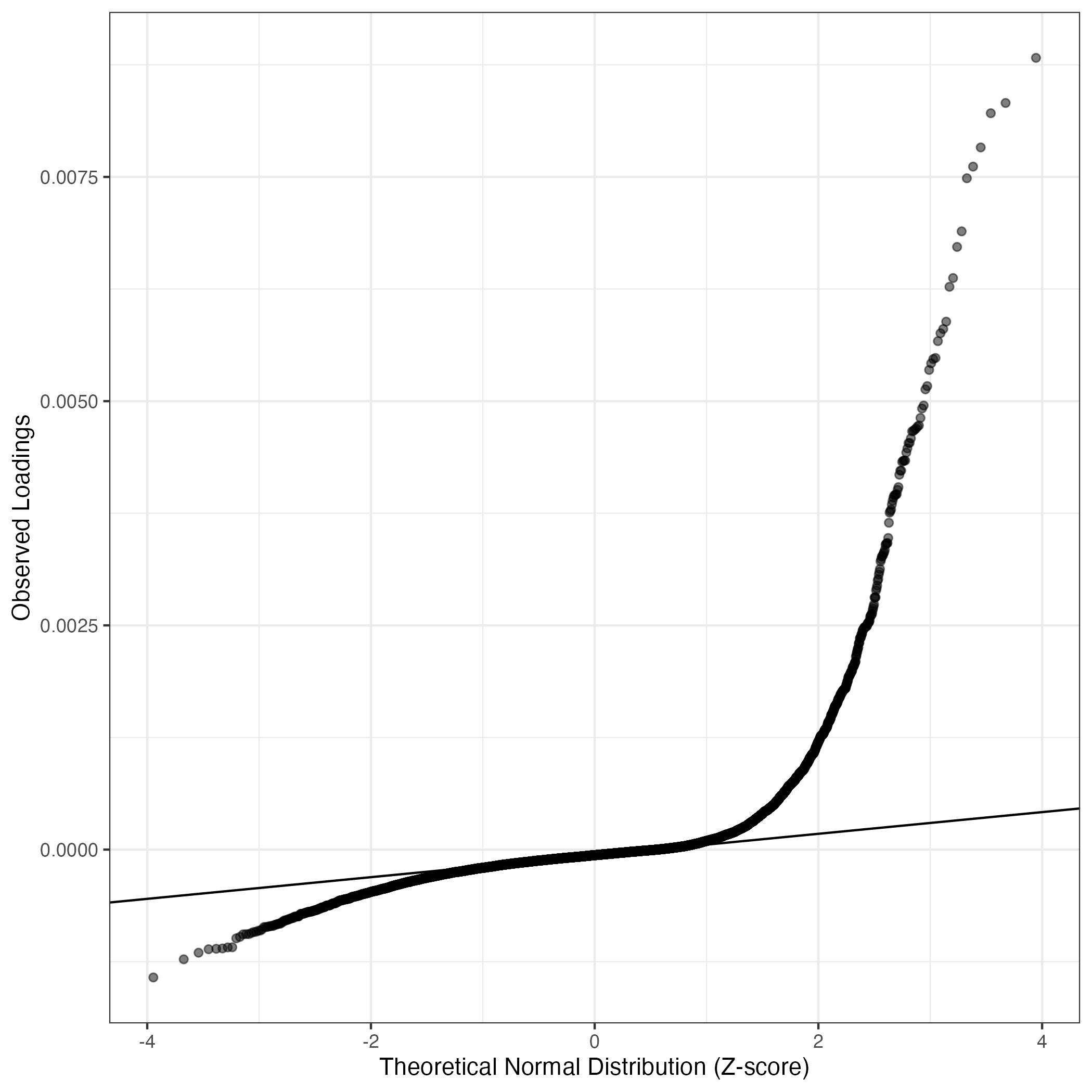 QQ-plot of gene loadings, averaged over both independent splits of the data