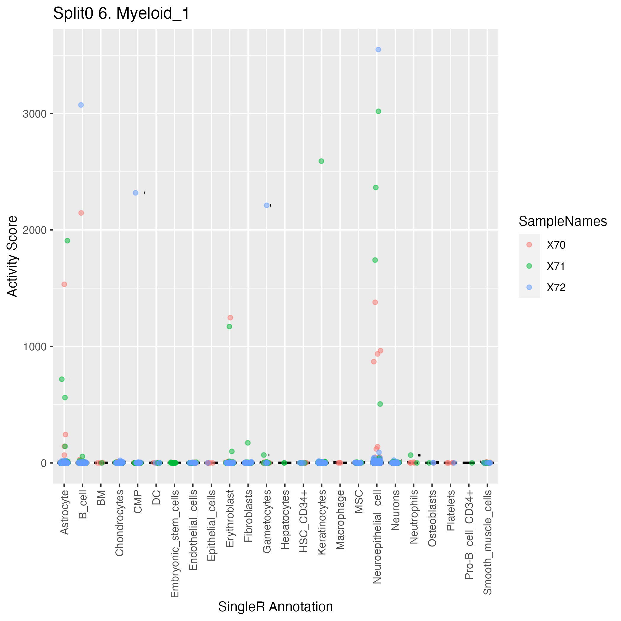 Granulocytes: Granulocytes (model markers) cells of innate immune system with specific granules in the cytoplasm including neutrophils: Wilcoxon ranksum test P-value for gene set overrepresentation: 1.87e-01 Mean rank of genes in gene set: 6795.33 Rank on gene expression program of genes in gene set: