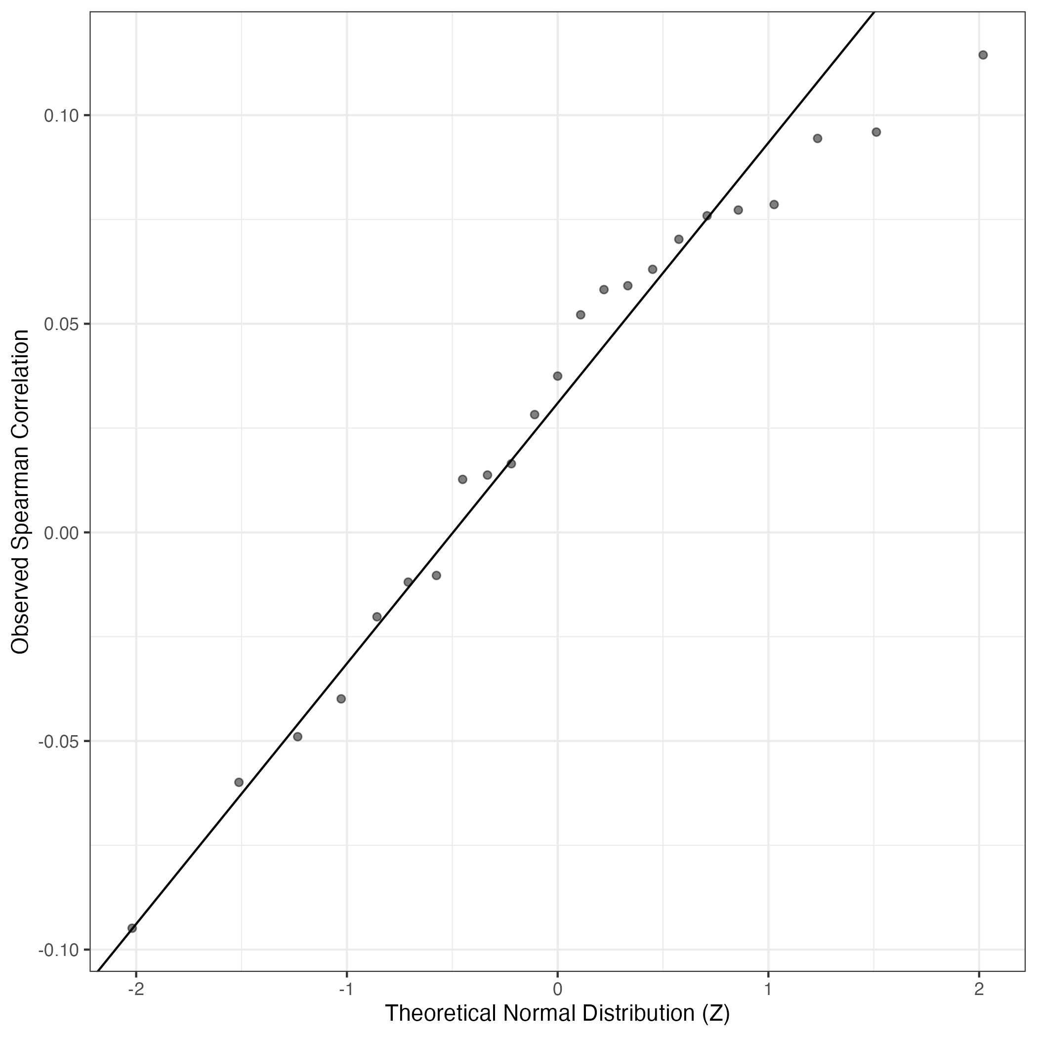 A similar QQ-plot as above, but only for instances where the H value is e.g. > 25, i.e. we are confident that the expression program is active above noise. Agreemenet between these binary vectors is tested using the Jaccard Index, with the P-values calculated by an exact test: