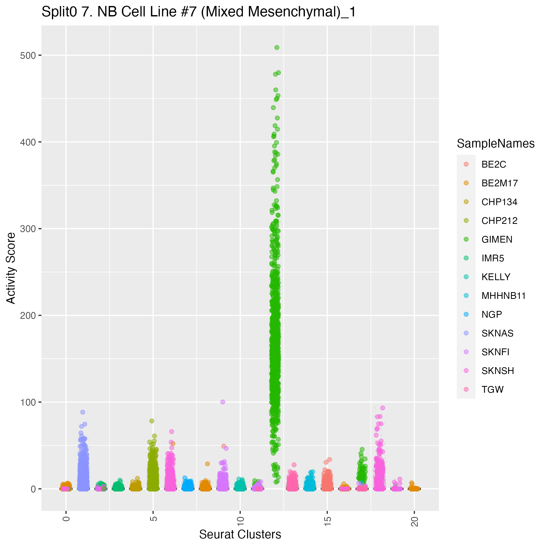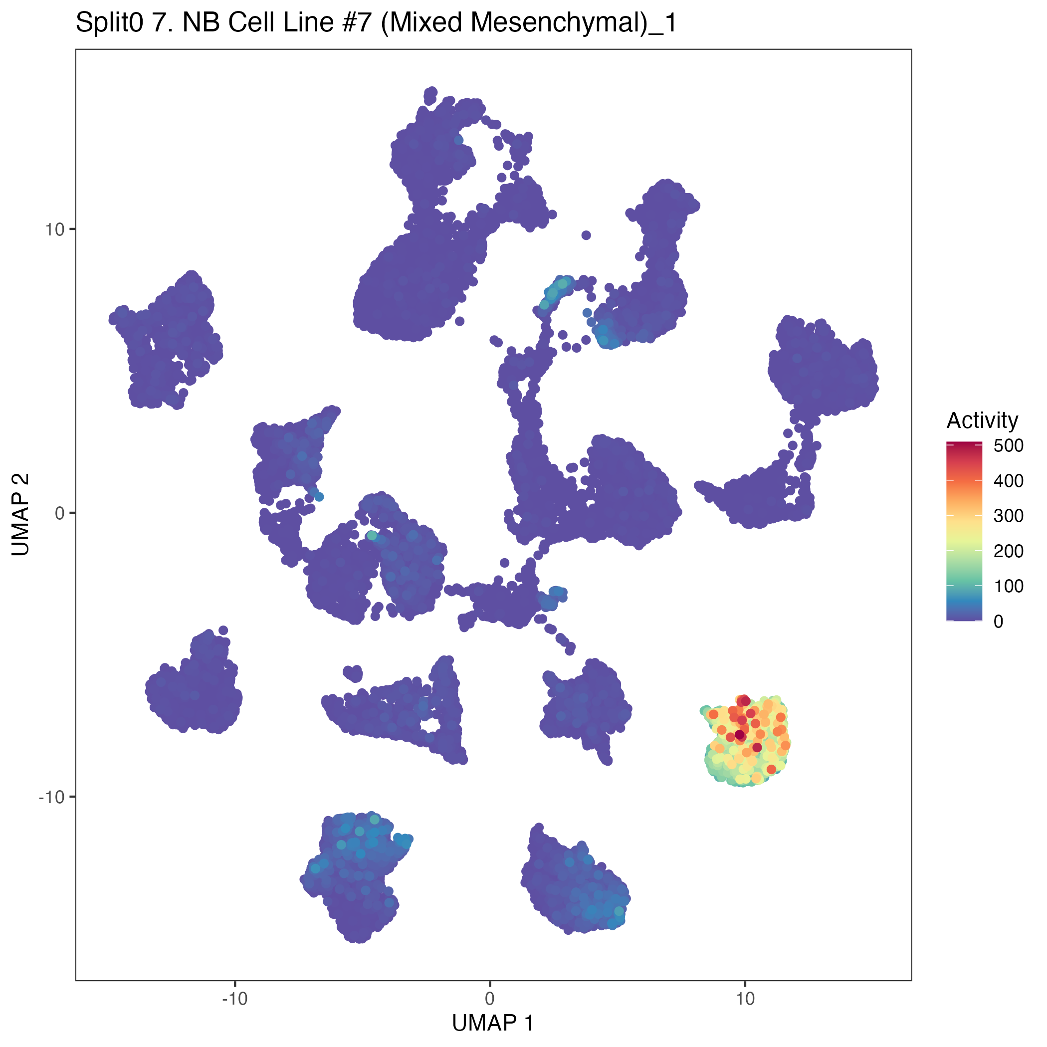 UMAP plots showing activity of gene expression program identified in community:7. NB Cell Line #7 (Mixed Mesenchymal)