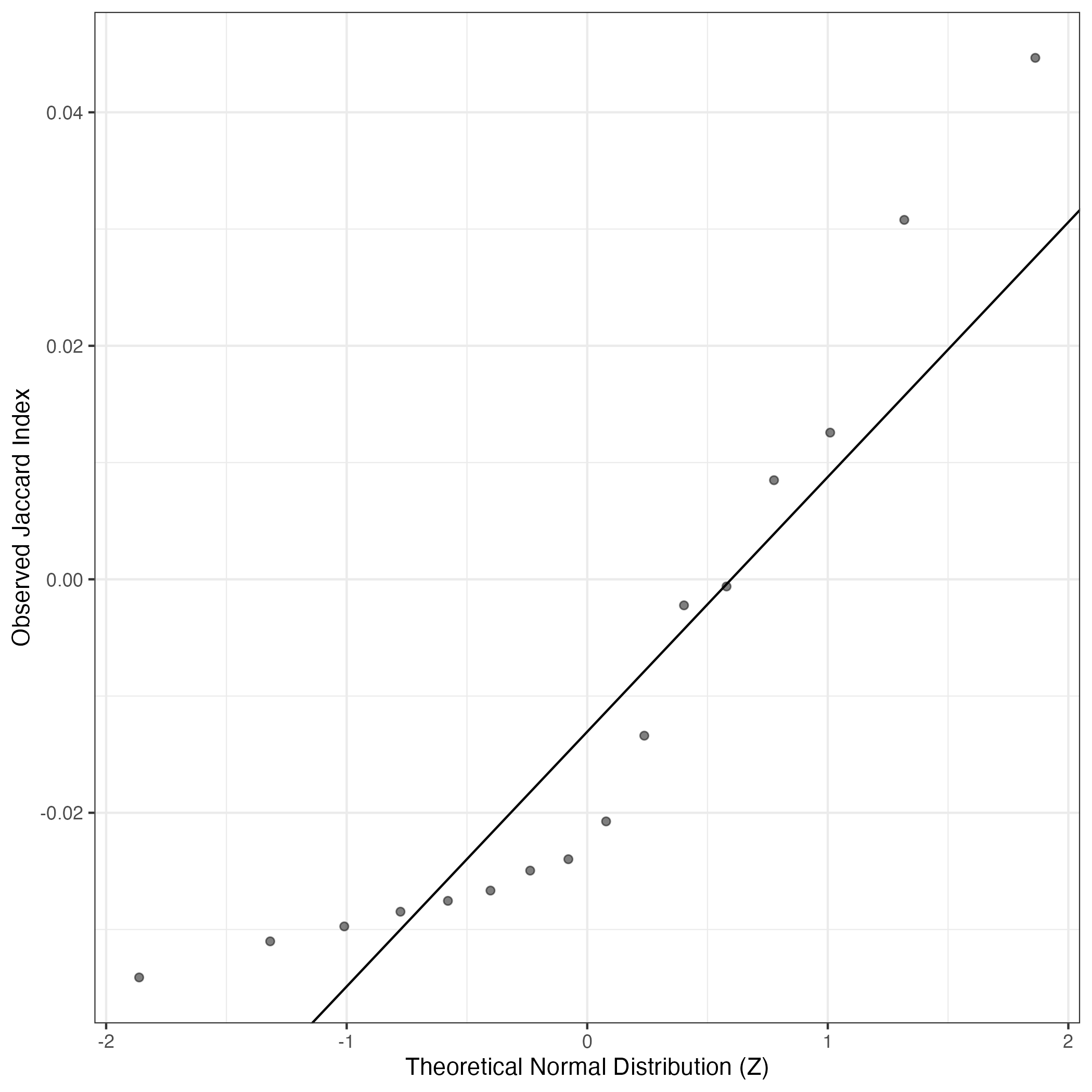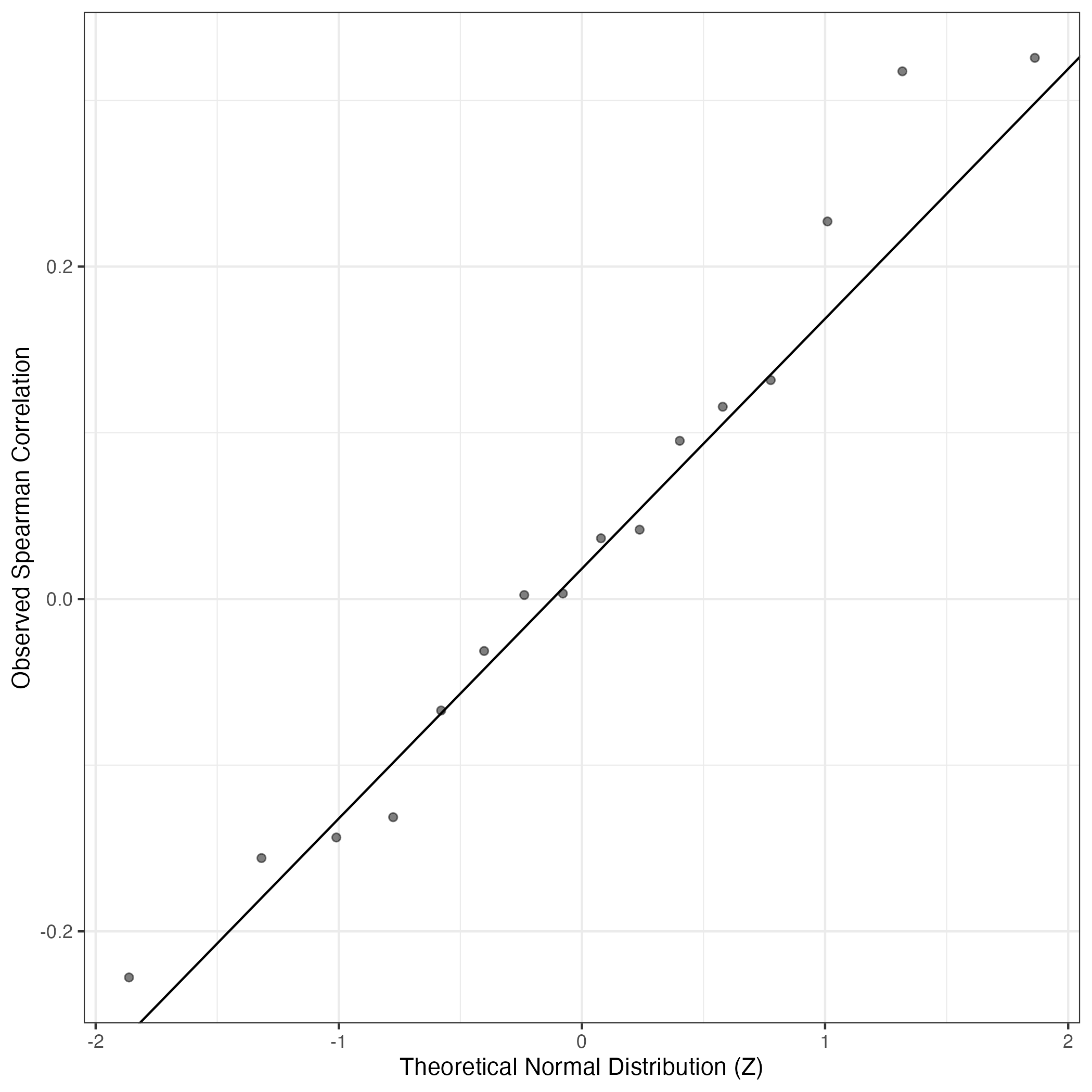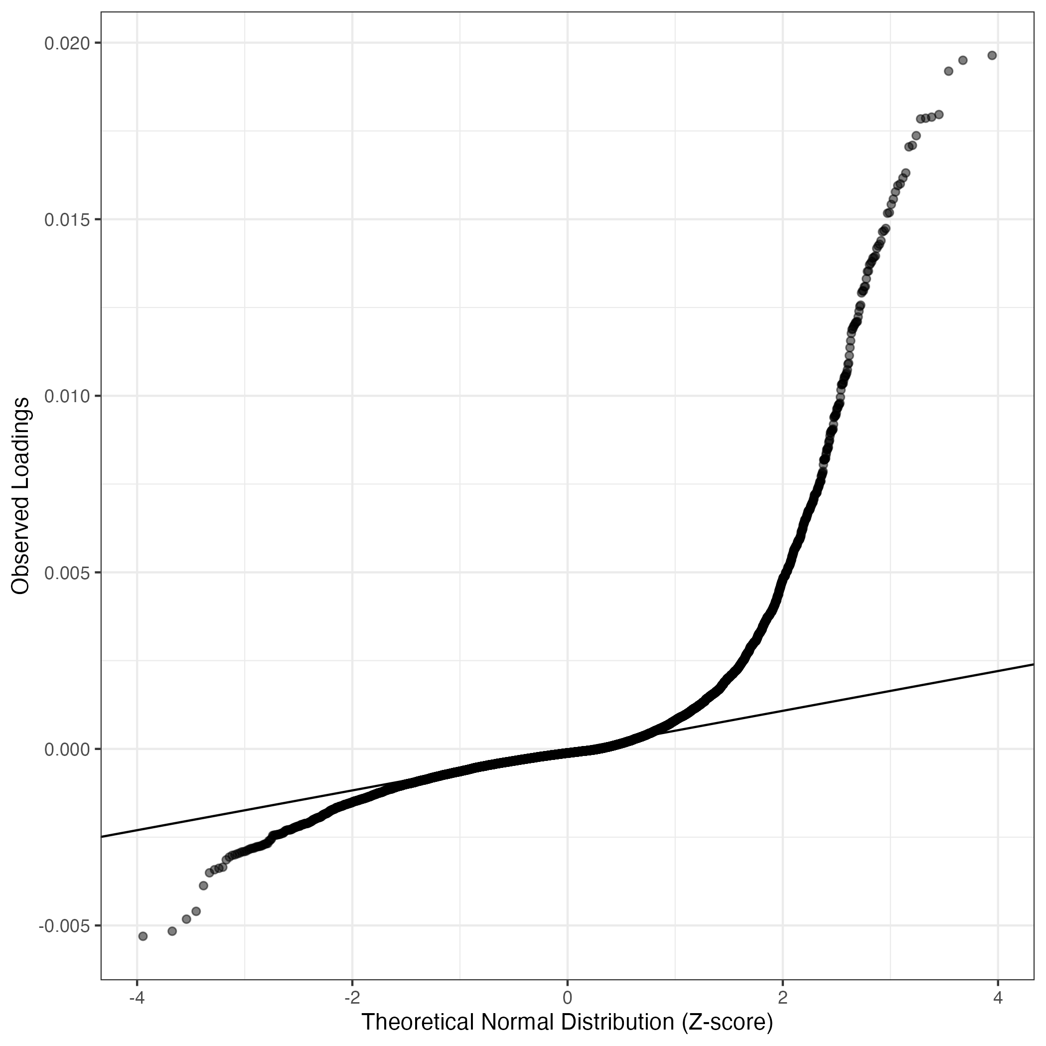 QQ-plot of gene loadings, averaged over both independent splits of the data