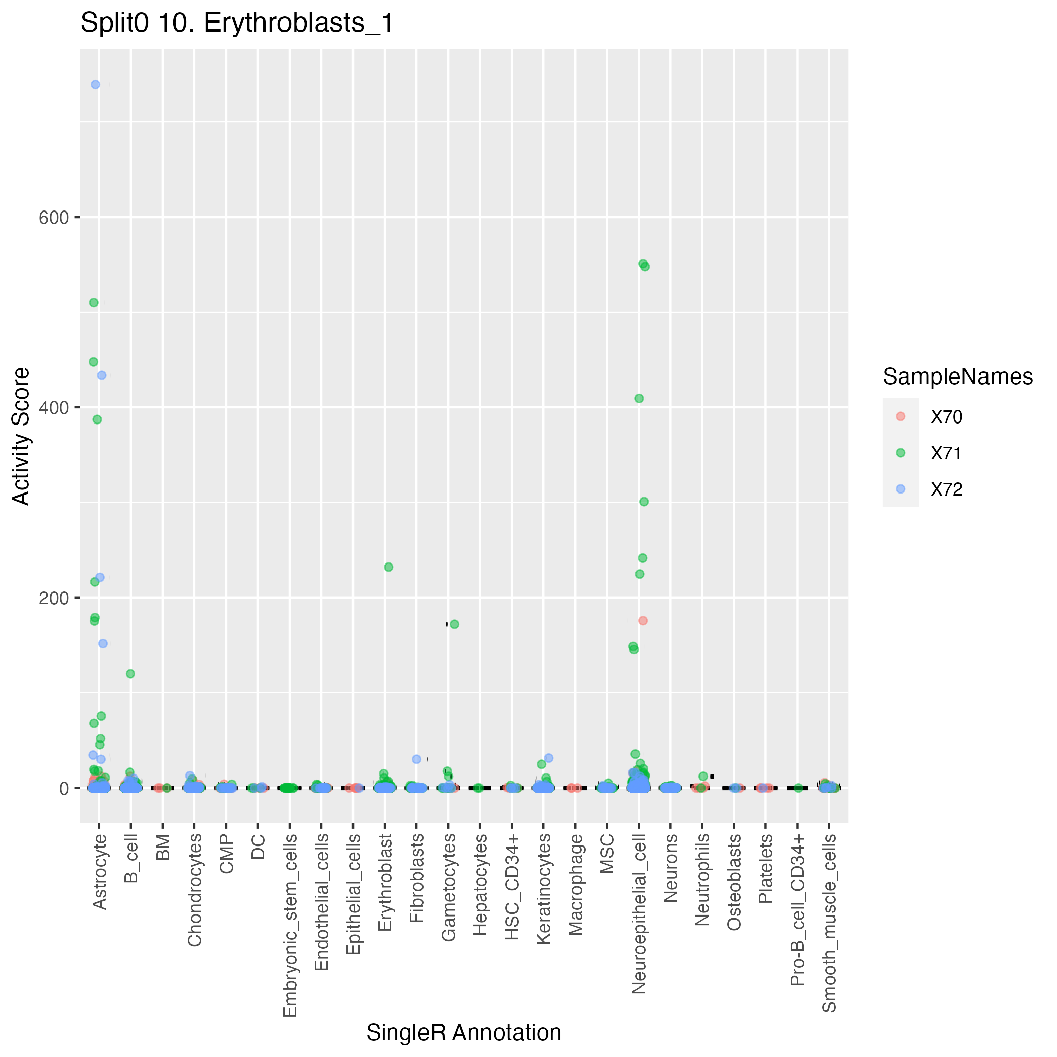 Erythrocytes: Erythrocytes (model markers) biconcave enucleated red blood cells filled with hemoglobin to transport oxygen and carbon dioxide between the lungs and tissues: Wilcoxon ranksum test P-value for gene set overrepresentation: 4.16e-01 Mean rank of genes in gene set: 8829.5 Rank on gene expression program of genes in gene set: