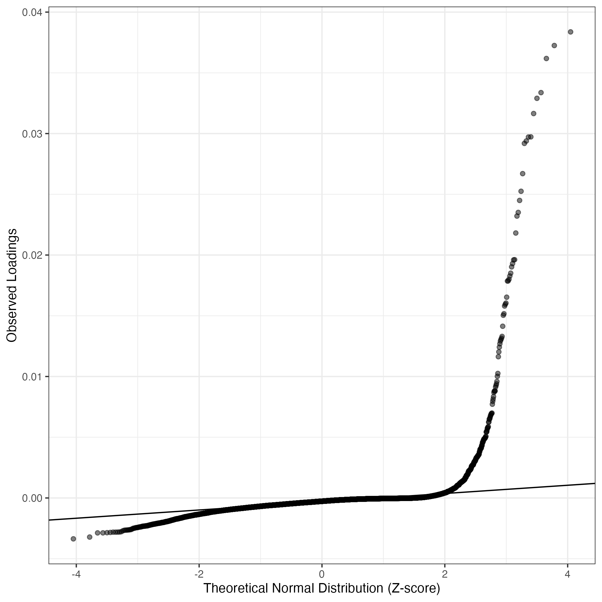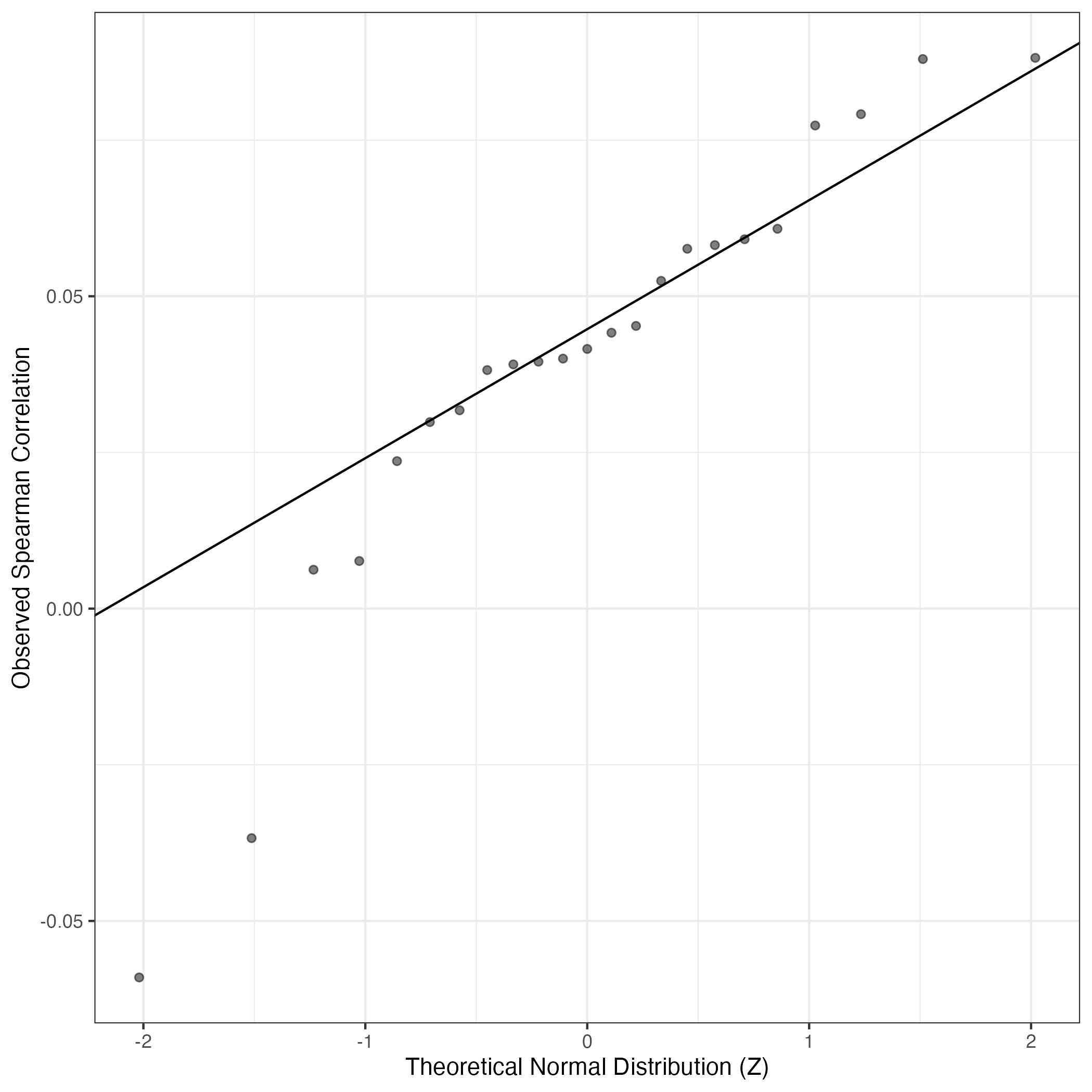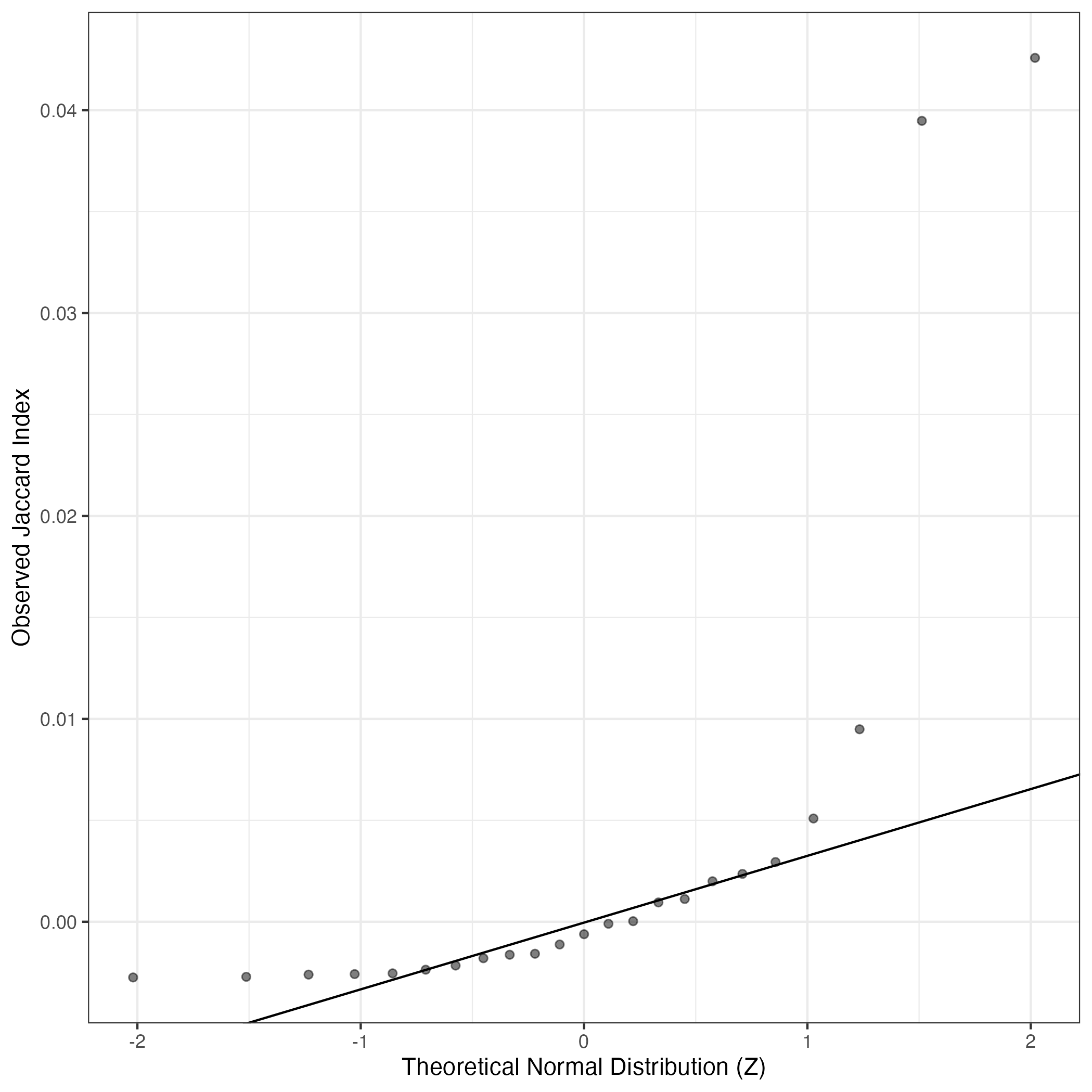 A similar QQ-plot as above, but only for instances where the H value is e.g. > 25, i.e. we are confident that the expression program is active above noise. Agreemenet between these binary vectors is tested using the Jaccard Index, with the P-values calculated by an exact test:
