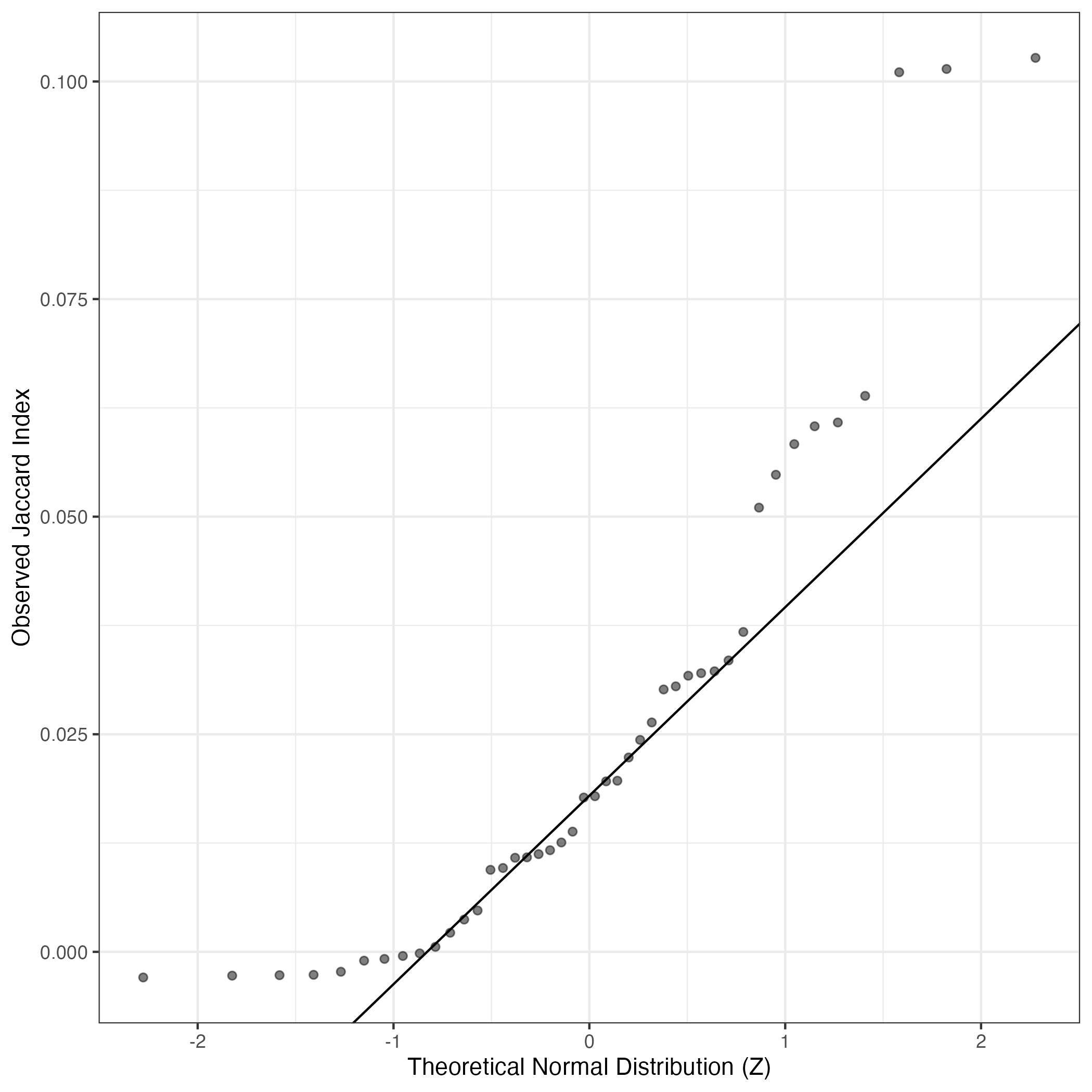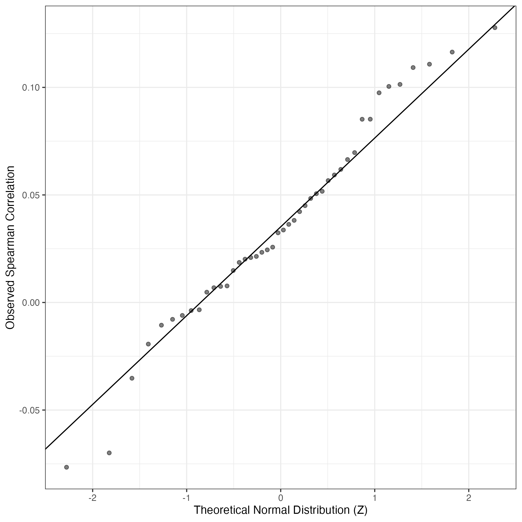 QQ-plot of gene loadings, averaged over both independent splits of the data