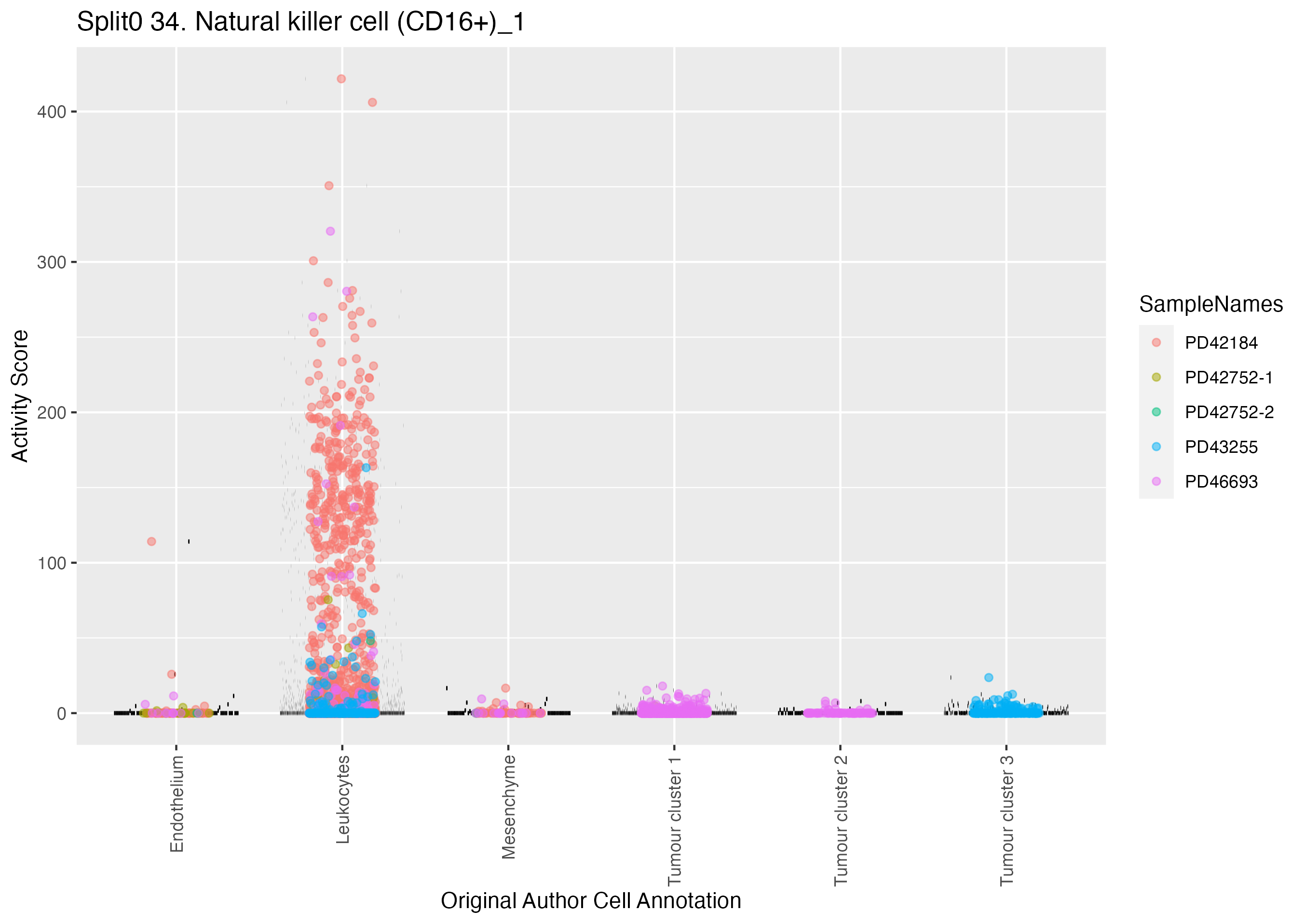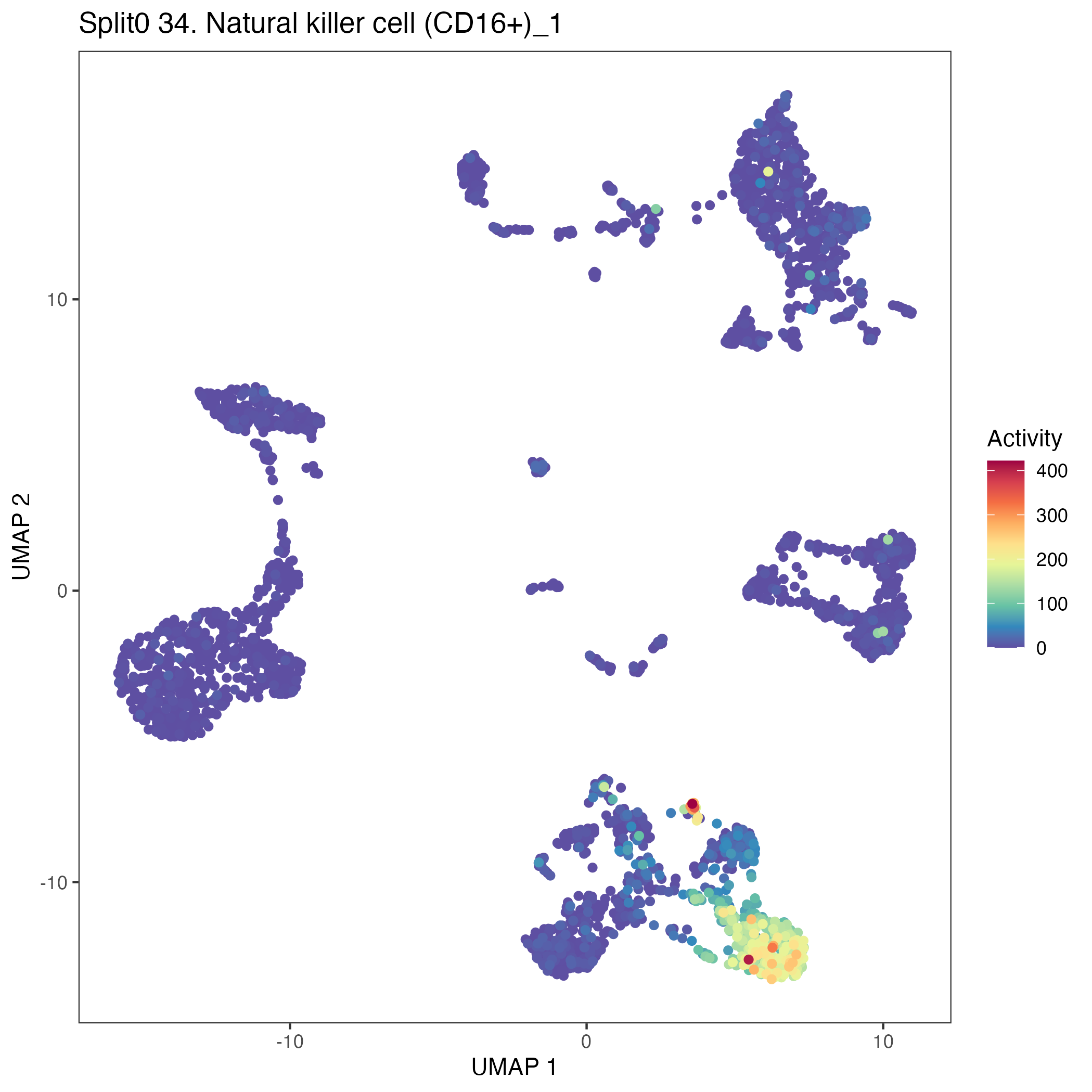 Cycling cells: Cycling NK cells (model markers) proliferating natural killer cells: Wilcoxon ranksum test P-value for gene set overrepresentation: 7.02e-01 Mean rank of genes in gene set: 7629.5 Rank on gene expression program of genes in gene set: