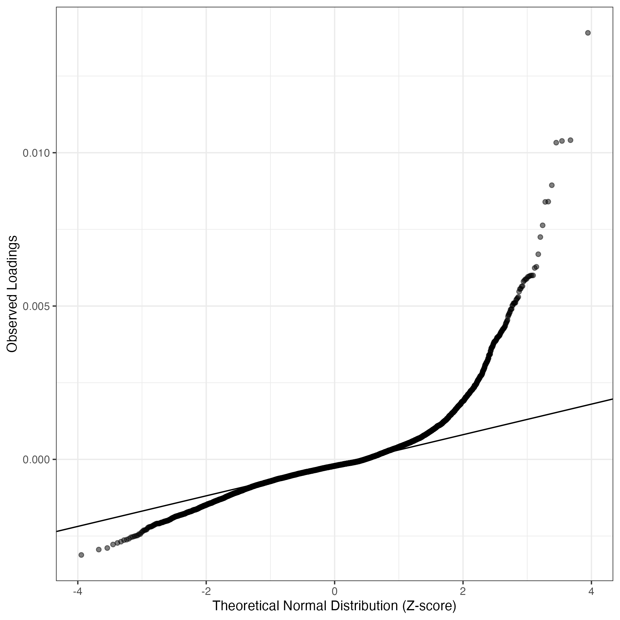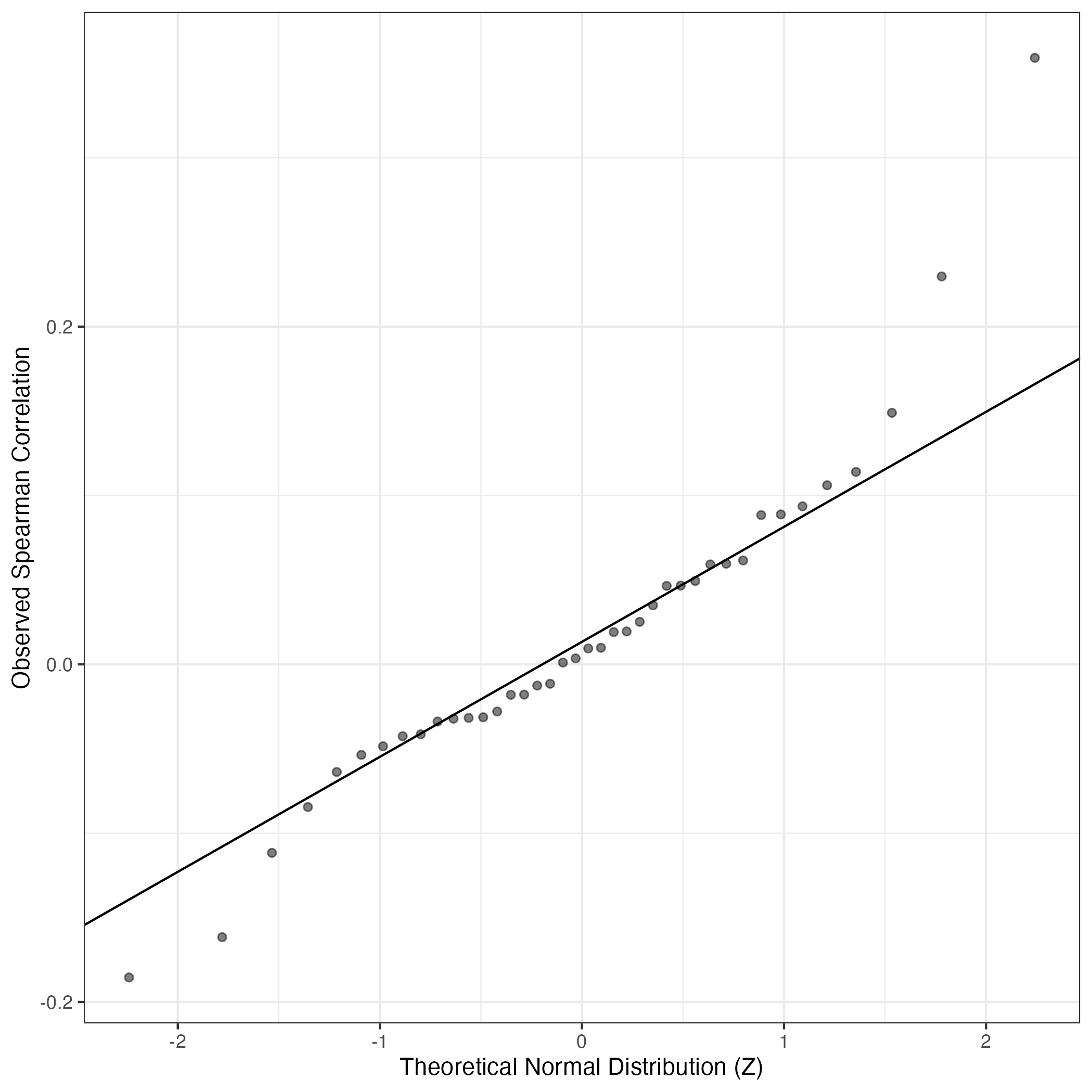 A similar QQ-plot as above, but only for instances where the H value is e.g. > 25, i.e. we are confident that the expression program is active above noise. Agreemenet between these binary vectors is tested using the Jaccard Index, with the P-values calculated by an exact test: