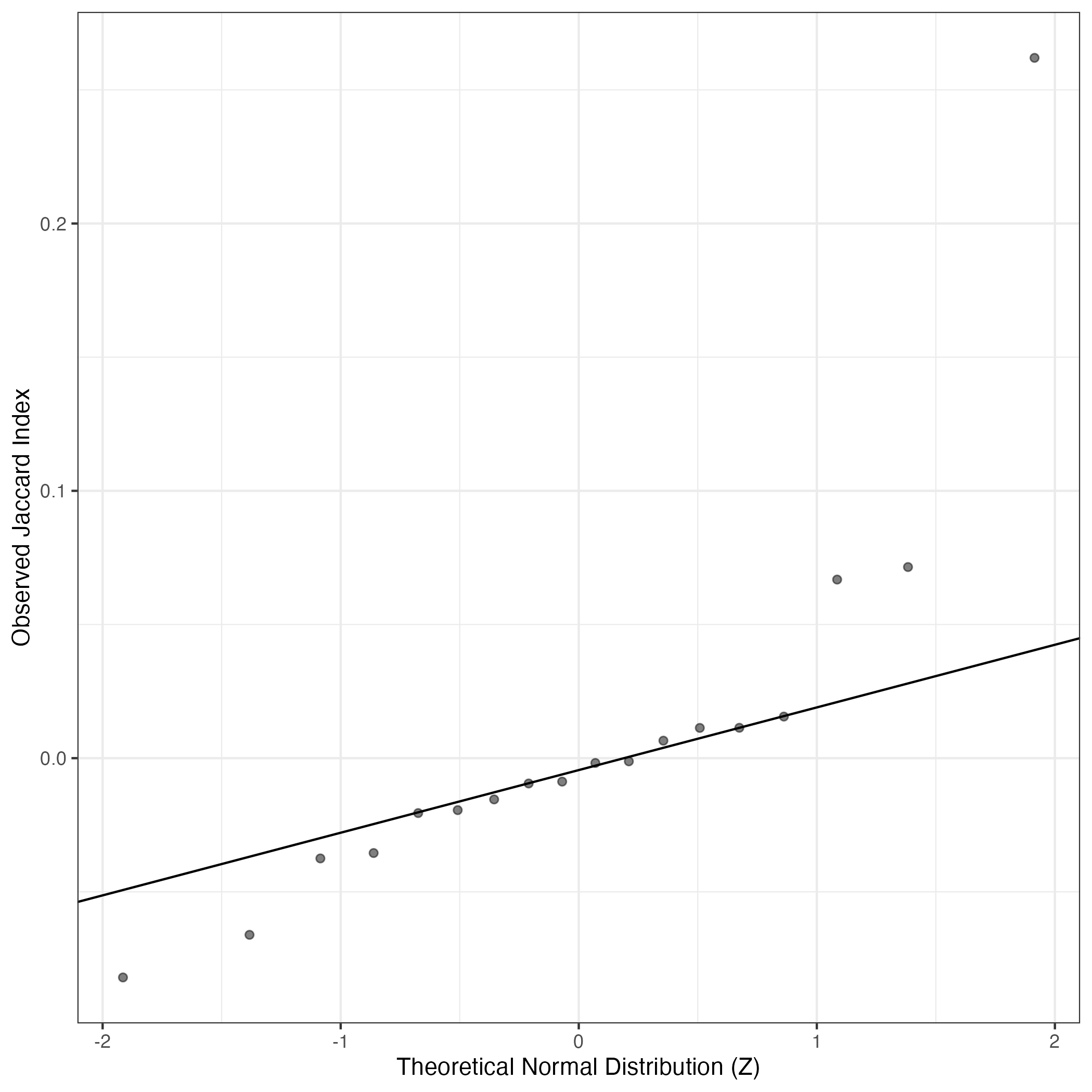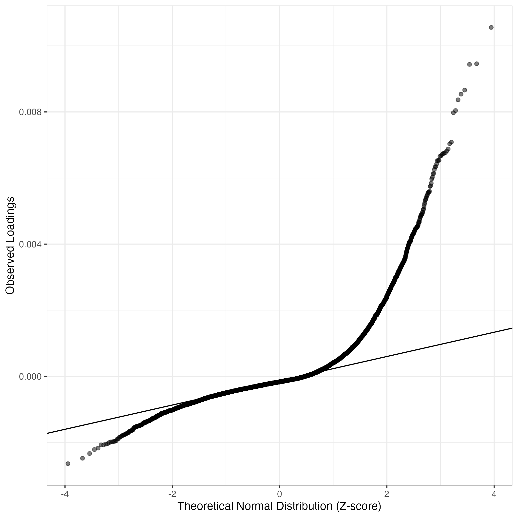 QQ-plot of gene loadings, averaged over both independent splits of the data